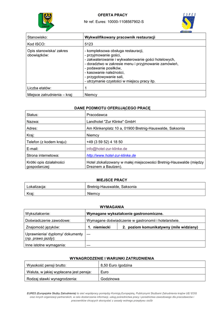 OFERTA PRACY Nr ref. Eures: 10000-1108567902-S Stanowisko: Wykwalifikowany pracownik restauracji Kod ISCO: 5123 Opis stanowiska/ zakres obowiązków: - kompleksowa obsługa restauracji, - przyjmowanie gości, - zakwaterowanie i wykwaterowanie gości hotelowych, - doradztwo w zakresie menu i przyjmowanie zamówień, - podawanie posiłków, - kasowanie należności, - przygotowywanie sali, - utrzymanie czystości w miejscu pracy itp. Liczba etatów: 1 Miejsce zatrudnienia – kraj: Niemcy DANE PODMIOTU OFERUJĄCEGO PRACĘ Status: Pracodawca Nazwa: Landhotel "Zur Klinke" GmbH Adres: Am Klinkenplatz 10 a, 01900 Bretnig-Hauswalde, Saksonia Kraj: Niemcy Telefon (z kodem kraju): +49 (3 59 52) 4 18 50 E-mail: [email protected] Strona internetowa: http://www.hotel-zur-klinke.de Krótki opis działalności gospodarczej: Hotel zlokalizowany w małej miejscowości Bretnig-Hauswalde (między Dreznem a Bautzen). MIEJSCE PRACY Lokalizacja: Bretnig-Hauswalde, Saksonia Kraj: Niemcy WYMAGANIA Wykształcenie: Wymagane wykształcenie gastronomiczne. Doświadczenie zawodowe: Wymagane doświadczenie w gastronomii i hotelarstwie. Znajomość języków: 1. niemiecki Uprawnienia/ dyplomy/ dokumenty (np. prawo jazdy): --- Inne istotne wymagania: --- 2. poziom komunikatywny (mile widziany) WYNAGRODZENIE I WARUNKI ZATRUDNIENIA Wysokość pensji brutto: 8,50 Euro /godzina Waluta, w jakiej wypłacana jest pensja: Euro Rodzaj stawki wynagrodzenia: Godzinowa EURES (Europejskie Służby Zatrudnienia) to sieć współpracy pomiędzy Komisją Europejską, Publicznymi Służbami Zatrudnienia krajów UE/ EOG oraz innych organizacji partnerskich, w celu dostarczania informacji, usług pośrednictwa pracy i poradnictwa zawodowego dla pracodawców i pracowników chcących skorzystać z zasady wolnego przepływu osób Dodatkowe świadczenia: Pracodawca uzgodnienia). zapewnia zakwaterowanie (opłata do Nazwa firmy, z którą zostanie podpisana umowa: Landhotel "Zur Klinke" GmbH Rodzaj umowy: Umowa o pracę Wymiar czasu pracy Pełen etat Czas trwania umowy: Umowa na czas nieokreślony Liczba godzin tygodniowo: 40 Zmiany i praca w dni wolne: Godziny czasu pracy: 16:00 – 23:00, praca w weekendy wg ustalonych na miejscu grafików. Data rozpoczęcia: Od zaraz SPOSÓB SKŁADANIA WNIOSKU Wymagane dokumenty: CV w j. niemieckim, świadectwa Język, w którym muszą być sporządzone przedkładane dokumenty: Niemiecki Do kogo należy wysłać dokumenty: Do pracodawcy Gdzie należy wysłać dokumenty: Na adres e-mail: [email protected] (w tytule e-maila proszę wpisać „Restaurantfachmann/-frau”). Dane teleadresowe doradcy EURES lub przedstawiciela pracodawcy: Pani Schöne, Landhotel +49 (3 59 52) 4 18 50 "Zur Klinke" GmbH, WAŻNOŚĆ Data publikacji: 12.06.2014 Termin przedkładania podań o pracę / zakończenia ważności oferty: Do odwołania UWAGA: 1. Umowa z zagranicznym pracodawcą zostanie zawarta zgodnie z prawem kraju zatrudnienia. Oznacza to, że wszystkie roszczenia odnośnie do warunków, które obejmuje umowa, można kierować wyłącznie do odpowiedniego sądu w kraju zatrudnienia. Publiczne służby zatrudnienia (EURES) nie mogą pośredniczyć ani reprezentować pracownika w sądzie kraju zatrudnienia w przypadku sporu z pracodawcą. 2. Publiczne służby zatrudnienia (EURES) dokładają wszelkich starań, aby zapewnić rzetelność i wiarygodność ofert pracy zgłoszonych w lokalnym urzędzie pracy. Należy wyjaśnić, że oferta pracy została zgłoszona przez stronę trzecią i EURES nie odpowiada za ewentualne rozbieżności między warunkami pracy określonymi w ofercie pracy i warunkami oferowanymi przez potencjalnego pracodawcę. 3. Publiczne służby zatrudnienia (EURES) informują, że będą zbierać, przetwarzać i przekazywać potencjalnym pracodawcom zgodnie z przepisami dotyczącymi ochrony danych osobowych wszystkie dane osobowe dostarczone przez osoby poszukujące pracy. EURES (Europejskie Służby Zatrudnienia) to sieć współpracy pomiędzy Komisją Europejską, Publicznymi Służbami Zatrudnienia krajów UE/ EOG oraz innych organizacji partnerskich, w celu dostarczania informacji, usług pośrednictwa pracy i poradnictwa zawodowego dla pracodawców i pracowników chcących skorzystać z zasady wolnego przepływu osób tel.