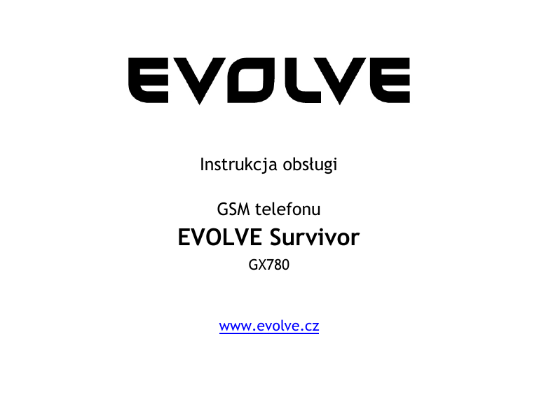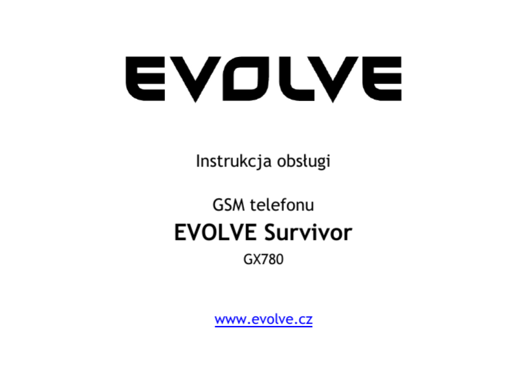 Instrukcja obsługi GSM telefonu EVOLVE Survivor GX780 www.evolve.cz Uwaga To urządzenie zostało wyprodukowane w taki sposób, by spełniać standardy wodooporności IPX4. Nieodpowiednie podłączanie kabla USB, niedomknięta pokrywa baterii lub inne działania niezgodne z instrukcją obsługi mogą mieć wpływ na stopień wodoszczelności a co za tym idzie na szkody spowodowane działaniem wody. W związku z powyższym producent ani żaden z dystrybutorów tego urządzenia nie ponoszą jakiejkolwiek odpowiedzialności za uszkodzenia spowodowane działaniem wody. Nie należy używać telefonu na wolnym powietrzu podczas burzy. Za ewentualne uszkodzenia urządzenia powstałe w skutek tego typu działań nie ponosimy żadnej odpowiedzialności. Latarka i laserowy wskaźnik umieszczone w telefonie mogą być źródłem zranienia. Strumień światła latarki lub lasera skierowany prosto w oczy może spowodować uszkodzenie wzroku, dlatego należy unikać tego typu działań. Latarki i wskaźnika laserowego można używać również w sytuacji, gdy telefon będzie wyłączony z powodu rozładowania się baterii. Dokładność wbudowanych urządzeń pomiarowych zależy od sposobu ich użytkowania. Nie ponosimy odpowiedzialności za różne wyniki pomiarów. Wyskościomierz korzysta z pomiarów barometru. Ze względu na to, że ciśnienie powietrza ulega ciągłym zmianom związanych ze zmianami pogody, zalecane jest kalibrowanie funkcji pomiarowych po każdej wyraźnej zmianie pogody, zmianie wysokości lub przy pierwszym korzystaniu z tych funkcji. Kalibrowanie czytnika pomiarowego ciśnienia powietrza zminimalizuje ewentualne błędy w pomiarach. Po każdorazowym wyjęciu baterii należy skalibrować kompas. Opis użytkowania telefonu komórkowego oraz interfejsu użytkownika może się różnić od niniejszej instrukcji obsługi ze względu na różne wersje firmware oraz specyficzne warunki u każdego z operatorów telefonicznych. Krótkie wprowadzenie Evolve Survivor jest idealnym rozwiązaniem dla osób aktywnych. Na podświetlanym monitorze można zobaczyć informacje o kierunku, wysokości nad poziomem morza, ciśnieniu atmosferycznym i temperaturze. Kompas, ciśnieniomierz i wysokościomierz można przełączać jednym przyciskiem. Wyjątkowo czuły sensor wysokościowy reaguje nawet na podnoszenie lub opuszczenie telefonu reką. Niezależna latarka i wskaźnik laserowy są obsługiwane przez osobne przyciski, które są łatwo dostępne za każdym razem gdy tego potrzebujesz. Z funkcji telefonu komórkowego i funkcji outdoorowych można korzystać niezależnie od siebie. Telefon ma gumowaną powłokę, dzięki której pewnie leży w dłoni i która uniemożliwia jego wyślizgniecie się w czasie deszczu lub przy silnym wietrze. Uwagi dotyczące bezpieczeństwa Telefon jest przystosowany do działania w temperaturze od -20°C do 60°C przy wilgotności powietrza 35% ~ 85%. Nie należy używać telefonu komórkowego w pobliżu telefonu stacjonarnego, telewizora, radia i sprzętu biurowego, ponieważ może dojść do sprzężenia. O ile karta SIM jest wyjęta z telefonu należy trzymać ją z dala od dzieci z powodu ryzyka połknięcia jej przez dziecko. Bateria O ile bateria jest osobno przechowywana należy ją trzymać w chłodnym, przewiewnym i osłoniętym od słońca miejscu. Każda bateria ma swoją własną żywotność. O ile stwierdzisz, że trwałość baterii wyraźnie się pogorszyła w stosunku do trwałości pierwotnej, oznacza to, że jej żywotność się kończy. Należy wymienić ją na nową baterię. Baterii nie należy wyrzucać do śmieci, ale odnieść do odpowiedniego punktu zbiórki zużytych baterii. Ładowarka Nie należy ładować telefonu w następujących sytuacjach: bezpośrednio na słońcu, w temperaturach przekraczających -10°C i 45°C, w wilgotnym lub zakurzonym otoczeniu, przy silnie wibrującym podłożu, w pobliżu urządzeń elektronicznych takich jak telewizor, radio ( mogłoby dojść do zakłóceń w odbiorze obrazu lub dźwięku). Ostrzeżenia dotyczące telefonu Telefon należy wyłączać w samolotach, szpitalach oraz miejscach, gdzie jest zabronione korzystanie z telefonów komórkowych. Telefony komórkowe mogą zakłócać pracę urządzeń elektronicznych i medycznych. O ile nastąpi konieczność użycia telefonu komórkowego w takich sytuacjach należy dostosować się do instrukcji personelu. Telefon Evolve Survivor ma funkcję automatycznego powrotu do poprzednich ustawień. Dlatego należy upewnić się, że nie dojdzie do automatycznego włączenia się urządzenia w miejscach, gdzie korzystanie z niego jest zabronione na przykład na pokładzie samolotu. Należy wyłączać telefon zawsze po wejściu na pokład samolotu by nie doprowadzić do uszkodzenia czułych urządzeń pokładowych i w efekcie do awarii samolotu. By uniknąć zakłóceń elektromagnetycznych i problemów z kompatybilnością należy wyłączać telefon zawsze w miejscach, gdzie obowiązuje zakaz używania telefonów komórkowych. Szpitale i ośrodki zdrowia są wyposażone w czułe urządzenia, które mogą zostać uszkodzone przez obcy sygnał radiowy. Szczególnie tyczy się to takich urządzeń jak: aparaty słuchowe, kardiostymulatory i tym podobne urządzenia, detektory ognia, automatycznie otwierane drzwi i inne urządzenia sterowane elektronicznie. O ile korzystanie z telefonu zakłóca pracę kardiostymulatora lub innej aparatury medycznej należy skontaktować się ze sprzedawcą lub producentem takiego urządzenia. Telefon komórkowy może też zakłócać pracę takich sprzętów jak telewizory, radia, komputery. Należy unikać uderzeń bezpośrednio w monitor telefonu. Uderzenie może spowodować uszkodzenie i wyciek ciekłych kryształów. O ile taka substancja dostałaby się do oczu, mogłaby spowodować ślepotę. O ile by doszło do takiej sytuacji należy natychmiast przepłukać oczy, unikać ich tarcia i natychmiast skonsultować si