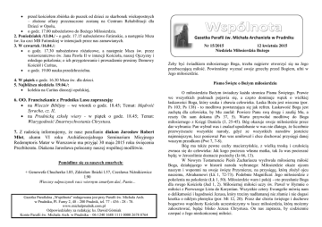 przed kościołem zbiórka do puszek od dzieci ze skarbonek wiekopostnych – złożone ofiary przeznaczone zostaną na Centrum Rehabilitacji dla Dzieci w Opolu, o godz. 17.00 nabożeństwo do Bożego Miłosierdzia. 2. Poniedziałek /13.04./ - o godz. 17.15 nabożeństwo Fatimskie, a następnie Msza św. ku czci MB Fatimskiej w intencjach przez nas zamawianych. 3. W czwartek /16.04./: o godz. 17.30 nabożeństwo różańcowe, a następnie Msza św. przez wstawiennictwo św. Jana Pawła II w intencji Kościoła, naszej Ojczyzny i młodego pokolenia; o ich przygotowanie i prowadzenie prosimy Domowy Kościół i Caritas, o godz. 19.00 nauka przedchrzcielna. 4. W piątek o godz. 16.30 Msza św. dla dzieci. 5. Najbliższa niedziela /19.04./: kolekta na Caritas diecezji opolskiej, 6. OO. Franciszkanie z Prudnika Lasu zapraszają: na Wieczór Biblijny – we wtorek o godz. 18.45; Temat: Mądrość Syracha, cz. II, na Prudnicką szkołę wiary - w piątek o godz. 18.45; Temat: Wiarygodność Zmartwychwstania Chrystusa. 7. Z radością informujemy, że nasz parafianin diakon Jarosław Robert Młot, alumn VI roku Archidiecezjalnego Seminarium Misyjnego Redemptoris Mater w Warszawie ma przyjąć 30 maja 2015 roku święcenia Prezbiteratu. Diakona Jarosława polecamy naszej wspólnej modlitwie. Pomódlmy się za naszych zmarłych: + Genowefa Chucherko l.85, Zdzisław Ilnicki l.57, Czesława Niżnikiewicz l.90 Wieczny odpoczynek racz wiernym zmarłym dać, Panie... Gazetka Parafialna „Wspólnota" redagowana jest przy Parafii św. Michała Arch. w Prudniku, Pl. Farny 2, 48 - 200 Prudnik, tel. 77 - 436 - 28 - 78. www.michalprudnik.com.pl Odpowiedzialny za redakcję: ks. Dawid Górniak Konto Parafii św. Michała Arch. w Prudniku – 06 1240 1688 1111 0000 2678 8764 Wspólnota Gazetka Parafii św. Michała Archanioła w Prudniku Nr 15/2015 12 kwietnia 2015 Niedziela Miłosierdzia Bożego Żeby być świadkiem miłosiernego Boga, trzeba najpierw otworzyć się na Jego przebaczającą miłość. Powinniśmy wyznać swoje grzechy przed Bogiem, ufni w Jego miłosierdzie. Pismo Święte o Bożym miłosierdziu O miłosierdziu Bożym świadczy każda stronica Pisma Świętego. Prawie we wszystkich psalmach pojawia się, a często dominuje wątek o wielkiej łaskawości Boga, który szuka i zbawia człowieka. Łaska Boża jest wieczna (por. Ps 103; Ps 138) - to modlitwa powtarzająca się jak refren. Łaskawość Boga jest zachętą dla człowieka, by Mu zaufał: Powierz Panu swą drogę i zaufaj Mu, a reszty On sam dokona (Ps 37, 5). Warto przywołać modlitwę do Boga miłosiernego z Księgi Daniela (3, 25-45). Bóg okazuje swoje miłosierdzie przez dar wybrania: Pan wybrał was i znalazł upodobanie w was nie dlatego, że liczebnie przewyższacie wszystkie narody, gdyż ze wszystkich narodów jesteście najmniejszym, lecz ponieważ Pan was umiłował i chce dochować przysięgi danej waszym przodkom (Pwt 7, 7-8). Bóg ma także pewne cechy macierzyńskie, z wielką troską i czułością zwraca się do człowieka: Jak kogo pociesza własna matka, tak Ja was pocieszać będę; w Jerozolimie doznacie pociechy (Iz 66, 13). W Nowym Testamencie Pieśń Zachariasza wychwala miłosierną miłość Boga, działającego w historii narodu wybranego: Miłosierdzie okaże ojcom naszym i wspomni na swoje święte Przymierze, na przysięgę, którą złożył ojcu naszemu, Abrahamowi (Łk 1, 72-73). Podobnie Magnificat: Jego miłosierdzie z pokolenia na pokolenie (Łk 1, 50). Miłosierdzie wam i pokój - oto przesłanie Boga dla swego Kościoła (Jud 1, 2). Miłosiernej miłości uczy św. Paweł w Hymnie o miłości z Pierwszego Listu do Koryntian. Wszystkie cztery Ewangelie mówią nam o delikatności i łagodności Jezusa, który trzciny nadłamanej nie złamie i nie dogasi knotka o nikłym płomyku (por. Mt 12, 20). Przez dar chrztu świętego i duchowe bogactwo wspólnoty Kościoła uczestniczymy w łasce miłosierdzia, którą możemy zakosztować, będąc blisko Jezusa Chrystusa. On nas zaprasza, by codziennie czerpać z Jego nieskończonej miłości. Sercem chrześcijańskiej wiary jest Tajemnica Paschalna, o której pisał Jan Paweł II w encyklice Dives in misericor-dia (rozdz. V). Jest to tajemnica miłości ukrzyżowanej. Tak Bóg umiłował świat, że Syna swego Jednorodzonego dał - aż po śmierć na krzyżu (por. J 3, 16). Właśnie w tak dramatyczny sposób miłość Boga okazała się silniejsza od grzechu, lęku, zagubienia i niszczącej śmierci. Dlatego napełnieni nadzieją możemy usłyszeć wezwanie zmartwychwstałego Pana: Przestań się lękać! (Ap 1, 17). Jest przecież z nami Jezus -niezawodny Dawca nadziei. Z chwilą śmierci Jezusa na krzyżu na wzgórzu Golgoty w świecie zwyciężyła miłość, potwierdzona Jego zmartwychwstaniem. Nic więc dziwnego, że pielgrzymi odwiedzający sanktuarium Bożego Miłosierdzia w krakowskich Łagiewnikach pragną zobaczyć kamień węgielny tej świątyni. Został on wzięty z góry Kalwarii w Jerozolimie. Wierni pragną go dotknąć, by osobiście doświadczyć tajemnicy zbawienia płynącego z Jezusowego krzyża. To właśnie na drodze wiodącej na Golgotę i trwając z Maryją pod krzyżem Jej Syna, chrześcijanin uczy się, jak hojnie odpowiedzieć na Bożą miłość. Do serdecznej rozmowy z Ukrzyżowanym Panem zachęca św. Ignacy Loyola w Ćwiczeniach duchownych (53). A Jan Paweł II przypominał nam, że "Krzyż stanowi jakby dotknięcie odwieczną miłością najboleśniejszych ran ziemskiej egzystencji człowieka" (Dives in misericordia, 8). Przesłanie Kościoła Święto Bożego Miłosierdzia rodziło się w blaskach wielkanocnego poranka. Pan Jezus wskazywał pokornej siostrze Faustynie, by w pierwszą niedzielę po Wielkanocy uczcić Boże Miłosierdzie (por. Dzienniczek, 280). Tak też się stało za sprawą polskiego papieża dla dobra całego Kościoła. Wobec Jezusowej miłości "Doznajemy niejako przynaglenia, abyśmy korzystając z