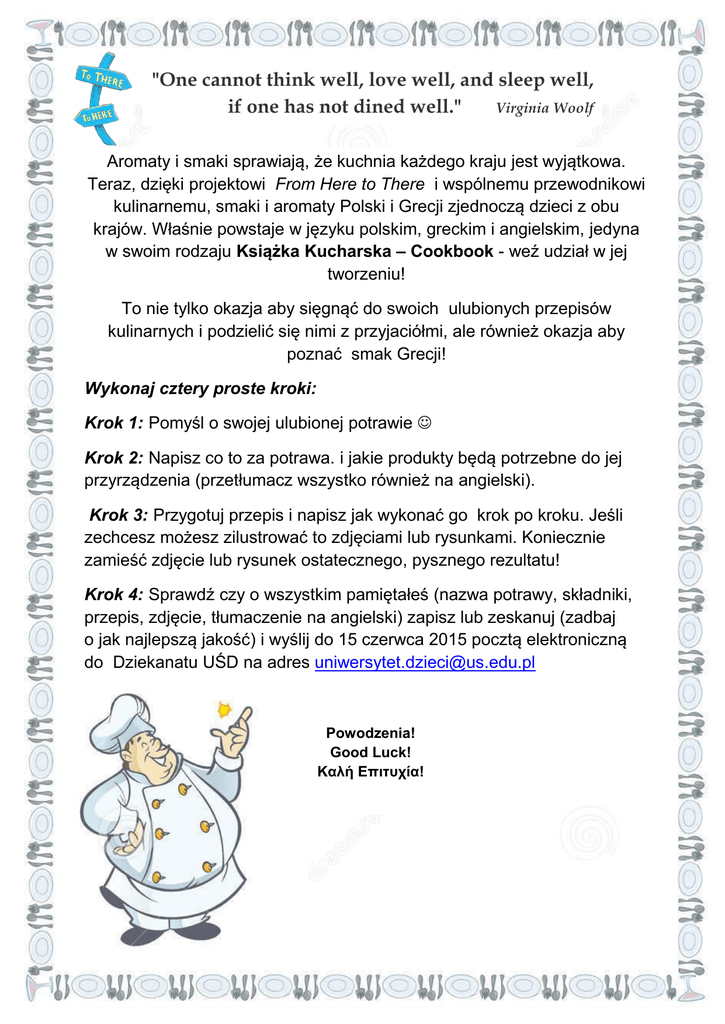 "One cannot think well, love well, and sleep well, if one has not dined well." Virginia Woolf Aromaty i smaki sprawiają, że kuchnia każdego kraju jest wyjątkowa. Teraz, dzięki projektowi From Here to There i wspólnemu przewodnikowi kulinarnemu, smaki i aromaty Polski i Grecji zjednoczą dzieci z obu krajów. Właśnie powstaje w języku polskim, greckim i angielskim, jedyna w swoim rodzaju Książka Kucharska – Cookbook - weź udział w jej tworzeniu! To nie tylko okazja aby sięgnąć do swoich ulubionych przepisów kulinarnych i podzielić się nimi z przyjaciółmi, ale również okazja aby poznać smak Grecji! Wykonaj cztery proste kroki: Krok 1: Pomyśl o swojej ulubionej potrawie Krok 2: Napisz co to za potrawa. i jakie produkty będą potrzebne do jej przyrządzenia (przetłumacz wszystko również na angielski). Krok 3: Przygotuj przepis i napisz jak wykonać go krok po kroku. Jeśli zechcesz możesz zilustrować to zdjęciami lub rysunkami. Koniecznie zamieść zdjęcie lub rysunek ostatecznego, pysznego rezultatu! Krok 4: Sprawdź czy o wszystkim pamiętałeś (nazwa potrawy, składniki, przepis, zdjęcie, tłumaczenie na angielski) zapisz lub zeskanuj (zadbaj o jak najlepszą jakość) i wyślij do 15 czerwca 2015 pocztą elektroniczną do Dziekanatu UŚD na adres [email protected] Powodzenia! Good Luck! Καλή Επιτυχία!