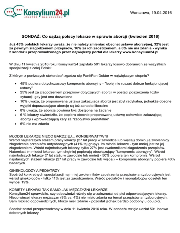 Warszawa, 19.04.2016 SONDAŻ: Co sądzą polscy lekarze w sprawie aborcji (kwiecień 2016) Już 45% polskich lekarzy uważa, że nie należy zmieniać obecnej ustawy aborcyjnej, 32% jest za pewnym złagodzeniem przepisów, 16% za ich zaostrzeniem, a 6% nie ma zdania - wynika z sondażu przeprowadzonego przez największy portal dla lekarzy www.konsylium24.pl W dniu 11 kwietnia 2016 roku Konsylium24 zapytało 501 lekarzy losowo dobranych ze wszystkich specjalizacji z całej Polski: Z którym z poniższych stwierdzeń zgadza się Pani/Pan Doktor w największym stopniu? 45% popiera dotychczasowy kompromis aborcyjny - "lepiej nie ruszać dobrze funkcjonującej ustawy" 25% jest za złagodzeniem przepisów dotyczących aborcji w postaci poszerzenia liczby sytuacji, gdy jest ona dozwolona 10% uważa, że proponowana ustawa zakazująca aborcji jest zbyt radykalna, jednakże obecne wyjątki dopuszczające aborcję są też zanadto liberalne 8% uważa, że aborcja powinna być dostępna na żądanie 6 % lekarzy stwierdziło, że popiera obecnie proponowaną ustawę całkowicie zakazującą aborcji i wprowadzającą kary za "zabójstwo prenatalne" 6% nie ma zdania MŁODSI LEKARZE NIECO BARDZIEJ... KONSERWATYWNI Wśród najstarszych stażem pracy lekarzy (27 lat pracy w zawodzie lub więcej) dominują zwolennicy złagodzenia przepisów antyaborcyjnych (41% tej grupy). Im młodsi lekarze - tym mniej jest za jej złagodzeniem. Wśród najmłodszych lekarzy, tylko 27% jest zwolennikami złagodzenia przepisów. Natomiast im młodsi lekarze, tym chętniej popierają obowiązujący "kompromis aborcyjny". Wśród najmłodszych lekarzy (7 lat stażu w zawodzie lub mniej) - 50% popiera ten kompromis. Wśród najstarszych stażem lekarzy (27 lat pracy w zawodzie lub więcej) – kompromis aborcyjny popiera 40% badanych. GINEKOLODZY A PEDIATRZY Spośród konkretnych specjalizacji najmniej zwolenników zaostrzenia przepisów antyaborcyjnych jest wśród ginekologów - tylko 11% jest za zaostrzeniem. Wśród pediatrów i neonatologów odsetek ten wynosi 19%. KOBIETY LEKARKI TAK SAMO JAK MĘŻCZYŹNI LEKARZE Konsylium24 sprawdziło, czy odpowiedzi różniły się w zależności od płci odpowiadających lekarzy. Nieco więcej lekarzy mężczyzn (9% vs. 4%) nie miało zdania na temat przepisów antyaborcyjnych. Sam rozkład odpowiedzi tych, którzy mieli zdanie - pozostał jednak bardzo podobny u obu płci. Sondaż został przeprowadzony w dniu 11 kwietnia 2016 roku. W sondażu wzięło udział 501 losowo dobranych lekarzy. Poprzednie sondaże przeprowadzane wśród polskich lekarzy oraz szczegóły dotyczące komentarzy do badania oraz zamawiania nowych sondaży znajdują się pod adresem: http://gruparx.com.pl/notes Dodatkowych informacji udziela lekarz Michał Feldman: e-mail: [email protected] tel. +48 502 338 470 www.Konsylium24.pl to największy opiniotwórczy serwis społecznościowy przeznaczony tylko dla lekarzy. Ponad 57 000 lekarzy pomaga sobie nawzajem każdego dnia rozwiązywać kilkadziesiąt problemów najtrudniejszych przypadków klinicznych polskich pacjentów. W serwisie toczą się również żywe dyskusje etyczne i światopoglądowe związane z wykonywaniem zawodu lekarza. Archiwum informacji prasowych