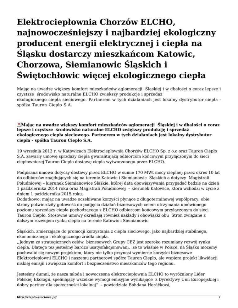 Elektrociepłownia Chorzów ELCHO, najnowocześniejszy i najbardziej ekologiczny producent energii elektrycznej i ciepła na Śląsku dostarczy mieszkańcom Katowic, Chorzowa, Siemianowic Śląskich i Świętochłowic więcej ekologicznego ciepła Mając na uwadze większy komfort mieszkańców aglomeracji Śląskiej i w dbałości o coraz lepsze i czystsze środowisko naturalne ELCHO zwiększy produkcję i sprzedaż ekologicznego ciepła sieciowego. Partnerem w tych działaniach jest lokalny dystrybutor ciepła spółka Tauron Ciepło S.A. Mając na uwadze większy komfort mieszkańców aglomeracji Śląskiej i w dbałości o coraz lepsze i czystsze środowisko naturalne ELCHO zwiększy produkcję i sprzedaż ekologicznego ciepła sieciowego. Partnerem w tych działaniach jest lokalny dystrybutor ciepła - spółka Tauron Ciepło S.A. 19 września 2013 r. w Katowicach Elektrociepłownia Chorzów ELCHO Sp. z o.o oraz Tauron Ciepło S.A. zawarły umowę sprzdaży ciepła gwarantującą odbiorcom końcowym przyłączonym do sieci ciepłowniczej Tauron Ciepło dostawę ciepła wytworzonego przez ELCHO. Podpisana umowa dotyczy dostawy przez ELCHO w sumie 170 MWt mocy cieplnej przez okres 10 lat do odbiorców znajdujących się na terenie Katowic i Siemianowic Śląskich a dotyczy Magistrali Południowej – kierunek Siemianowice Śląskie, której data obowiązywania przypadać będzie na dzień 1 października 2014 roku oraz Magistrali Południowej – kierunek Katowice, ktora wchodzi w życie z dniem 1 października 2015 roku. Dodatkowo, mając na uwadze oczekiwane korzyści płynące z długoterminowej współpracy, obie strony potwierdziły gotowość do podjęcia działań biznesowych celem utrzymania umówionego poziomu sprzedaży ciepła pochodzącego z ELCHO odbiorcom końcowym przyłączonym do sieci Tauron Ciepło. Stosowne umowy określają również nakłady i obowiązki obu Stron związane z dalszym rozwojem rynku ciepła na terenie Katowic i Siemianowic Śląskich, zmierzające do promocji korzystania z ciepła sieciowego, jako najbardziej stabilnego, ekonomicznego i ekologicznego źródła ciepła. ,,Jednym ze strategicznych celów biznesowych Grupy CEZ jest szeroko rozumiany rozwój rynku ciepła. Dlatego też jesteśmy bardzo usatysfakcjonowani, że to właśnie w Polsce, na Śląsku możemy pochwalić się nowym projektem, który nie tylko przynosi wymierne korzyści biznesowe Elektrociepłowni ELCHO i naszemu partnerowi spółce Tauron Ciepło, ale wspiera projekt likwidacji niskiej emisjii i zwiększa komfort i bezpieczeństwo mieszkanców tego regionu. Jesteśmy dumni, że nasza młoda i nowoczesna elektrociepłownia ELCHO to wyróżniony Lider Polskiej Ekologii, spełniający wszelkie wymogi emisyjne wynikające z Dyrektywy Unii Europejskiej i dobry partner dla społeczności lokalnej“ – powiedziała Bohdana Horáčková, http://cieplo-sieciowe.pl/ 1 Prezes Zarządu, Dyrektor Generalny CEZ Polska *** Elektrociepłownia „ELCHO” to jedna z najnowocześniejszych jednostek produkcyjnych w Polsce wybudowana celem odtworzenia mocy produkcyjnej Elektrowni Chorzów S.A. ELCHO jest jednym z dwóch największych dostawców ciepła dla lokalnego dystrybutora Tauron Ciepło S.A. w Katowicach, zaopatrującego miasta: Katowice, Chorzów, Świętochłowice i Siemianowice Śląskie. Produkcja ciepła w elektrociepłowni pokrywa około 35% zapotrzebowania w tym systemie ciepłowniczym.Moc osiągalna Elektrociepłowni Chorzów "ELCHO" Sp. z o.o. wynosi 208 MW (netto) mocy elektrycznej i 500 MW mocy cieplnej wytwarzanej w 2 blokach składających się z cyrkulacyjnego kotła fluidalnego (CFB) i parowego turbozespołu kondensacyjno-upustowego. Elektrociepłownia Chorzów „Elcho“, ul. Marii Sklodowskiej - Curie 30, 41-503 Chorzów tel. 32 771 40 01 Rzecznik prasowy: Sebastian Włodarski email: [email protected], tel. 0048 500 236 150 http://cieplo-sieciowe.pl/ 2