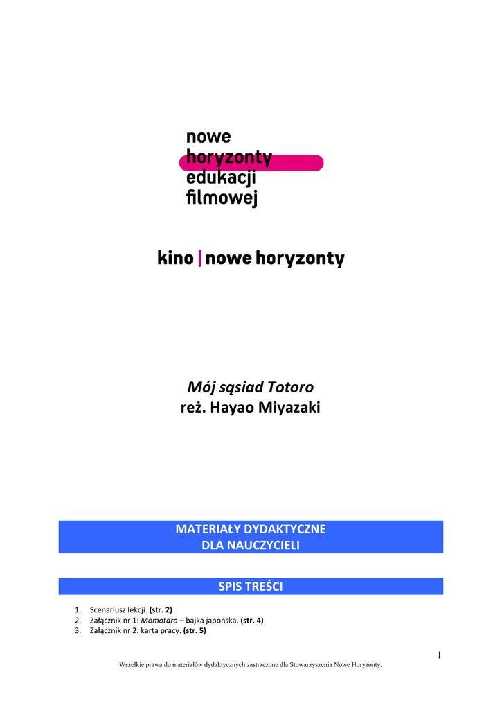Mój sąsiad Totoro reż. Hayao Miyazaki MATERIAŁY DYDAKTYCZNE DLA NAUCZYCIELI SPIS TREŚCI 1. 2. 3. Scenariusz lekcji. (str. 2) Załącznik nr 1: Momotaro – bajka japooska. (str. 4) Załącznik nr 2: karta pracy. (str. 5) 1 Wszelkie prawa do materiałów dydaktycznych zastrzeżone dla Stowarzyszenia Nowe Horyzonty. SCENARIUSZ LEKCJI Opracowała: Kamila Gut Temat: Wyprawa do Kraju Kwitnącej Wiśni. CELE LEKCJI Po lekcji uczeo powinien: posiadad podstawowe informacje na temat Japonii; znad kulturę Japonii; znad znaczenie słów gejsza i samuraj; wykazywad się postawą tolerancji wobec różnorodności; odnajdywad podobieostwa i akceptowad różnice wynikające z różnorodności kulturowej. METODY I FORMY PRACY rozmowa karty pracy czytanka zajęcia manualne ŚRODKI DYDAKTYCZNE Mój sąsiad Totoro, reż. Hayao Miyazaki, Japonia, USA 1988 tekst czytanki/bajki (załącznik 1) karta pracy (załącznik 2) CZAS 1 - 2 godziny lekcyjne PRZEBIEG LEKCJI 1. Rozmowa: Swobodna rozmowa o filmie. Nauczyciel pyta, co dzieci zapamiętały z filmu, co wiedzą o Japonii, dlaczego Japonię nazywamy krajem kwitnącej wiśni. 2. Czytanka Momotaro: Nauczyciel wraz z uczniami czyta tekst bajki (załącznik 1). 3. Kalambury: Poznajemy japooskie przysłowia – zabawa w kalambury. Dzieci mogą pokazywad, bądź rysowad hasła. Nie pójdzie się do przodu bez schylenia karku. Śpiesz się powoli. 2 Wszelkie prawa do materiałów dydaktycznych zastrzeżone dla Stowarzyszenia Nowe Horyzonty. Jak ślepiec bez laski. Kto dużo i szybko je, szybko i dużo pracuje. Ściany mają uszy, kamienie mogą mówid. Co dwie głowy to nie jedna Po kalamburach nauczyciel pyta, które z przysłów dzieci już znają, które mają swoje odpowiedniki w języku polskim, a które są podobne oraz co znaczą poszczególne przysłowia? 4. Karta pracy: Nauczyciel rozdaje karty pracy i prosi o wykonanie dwiczeo (załącznik 2). 5. Orgiami: Lekcję można zakooczyd wykonaniem origami. 3 Wszelkie prawa do materiałów dydaktycznych zastrzeżone dla Stowarzyszenia Nowe Horyzonty. ZAŁĄCZNIK 1: Momotaro – bajka japońska Dawno, dawno temu w pewnej wiosce żyli staruszek i staruszka. Pewnego dnia staruszek udał się w góry zbierad chrust, a staruszka poszła nad potok prad. Kiedy prała, zobaczyła płynącą z nurtem wody dużą brzoskwinię. Staruszka wyłowiła owoc i delikatnie trzymając przyniosła do domu. Gdy staruszek wrócił z gór, ujrzawszy brzoskwinię zdziwił się. Głaskając ją rzekł: - Jaka wielka brzoskwinia! - Przetnij ją na pół - zaproponowała staruszka. Staruszek odrzekł: - Dobrze zróbmy to. I położyli brzoskwinię na desce. Kiedy staruszka chciała przekroid ją nożem, nagle owoc poruszył się. Wydało im się, że brzoskwinia żyje, gdyż po chwili sama przepołowiła się i ze środka wyskoczył mały chłopczyk. Staruszkowie przestraszyli się. Zdumienie ich było większe, gdy zobaczyli, że chłopczyk jest rześki i żarłocznie je. Staruszkowie byli bardzo szczęśliwi i nazwali go Momotaro. Im więcej chłopiec jadł, tym bardziej rósł i stawał się nadzwyczaj silnym dzieckiem. Jedynym zmartwieniem staruszków było to, że mimo ich starao Momotaro nic nie mówił. Staruszkowie uśmiechali się do niego, ale malec nie odwzajemniał ich uśmiechów. Czas upływał, a Momotaro nie zmieniał się. Nagle któregoś dnia chłopczyk głośno oznajmił: - Idę walczyd ze strasznymi potworami - Oni. Słysząc to staruszkowie przerazili się. Mimo to Momotaro nalegał, aby przygotowali go do drogi, nie bacząc na błagania staruszki. Owego czasu w wiosce często pojawiały się wielkie potwory Oni. Porywały ludzi, kradły i robiły wiele złego. Wszystko to bardzo męczyło wieśniaków. Momotaro, kiedy się o tym dowiedział, nie mógł już dłużej tego znieśd i postanowił rozprawid się z Oni. Staruszkowie zgodzili się uszyd dla chłopca kimono i przygotowad mu jedzenie na drogę. Wreszcie nastał dzieo rozstania. Momotaro ubrany był w nowo uszyte kimono i miał ze sobą ciasteczka ryżowe upieczone przez staruszkę. Momotaro rzekł do zasmuconych staruszków: - Bądźcie zdrowi - i ruszył w drogę. Staruszkowie płacząc żegnali go słowami: - Wracaj cały i zdrów. W czasie swej wędrówki Momotaro napotkał psa, który zaproponował mu: - Mogę byd twoim pomocnikiem, jeśli dasz mi ciasteczko ryżowe. Pies dostał to, o co prosił i w ten sposób stał się nieodłącznym towarzyszem Memotaro. Szli dalej razem, a po drodze spotkali małpę, która otrzymawszy ciasteczko ryżowe przyłączyła się do nich. Następnie spotkali bażanta, który w zamian za ciasteczko przystał do ich trójki. Momotaro wraz z nowymi przyjaciółmi wędrował przez wioski, góry, lasy aż dotarł do morza. Weszli do łódki i odpłynęli. Po kilku dniach ujrzeli na horyzoncie wyspę, na której zamieszkali Oni. Urwiste brzegi wyspy sterczały spośród fal. Momotaro wysłał bażanta na zwiady. Gdy reszta dobiła do brzegu, bażant powrócił z wiadomością, że potwory ucztują. - Dalejże na nich! - wykrzyknął Momotaro. Wszyscy pobiegli do wysokiej i masywnej bramy, która niestety była zamknięta. Wtedy małpa rzekła: - Przeskoczę tę bramę, dla mnie to nic trudnego. Po chwili otworzyła bramę od środka i wszyscy weszli. Na ich widok pijane potwory osłupiały. Momotaro rzekł do nich: - Już ja się z wami rozprawię - i natychmiast rzucił się na Oni z mieczem, a zwierzęta dzielnie go wspomagały: pies gryzł, małpa drapała, bażant dziobał. Potwory w popłochu rozbiegły się na wszystkie strony. Nagle rozległ się głos: - Teraz ja się z tobą zmierzę - był to wódz, najgroźniejszy z potworów. Uderzył chłopca w głowę grubą, żelazną maczugą, a maczuga złamała się. Wtedy Momotaro podskoczył i swoją głową rąbnął wodza w jego wielki łeb. Oni runął na ziemię. Momotaro krzyknął: - Nie będziecie czynili więcej zła ludziom w naszej wiosce. Wódz odpowiedział: