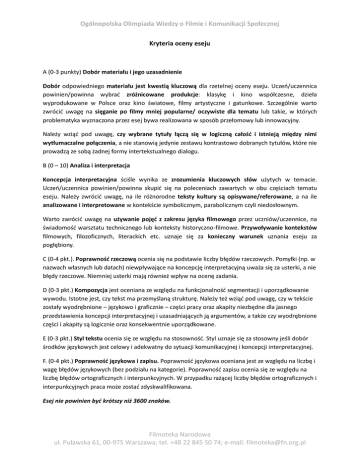 Ogólnopolska Olimpiada Wiedzy o Filmie i Komunikacji Społecznej Kryteria oceny eseju A (0-3 punkty) Dobór materiału i jego uzasadnienie Dobór odpowiedniego materiału jest kwestią kluczową dla rzetelnej oceny eseju. Uczeń/uczennica powinien/powinna wybrać zróżnicowane produkcje: klasykę i kino współczesne, dzieła wyprodukowane w Polsce oraz kino światowe, filmy artystyczne i gatunkowe. Szczególnie warto zwrócić uwagę na sięganie po filmy mniej popularne/ oczywiste dla tematu lub takie, w których problematyka wyznaczona przez esej bywa realizowana w sposób przełomowy lub innowacyjny. Należy wziąć pod uwagę, czy wybrane tytuły łączą się w logiczną całość i istnieją między nimi wytłumaczalne połączenia, a nie stanowią jedynie zestawu kontrastowo dobranych tytułów, które nie prowadzą ze sobą żadnej formy intertekstualnego dialogu. B (0 – 10) Analiza i interpretacja Koncepcja interpretacyjna ściśle wynika ze zrozumienia kluczowych słów użytych w temacie. Uczeń/uczennica powinien/powinna skupić się na poleceniach zawartych w obu częściach tematu eseju. Należy zwrócić uwagę, na ile różnorodne teksty kultury są opisywane/referowane, a na ile analizowane i interpretowane w kontekście symbolicznym, parabolicznym czyli niedosłownym. Warto zwrócić uwagę na używanie pojęć z zakresu języka filmowego przez uczniów/uczennice, na świadomość warsztatu technicznego lub konteksty historyczno-filmowe. Przywoływanie kontekstów filmowych, filozoficznych, literackich etc. uznaje się za konieczny warunek uznania eseju za pogłębiony. C (0-4 pkt.). Poprawność rzeczową ocenia się na podstawie liczby błędów rzeczowych. Pomyłki (np. w nazwach własnych lub datach) niewpływające na koncepcję interpretacyjną uważa się za usterki, a nie błędy rzeczowe. Niemniej usterki mają również wpływ na ocenę zadania. D (0-3 pkt.) Kompozycja jest oceniana ze względu na funkcjonalność segmentacji i uporządkowanie wywodu. Istotne jest, czy tekst ma przemyślaną strukturę. Należy też wziąć pod uwagę, czy w tekście zostały wyodrębnione – językowo i graficznie – części pracy oraz akapity niezbędne dla jasnego przedstawienia koncepcji interpretacyjnej i uzasadniających ją argumentów, a także czy wyodrębnione części i akapity są logicznie oraz konsekwentnie uporządkowane. E (0-3 pkt.) Styl tekstu ocenia się ze względu na stosowność. Styl uznaje się za stosowny jeśli dobór środków językowych jest celowy i adekwatny do sytuacji komunikacyjnej i koncepcji interpretacyjnej. F. (0-4 pkt.) Poprawność językowa i zapisu. Poprawność językowa oceniana jest ze względu na liczbę i wagę błędów językowych (bez podziału na kategorie). Poprawność zapisu ocenia się ze względu na liczbę błędów ortograficznych i interpunkcyjnych. W przypadku rażącej liczby błędów ortograficznych i interpunkcyjnych praca może zostać zdyskwalifikowana. Esej nie powinien być krótszy niż 3600 znaków. Filmoteka Narodowa ul. Puławska 61, 00-975 Warszawa; tel. +48 22 845 50 74; e-mail: [email protected]