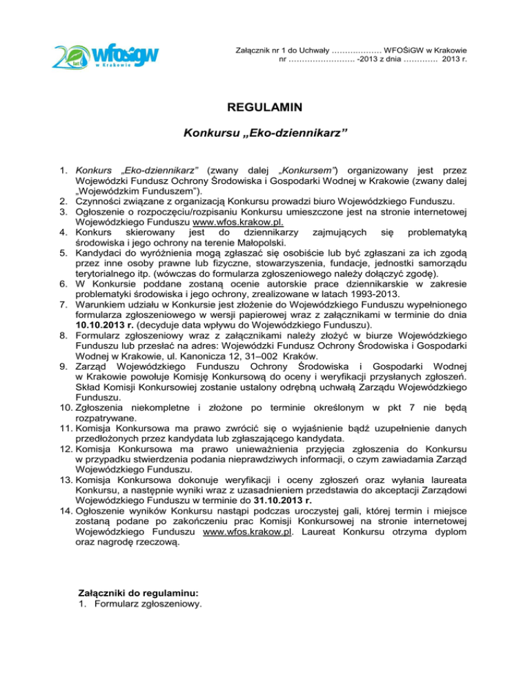 Załącznik nr 1 do Uchwały ……….……… WFOŚiGW w Krakowie nr ……………………. -2013 z dnia …………. 2013 r. REGULAMIN Konkursu „Eko-dziennikarz” 1. Konkurs „Eko-dziennikarz” (zwany dalej „Konkursem”) organizowany jest przez Wojewódzki Fundusz Ochrony Środowiska i Gospodarki Wodnej w Krakowie (zwany dalej „Wojewódzkim Funduszem”). 2. Czynności związane z organizacją Konkursu prowadzi biuro Wojewódzkiego Funduszu. 3. Ogłoszenie o rozpoczęciu/rozpisaniu Konkursu umieszczone jest na stronie internetowej Wojewódzkiego Funduszu www.wfos.krakow.pl. 4. Konkurs skierowany jest do dziennikarzy zajmujących się problematyką środowiska i jego ochrony na terenie Małopolski. 5. Kandydaci do wyróżnienia mogą zgłaszać się osobiście lub być zgłaszani za ich zgodą przez inne osoby prawne lub fizyczne, stowarzyszenia, fundacje, jednostki samorządu terytorialnego itp. (wówczas do formularza zgłoszeniowego należy dołączyć zgodę). 6. W Konkursie poddane zostaną ocenie autorskie prace dziennikarskie w zakresie problematyki środowiska i jego ochrony, zrealizowane w latach 1993-2013. 7. Warunkiem udziału w Konkursie jest złożenie do Wojewódzkiego Funduszu wypełnionego formularza zgłoszeniowego w wersji papierowej wraz z załącznikami w terminie do dnia 10.10.2013 r. (decyduje data wpływu do Wojewódzkiego Funduszu). 8. Formularz zgłoszeniowy wraz z załącznikami należy złożyć w biurze Wojewódzkiego Funduszu lub przesłać na adres: Wojewódzki Fundusz Ochrony Środowiska i Gospodarki Wodnej w Krakowie, ul. Kanonicza 12, 31–002 Kraków. 9. Zarząd Wojewódzkiego Funduszu Ochrony Środowiska i Gospodarki Wodnej w Krakowie powołuje Komisję Konkursową do oceny i weryfikacji przysłanych zgłoszeń. Skład Komisji Konkursowiej zostanie ustalony odrębną uchwałą Zarządu Wojewódzkiego Funduszu. 10. Zgłoszenia niekompletne i złożone po terminie określonym w pkt 7 nie będą rozpatrywane. 11. Komisja Konkursowa ma prawo zwrócić się o wyjaśnienie bądź uzupełnienie danych przedłożonych przez kandydata lub zgłaszającego kandydata. 12. Komisja Konkursowa ma prawo unieważnienia przyjęcia zgłoszenia do Konkursu w przypadku stwierdzenia podania nieprawdziwych informacji, o czym zawiadamia Zarząd Wojewódzkiego Funduszu. 13. Komisja Konkursowa dokonuje weryfikacji i oceny zgłoszeń oraz wyłania laureata Konkursu, a następnie wyniki wraz z uzasadnieniem przedstawia do akceptacji Zarządowi Wojewódzkiego Funduszu w terminie do 31.10.2013 r. 14. Ogłoszenie wyników Konkursu nastąpi podczas uroczystej gali, której termin i miejsce zostaną podane po zakończeniu prac Komisji Konkursowej na stronie internetowej Wojewódzkiego Funduszu www.wfos.krakow.pl. Laureat Konkursu otrzyma dyplom oraz nagrodę rzeczową. Załączniki do regulaminu: 1. Formularz zgłoszeniowy.