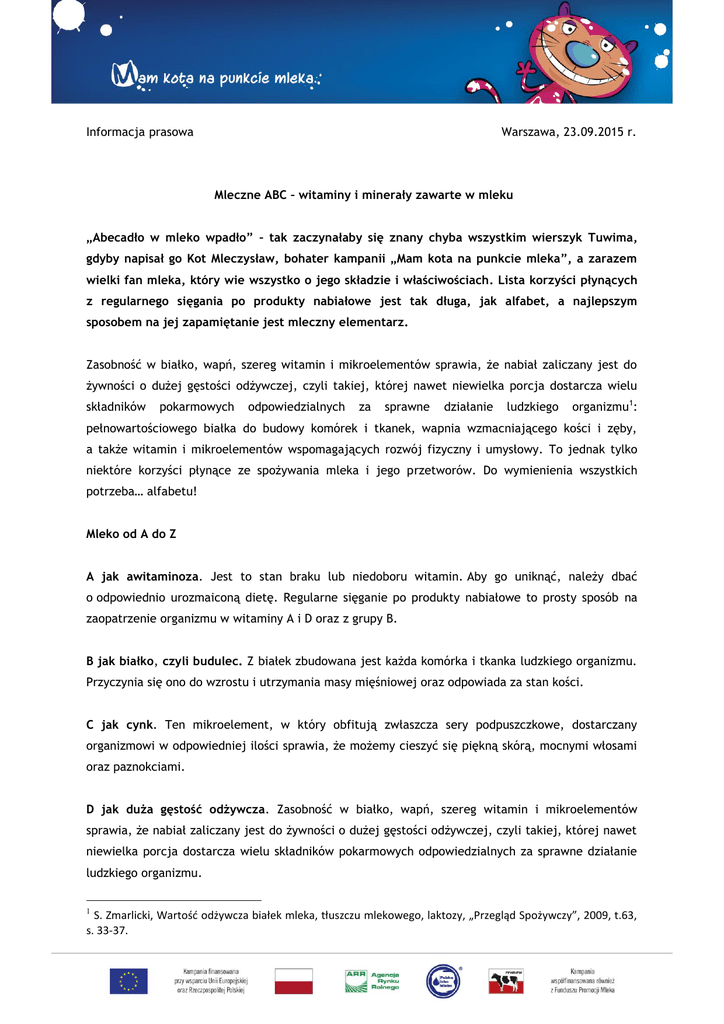 Informacja prasowa Warszawa, 23.09.2015 r. Mleczne ABC – witaminy i minerały zawarte w mleku „Abecadło w mleko wpadło” – tak zaczynałaby się znany chyba wszystkim wierszyk Tuwima, gdyby napisał go Kot Mleczysław, bohater kampanii „Mam kota na punkcie mleka”, a zarazem wielki fan mleka, który wie wszystko o jego składzie i właściwościach. Lista korzyści płynących z regularnego sięgania po produkty nabiałowe jest tak długa, jak alfabet, a najlepszym sposobem na jej zapamiętanie jest mleczny elementarz. Zasobność w białko, wapń, szereg witamin i mikroelementów sprawia, że nabiał zaliczany jest do żywności o dużej gęstości odżywczej, czyli takiej, której nawet niewielka porcja dostarcza wielu składników pokarmowych odpowiedzialnych za sprawne działanie ludzkiego organizmu1: pełnowartościowego białka do budowy komórek i tkanek, wapnia wzmacniającego kości i zęby, a także witamin i mikroelementów wspomagających rozwój fizyczny i umysłowy. To jednak tylko niektóre korzyści płynące ze spożywania mleka i jego przetworów. Do wymienienia wszystkich potrzeba… alfabetu! Mleko od A do Z A jak awitaminoza. Jest to stan braku lub niedoboru witamin. Aby go uniknąć, należy dbać o odpowiednio urozmaiconą dietę. Regularne sięganie po produkty nabiałowe to prosty sposób na zaopatrzenie organizmu w witaminy A i D oraz z grupy B. B jak białko, czyli budulec. Z białek zbudowana jest każda komórka i tkanka ludzkiego organizmu. Przyczynia się ono do wzrostu i utrzymania masy mięśniowej oraz odpowiada za stan kości. C jak cynk. Ten mikroelement, w który obfitują zwłaszcza sery podpuszczkowe, dostarczany organizmowi w odpowiedniej ilości sprawia, że możemy cieszyć się piękną skórą, mocnymi włosami oraz paznokciami. D jak duża gęstość odżywcza. Zasobność w białko, wapń, szereg witamin i mikroelementów sprawia, że nabiał zaliczany jest do żywności o dużej gęstości odżywczej, czyli takiej, której nawet niewielka porcja dostarcza wielu składników pokarmowych odpowiedzialnych za sprawne działanie ludzkiego organizmu. 1 S. Zmarlicki, Wartość odżywcza białek mleka, tłuszczu mlekowego, laktozy, „Przegląd Spożywczy”, 2009, t.63, s. 33-37. E jak energia. Dobrze zbilansowana dieta, uwzględniająca 3-4 porcje produktów nabiałowych dziennie, nie pokrywa zapotrzebowanie organizmu na niezbędne do jego funkcjonowania witaminy i minerały, ale sprawia także, że mamy wystarczająco dużo energii na codzienne aktywności. F jak funkcje poznawcze. Jod i cynk, którego źródłem są przetwory mleczne, pomagają w utrzymaniu prawidłowych funkcji poznawczych. G jak geniusz. Czy Nagroda Nobla, przyznawana najgenialniejszym umysłom, może mieć coś wspólnego z mlekiem? Okazuje się, że tak! Związek ten prześledzili szczegółowo badacze, dowodząc, że kraje, w których spożywa się dużo mleka, mogą pochwalić się największą liczbą noblistów. H jak hormony. Zawarty w mleku cynk pomaga w utrzymaniu odpowiedniego poziomu testosteronu we krwi, a jod jest potrzebny do prawidłowej produkcji hormonów tarczycy. I jak inteligencja. Witamina B2, B12 i jod odpowiadają za prawidłowe funkcjonowanie układu nerwowego oraz przekaźnictwo impulsów nerwowych, co wpływa na pracę mózgu, a tym samym na sprawny przebieg takich procesów umysłowych, takich jak myślenie, kojarzenie czy pamięć. J jak jod. Reguluje działanie układu nerwowego, hormonalnego i funkcje poznawcze. Przyczynia się także do prawidłowego wzrostu dzieci. K jak kości. Szkielet dorosłego człowieka składa się z 206 kości, które wraz z mięśniami i ścięgnami tworzą skomplikowaną konstrukcję umożliwiającą wykonywanie ruchów. Mocne kości to zasługa diety bogatej w białko, wapń i witaminę D. L jak laktoza. To zawarty w mleku cukier, który w procesie fermentacji jest rozkładany przez bakterie. Powstaje wówczas kwas mlekowy, dzięki czemu fermentowane produkty mleczne, np. kefir czy maślankę, mogą spożywać osoby z nietolerancją laktozy. Ł jak łatwa przyswajalność. Są takie pary składników pokarmowych, które wzajemnie ułatwiają swoje przyswajanie. W przypadku nabiału obecny w nim tłuszcz wpływa na lepszą przyswajalność witamin A i D, zaś dzięki witaminie D łatwiej przyswajany jest wapń. M jak mięśnie. Ruch, panowanie nad ciałem, a także wyprostowana postawa to zasługa mięśni. Do ich rozwoju i prawidłowego działania niezbędne są białko oraz wapń. N jak nerwy. Zawarty w produktach mlecznych jod oraz witaminy B2 i B12 pomagają w prawidłowym funkcjonowaniu układu nerwowego, zaś wapń wspomaga przekaźnictwo nerwowe. O jak odporność. Najogólniej mówiąc jest to zdolność organizmu do ochrony przed działaniem niekorzystnych czynników. Gdy spada, łatwo łapiemy infekcje i dłużej się z nich leczymy. Za wspomaganie układu odpornościowego organizmu odpowiadają niektóre witaminy i mikroelementy zawarte w mleku: witamina A, B12, D oraz cynk. P jak przetwory mleczne. To duża rodzina produktów spożywczych, do których wytworzenia zostało wykorzystane mleko. Zaliczamy do niej jogurty, kefiry, maślanki, sery żółte i sery twarogowe. Zawierają one te same cenne składniki odżywcze, witaminy i mikroelementy co mleko. Spożywane zamiennie z mlekiem, świetnie urozmaicają dietę. R jak ryboflawina, czyli witamina B2. Reguluje pracę układu nerwowego oraz funkcjonowanie układu odpornościowego, można więc rzec, że wspiera organizm w walce ze stresem i drobnoustrojami chorobotwórczymi. Oprócz tego pozytywnie wpływa na wzrok, a z dobrym wzrokiem można zobaczyć nawet Drogę Mleczną! S jak skóra. Obecne w mleku witaminy A i B2 oraz cynk i jod służą urodzie, pomagając dbać o skórę. T jak trzy porcje. W trzech szklankach mleka kryje się 800 mg wapnia, czyli dokładnie tyle, ile każdego dnia powinny otrzymać dzieci w wieku 7-9 lat. Jedną szklank