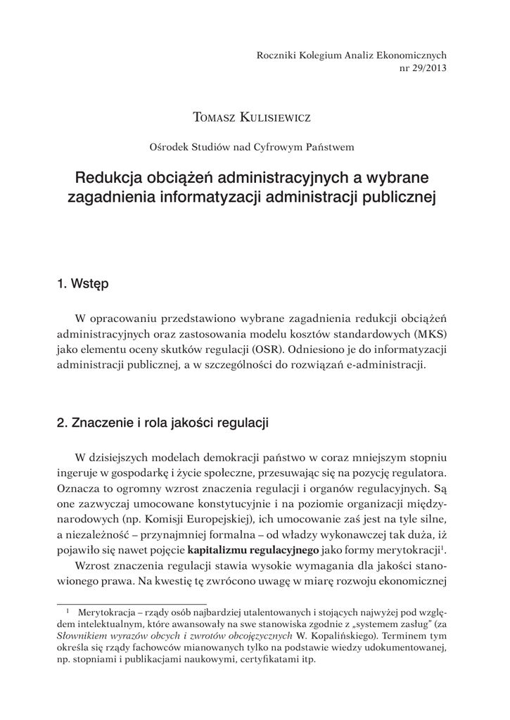 Roczniki Kolegium Analiz Ekonomicznych nr 29/2013 Tomasz Kulisiewicz Ośrodek Studiów nad Cyfrowym Państwem Redukcja obciążeń administracyjnych a wybrane zagadnienia informatyzacji administracji publicznej 1. Wstęp W opracowaniu przedstawiono wybrane zagadnienia redukcji obciążeń administracyjnych oraz zastosowania modelu kosztów standardowych (MKS) jako elementu oceny skutków regulacji (OSR). Odniesiono je do informatyzacji administracji publicznej, a w szczególności do rozwiązań e-administracji. 2. Znaczenie i rola jakości regulacji W dzisiejszych modelach demokracji państwo w coraz mniejszym stopniu ingeruje w gospodarkę i życie społeczne, przesuwając się na pozycję regulatora. Oznacza to ogromny wzrost znaczenia regulacji i organów regulacyjnych. Są one zazwyczaj umocowane konstytucyjnie i na poziomie organizacji międzynarodowych (np. Komisji Europejskiej), ich umocowanie zaś jest na tyle silne, a niezależność – przynajmniej formalna – od władzy wykonawczej tak duża, iż pojawiło się nawet pojęcie kapitalizmu regulacyjnego jako formy merytokracji1. Wzrost znaczenia regulacji stawia wysokie wymagania dla jakości stanowionego prawa. Na kwestię tę zwrócono uwagę w miarę rozwoju ekonomicznej Merytokracja – rządy osób najbardziej utalentowanych i stojących najwyżej pod względem intelektualnym, które awansowały na swe stanowiska zgodnie z „systemem zasług” (za Słownikiem wyrazów obcych i zwrotów obcojęzycznych W. Kopalińskiego). Terminem tym określa się rządy fachowców mianowanych tylko na podstawie wiedzy udokumentowanej, np. stopniami i publikacjami naukowymi, certyfikatami itp. 1 132 Tomasz Kulisiewicz analizy tworzenia prawa, jego struktury, procesów legislacyjnych oraz efektów gospodarczych. W latach 90. XX wieku pojawiły się programy poprawy jakości regulacji. W 1995 r. sformułowane zostały wytyczne OECD – Zalecenie C (95) 21 Rady OECD w sprawie poprawy jakości regulacji. W celu podniesienia jakości i przejrzystości prawa zalecono w nich m.in. badanie jakości i efektywności działań administracyjnych i politycznych zmierzających do tworzenia regulacji, ich implementacji i oceny oraz ewentualnych zmian. Zalecenie C (95) 21 zawiera m.in. „listę kontrolną”, czyli 10 pytań na temat definicji problemu, który chce regulować administracja, celowości regulacji, jej podstaw prawnych, szczebla administracji, który ma się zajmować daną regulacją, wyniku analizy kosztów i korzyści, przejrzystości i dostępności regulacji dla społeczeństwa, konsultacji społecznych oraz skuteczności egzekwowania prawa. Wzrost jakości prawa jest celem unijnego programu Better Regulation Komisji Europejskiej. Program ma przynieść korzyści zarówno obywatelom oraz przedsiębiorcom, jak i administracji publicznej – poprzez podniesienie jakości i uproszczenie przepisów oraz zapewnienie jednolitego otoczenia regulacyjnego. Od 2002 r. KE publikuje kolejne wersje wytycznych dotyczących analizy wpływów (ang. Impact Assesment). Na stronach KE dostępne są serwisy poświęcone programowi Better Regulation i inicjatywie Smart Regulation. Jest tam też baza danych kilkuset analiz wpływów z lat 2003–2012. 3. Ocena skutków regulacji W Polsce analiza wpływów projektowanych regulacji przybrała formę oceny skutków regulacji (OSR), wdrażanej od 2002 r. Zasady tworzenia OSR oraz ich rola w procesie legislacyjnym są rozproszone w kilku aktach o różnej i stosunkowo niskiej randze. Są to: • Regulamin pracy Rady Ministrów § 9 ust. 1 i 2 oraz §10 ust. 1 i 62; • rozporządzenie Prezesa Rady Ministrów z 2002 r.3; Uchwała Rady Ministrów Nr 49 z 19 marca 2002 r. (M.P. Nr 13, poz. 221) oraz uchwała Nr 38 Rady Ministrów z dnia 31 marca 2009 r. zmieniająca uchwałę – Regulamin pracy Rady Ministrów (M.P. z 1 kwietnia 2009 r.) 3 Rozporządzenie Prezesa Rady Ministrów z 20 czerwca 2002 r. – W sprawie zasad techniki prawodawczej §1 ust. 1 i 2 (Dz.U.02.100.908) 2 Redukcja obciążeń administracyjnych a wybrane zagadnienia informatyzacji... 133 • ustawa z 2010 r. o współpracy Rady Ministrów z Sejmem i Senatem w sprawach związanych z członkostwem Rzeczypospolitej Polskiej w Unii Europejskiej4; • Wytyczne do oceny skutków regulacji Ministra Gospodarki zintegrowane z § 9 ust. 1 i 2 Regulaminu pracy Rady Ministrów5; • Wytyczne dotyczące opracowywania projektów założeń projektów ustaw, opublikowane przez Rządowe Centrum Legislacyjne6; • art. 50 ust.1a–1c ustawy z 2010 r. o zmianie ustawy o finansach publicznych7. Nie ma obowiązku tworzenia OSR dla poselskich projektów ustaw, a także dla inicjatyw ustawodawczych Prezydenta RP oraz projektów obywatelskich. Brak obowiązku dla projektów poselskich jest znamienny: unikanie konieczności przygotowania analizy projektu aktu prawnego jest często wykorzystywane przez partie polityczne, zwłaszcza gdy ekipom rządzącym zależy na spektakularnych sukcesach politycznych, którymi mają być pospiesznie wprowadzane regulacje. Zgłaszanie projektów aktów prawnych przez klub parlamentarny, a nie przez rząd, jest wykorzystywane zwłaszcza w sytuacjach nazywanych w politologii „syndromem ugryzionego dziecka”. Warto zwrócić uwagę na znamienną różnicę terminologii. Użycie terminu „ocena skutków regulacji”, a nie „analiza wpływów” stosowanego przez Komisję Europejską, jest przejawem trochę innego nastawienia. Według metodyki wytycznych OECD i KE, ocena skutków powstrzymania się od regulacji jest elementem analizy wpływów tak samo ważnym jak ocena skutków wprowadzenia przepisu lub pośrednich form regulacji (np. samoregulacja – dobrowolne porozumienia aktorów rynku, kodeksy etyczne itp.). Analizę efektów powstrzymania się od ingerencji prawnej trzeba wykonać, aby zdać sobie sprawę z tego, jakie mogą być skutki pozostawienia stanu niezmienionego, i porównać to, czy korzyści, których się spod
