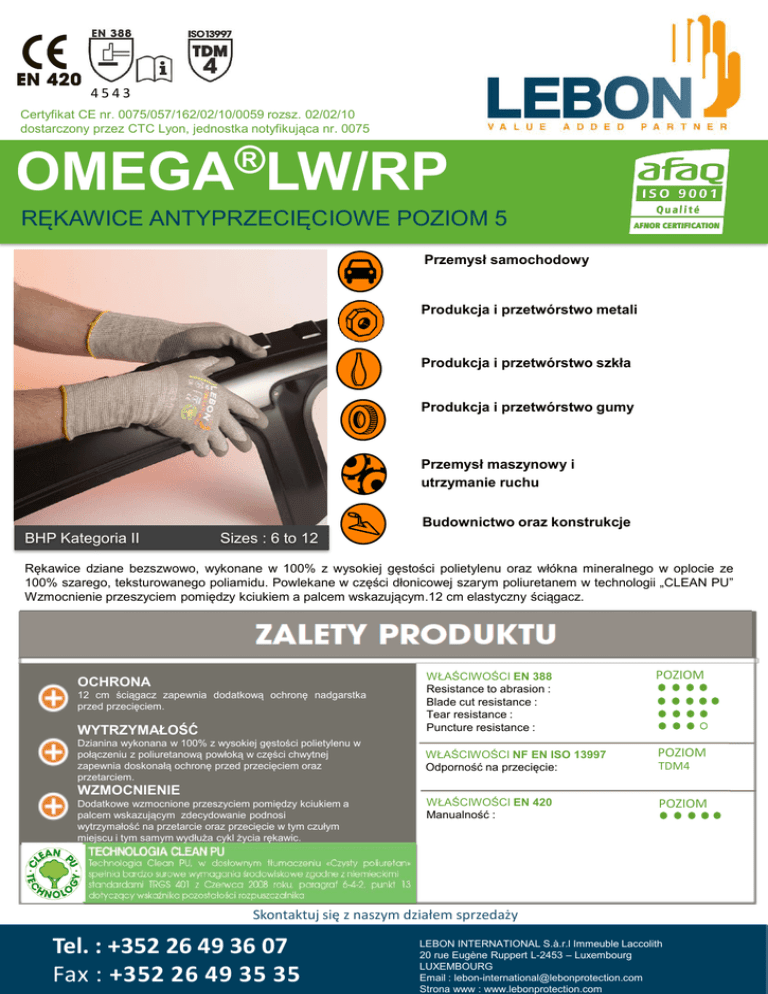 4543 Certyfikat CE nr. 0075/057/162/02/10/0059 rozsz. 02/02/10 dostarczony przez CTC Lyon, jednostka notyfikująca nr. 0075 ® OMEGA LW/RP RĘKAWICE ANTYPRZECIĘCIOWE POZIOM 5 Przemysł samochodowy Produkcja i przetwórstwo metali Produkcja i przetwórstwo szkła Produkcja i przetwórstwo gumy Przemysł maszynowy i utrzymanie ruchu Budownictwo oraz konstrukcje BHP Kategoria II Sizes : 6 to 12 Rękawice dziane bezszwowo, wykonane w 100% z wysokiej gęstości polietylenu oraz włókna mineralnego w oplocie ze 100% szarego, teksturowanego poliamidu. Powlekane w części dłonicowej szarym poliuretanem w technologii „CLEAN PU” Wzmocnienie przeszyciem pomiędzy kciukiem a palcem wskazującym.12 cm elastyczny ściągacz. OCHRONA 12 cm ściągacz zapewnia dodatkową ochronę nadgarstka przed przecięciem. WYTRZYMAŁOŚĆ Dzianina wykonana w 100% z wysokiej gęstości polietylenu w połączeniu z poliuretanową powłoką w części chwytnej zapewnia doskonałą ochronę przed przecięciem oraz przetarciem. WZMOCNIENIE Dodatkowe wzmocnione przeszyciem pomiędzy kciukiem a palcem wskazującym zdecydowanie podnosi wytrzymałość na przetarcie oraz przecięcie w tym czułym miejscu i tym samym wydłuża cykl życia rękawic. WŁAŚCIWOŚCI EN 388 Resistance to abrasion : Blade cut resistance : Tear resistance : Puncture resistance : POZIOM WŁAŚCIWOŚCI NF EN ISO 13997 Odporność na przecięcie: POZIOM WŁAŚCIWOŚCI EN 420 Manualność : POZIOM TDM4 CLEAN PU TECHNOLOGY The CLEAN PU technology meets the strongest environmental requirements (according to German legislation TRGS 401, June 2008, paragraph 6-4-2 point 13 regarding the rate of residual solvent). Skontaktuj się z naszym działem sprzedaży Tel. : +352 26 49 36 07 Fax : +352 26 49 35 35 LEBON INTERNATIONAL S.à.r.l Immeuble Laccolith 20 rue Eugène Ruppert L-2453 – Luxembourg LUXEMBOURG Email : [email protected] Strona www : www.lebonprotection.com