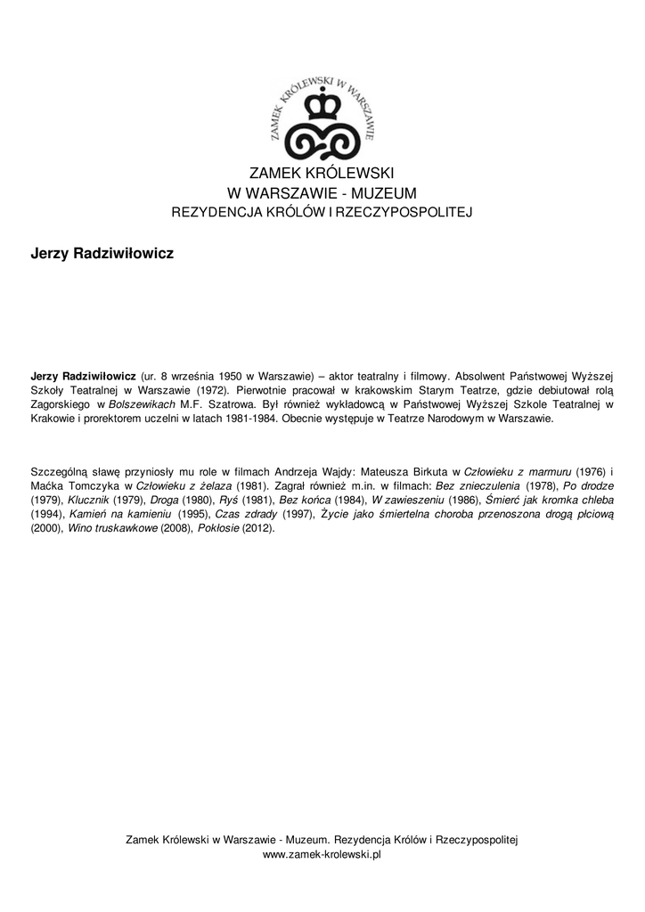 ZAMEK KRÓLEWSKI W WARSZAWIE - MUZEUM REZYDENCJA KRÓLÓW I RZECZYPOSPOLITEJ Jerzy Radziwiłowicz Jerzy Radziwiłowicz (ur. 8 września 1950 w Warszawie) – aktor teatralny i filmowy. Absolwent Państwowej Wyższej Szkoły Teatralnej w Warszawie (1972). Pierwotnie pracował w krakowskim Starym Teatrze, gdzie debiutował rolą Zagorskiego w Bolszewikach M.F. Szatrowa. Był również wykładowcą w Państwowej Wyższej Szkole Teatralnej w Krakowie i prorektorem uczelni w latach 1981-1984. Obecnie występuje w Teatrze Narodowym w Warszawie. Szczególną sławę przyniosły mu role w filmach Andrzeja Wajdy: Mateusza Birkuta w Człowieku z marmuru (1976) i Maćka Tomczyka w Człowieku z żelaza (1981). Zagrał również m.in. w filmach: Bez znieczulenia (1978), Po drodze (1979), Klucznik (1979), Droga (1980), Ryś (1981), Bez końca (1984), W zawieszeniu (1986), Śmierć jak kromka chleba (1994), Kamień na kamieniu (1995), Czas zdrady (1997), Życie jako śmiertelna choroba przenoszona drogą płciową (2000), Wino truskawkowe (2008), Pokłosie (2012). Zamek Królewski w Warszawie - Muzeum. Rezydencja Królów i Rzeczypospolitej www.zamek-krolewski.pl