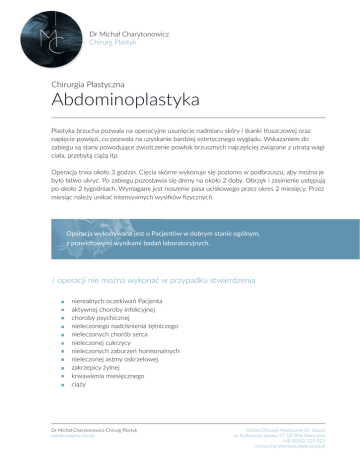 Dr Michał Charytonowicz Chirurg Plastyk Chirurgia Plastyczna Abdominoplastyka Plastyka brzucha pozwala na operacyjne usunięcie nadmiaru skóry i tkanki tłuszczowej oraz napięcie powięzi, co pozwala na uzyskanie bardziej estetycznego wyglądu. Wskazaniem do zabiegu są stany powodujące zwiotczenie powłok brzusznych najczęściej związane z utratą wagi ciała, przebytą ciążą itp. Operacja trwa około 3 godzin. Cięcia skórne wykonuje się poziomo w podbrzuszu, aby można je było łatwo ukryć. Po zabiegu pozostawia się dreny na około 2 doby. Obrzęk i zasinienie ustępują po około 2 tygodniach. Wymagane jest noszenie pasa uciskowego przez okres 2 miesięcy. Przez miesiąc należy unikać intensywnych wysiłków fizycznych. Operacja wykonywana jest u Pacjentów w dobrym stanie ogólnym, z prawidłowymi wynikami badań laboratoryjnych. / operacji nie można wykonać w przypadku stwierdzenia nierealnych oczekiwań Pacjenta aktywnej choroby infekcyjnej choroby psychicznej nieleczonego nadciśnienia tętniczego nieleczonych chorób serca nieleczonej cukrzycy nieleczonych zaburzeń hormonalnych nieleczonej astmy oskrzelowej zakrzepicy żylnej krwawienia miesięcznego ciąży Dr Michał Charytonowicz Chirurg Plastyk plasticsurgery.com.pl Klinika Chirurgii Plastycznej Dr. Szczyt ul. Królewicza Jakuba 37, 02-956 Warszawa +48 (0)502 221 022 [email protected] / wymagane badania laboratoryjne Znieczulenie ogólne: grupa krwi morfologia wskaźniki układu krzepnięcia (czas i wskaźnik PT, INR, czas APTT) elektrolity (Na, K) glukoza kreatynina przeciwciała anty-HCV, anty-HIV badanie ogólne moczu EKG RTG klatki piersiowej Znieczulenie miejscowe: grupa krwi morfologia wskaźniki układu krzepnięcia (czas i wskaźnik PT, INR, czas APTT) elektrolity (Na, K) Pacjent powinien być zaszczepiony przeciwko wirusowemu zapaleniu wątroby typu B (WZW B). Przed planowaną operacją należy bezwzględnie zgłosić wszelkie dolegliwości zdrowotne oraz poinformować o zażywanych lekach i występujących uczuleniach. / przygotowanie do operacji co najmniej 4 tygodnie przed planowaną operacją należy odstawić wszystkie hormonalne leki antykoncepcyjne oraz leki hormonalnej terapii zastępczej; co najmniej 3 tygodnie przed planowaną operacją nie wolno palić tytoniu; 14 dni przed operacją nie należy przyjmować leków z grupy salicylanów (Aspiryna, Polopiryna itp.) oraz innych substancji wpływających na krzepnięcie krwi (np. zioła, czosnek); 3 dni przed operacją nie wolno stosować leków p/bólowych: paracetamolu, pyralginy i leków typu NLPZ (np. Ketonal, Ibuprofen, Naproxen i inne); 6 godzin przez operacją nie wolno nic jeść, pić, żuć gumy; należy przyjąć leki stosowane przewlekle, popijając niewielką ilością wody. Dr Michał Charytonowicz Chirurg Plastyk plasticsurgery.com.pl Klinika Chirurgii Plastycznej Dr. Szczyt ul. Królewicza Jakuba 37, 02-956 Warszawa +48 (0)502 221 022 [email protected]