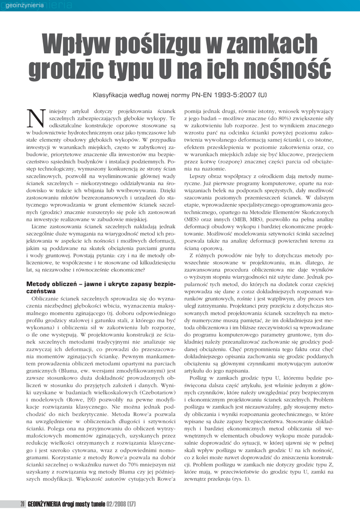 geoinżynieria geoinżynieria Wpływ poślizgu w zamkach grodzic typu U na ich nośność Klasyfikacja według nowej normy PN-EN 1993-5:2007 (U) N iniejszy artykuł dotyczy projektowania ścianek szczelnych zabezpieczających głębokie wykopy. Te odkształcalne konstrukcje oporowe stosowane są w budownictwie hydrotechnicznym oraz jako tymczasowe lub stałe elementy obudowy głębokich wykopów. W przypadku inwestycji w warunkach miejskich, często w zabytkowej zabudowie, priorytetowe znaczenie dla inwestorów ma bezpieczeństwo sąsiednich budynków i instalacji podziemnych. Postęp technologiczny, wymuszony konkurencją ze strony ścian szczelinowych, pozwolił na wyeliminowanie głównej wady ścianek szczelnych – niekorzystnego oddziaływania na środowisko w trakcie ich wbijania lub wwibrowywania. Dzięki zastosowaniu młotów bezrezonansowych i urządzeń do statycznego wprowadzania w grunt elementów ścianek szczelnych (grodzic) znacznie rozszerzyło się pole ich zastosowań na inwestycje realizowane w zabudowie miejskiej. Liczne zastosowania ścianek szczelnych nakładają jednak szczególnie duże wymagania na wiarygodność metod ich projektowania w aspekcie ich nośności i możliwych deformacji, jakim są poddawane na skutek obciążenia parciami gruntu i wody gruntowej. Powstają pytania: czy i na ile metody obliczeniowe, te współczesne i te stosowane od kilkudziesięciu lat, są niezawodne i równocześnie ekonomiczne? Metody obliczeń – jawne i ukryte zapasy bezpieczeństwa Obliczanie ścianek szczelnych sprowadza się do wyznaczenia niezbędnej głębokości wbicia, wyznaczenia maksymalnego momentu zginającego (tj. doboru odpowiedniego profilu grodzicy stalowej i gatunku stali, z którego ma być wykonana) i obliczenia sił w zakotwieniu lub rozporze, o ile one występują. W projektowaniu konstrukcji ze ścianek szczelnych metodami tradycyjnymi nie analizuje się zazwyczaj ich deformacji, co prowadzi do przeszacowania momentów zginających ściankę. Pewnym mankamentem prowadzenia obliczeń metodami opartymi na parciach granicznych (Bluma, ew. wersjami zmodyfikowanymi) jest zawsze stosunkowo duża dokładność prowadzonych obliczeń w stosunku do przyjętych założeń i danych. Wyniki uzyskane w badaniach wielkoskalowych (Czebotariow) i modelowych (Rowe, [9]) pozwoliły na pewne modyfikacje rozwiązania klasycznego. Nie można jednak podchodzić do nich bezkrytycznie. Metoda Rowe’a pozwala na uwzględnienie w obliczeniach długości i sztywności ścianki. Polega ona na przyjmowaniu do obliczeń wytrzymałościowych momentów zginających, uzyskanych przez redukcję wielkości otrzymanych z rozwiązania klasycznego i jest szeroko cytowana, wraz z odpowiednimi nomogramami. Korzystanie z metody Rowe’a pozwala na dobór ścianki szczelnej o wskaźniku nawet do 70% mniejszym niż uzyskany z rozwiązania wg metody Bluma czy jej późniejszych modyfikacji. Większość autorów cytujących Rowe’a 20 GEOINŻYNIERIA drogi mosty tunele 02/2008 (17) pomija jednak drugi, równie istotny, wniosek wypływający z jego badań – możliwe znaczne (do 80%) zwiększenie siły w zakotwieniu lub rozporze. Jest to wynikiem znacznego wzrostu parć na odcinku ścianki powyżej poziomu zakotwienia wywołanego deformacją samej ścianki i, co istotne, efektem przesklepienia w poziomie zakotwienia oraz, co w warunkach miejskich zdaje się być kluczowe, przejęciem przez kotwę (rozporę) znacznej części parcia od obciążenia na naziomie. Lepszy obraz współpracy z ośrodkiem dają metody numeryczne. Już pierwsze programy komputerowe, oparte na rozwiązaniach belek na podporach sprężystych, dały możliwość szacowania poziomych przemieszczeń ścianek. W dalszym etapie, wprowadzenie specjalistycznego oprogramowania geotechnicznego, opartego na Metodzie Elementów Skończonych (MES) oraz innych (MEB, MRS), pozwoliło na pełną analizę deformacji obudowy wykopu i bardziej ekonomiczne projektowanie. Możliwość modelowania sztywności ścinki szczelnej pozwala także na analizę deformacji powierzchni terenu za ścianą oporową. Z różnych powodów nie były to dotychczas metody powszechnie stosowane w projektowaniu, m.in. dlatego, że zaawansowana procedura obliczeniowa nie daje wyników o wyższym stopniu wiarygodności niż użyte dane. Jednak popularność tych metod, do których na dodatek coraz częściej wprowadza się dane z coraz dokładniejszych rozpoznań warunków gruntowych, rośnie i jest wątpliwym, aby proces ten uległ zatrzymaniu. Projektanci przy przejściu z dotychczas stosowanych metod projektowania ścianek szczelnych na metody numeryczne muszą pamiętać, że im dokładniejsza jest metoda obliczeniowa i im bliższe rzeczywistości są wprowadzane do programu komputerowego parametry gruntowe, tym dokładniej należy przeanalizować zachowanie się grodzicy poddanej obciążeniu. Chęć przypomnienia tego faktu oraz chęć dokładniejszego opisania zachowania się grodzic poddanych obciążeniu są głównymi czynnikami motywującym autorów artykułu do jego napisania. Poślizg w zamkach grodzic typu U, któremu będzie poświęcona dalsza część artykułu, jest właśnie jednym z głównych czynników, które należy uwzględniać przy bezpiecznym i ekonomicznym projektowaniu ścianek szczelnych. Problem poślizgu w zamkach jest niezauważalny, gdy stosujemy metody obliczania i wyniki rozpoznania geotechnicznego, w które wpisane są duże zapasy bezpieczeństwa. Stosowanie dokładnych i bardziej ekonomicznych metod obliczania sił wewnętrznych w elementach obudowy wykopu może paradoksalnie doprowadzić do sytuacji, w której ujawni się w pełnej skali wpływ poślizgu w zamkach grodzic U na ich nośność, co z kolei może nawet doprowadzić do zniszczenia konstrukcji. Problem poślizgu w zamkach nie dotyczy grodzic typu Z, które mają, w przeciwieństwie do grodzic typu U, zamki na zewnątrz przekroju (rys. 1). geoinżynieria geoinż