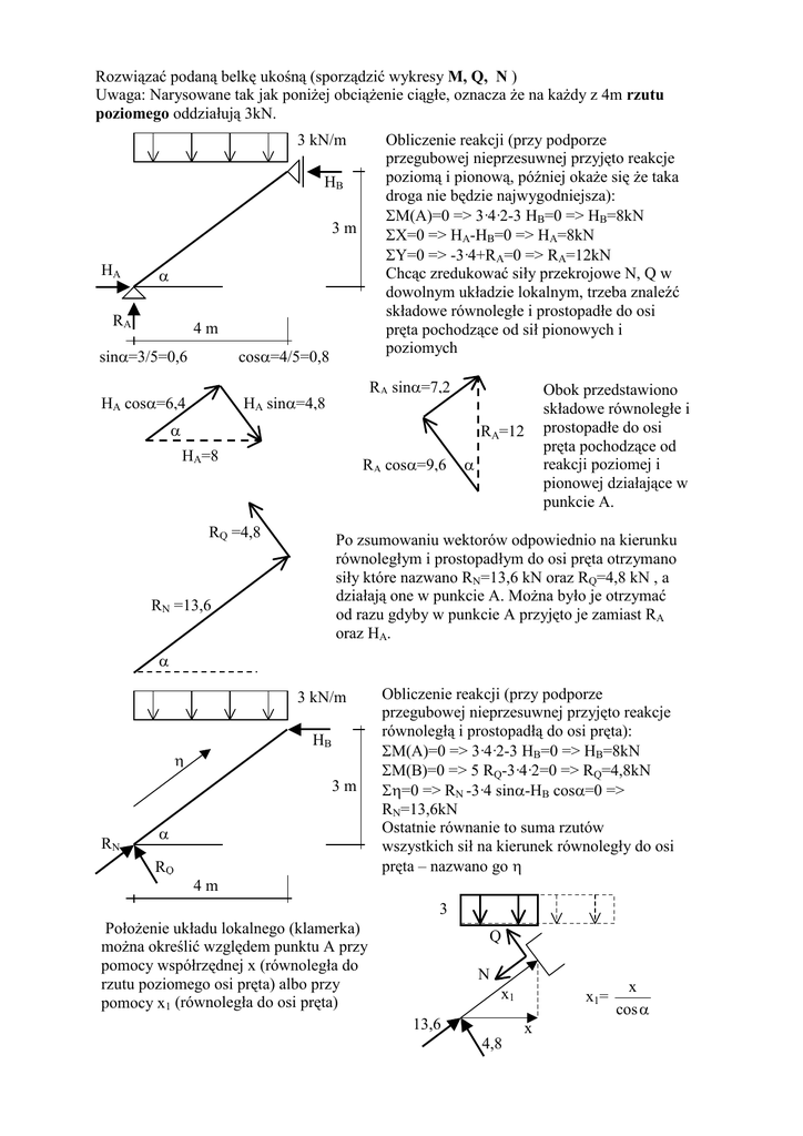 Rozwiązać podaną belkę ukośną (sporządzić wykresy M, Q, N ) Uwaga: Narysowane tak jak poniżej obciążenie ciągłe, oznacza że na każdy z 4m rzutu poziomego oddziałują 3kN. 3 kN/m Obliczenie reakcji (przy podporze przegubowej nieprzesuwnej przyjęto reakcje poziomą i pionową, później okaże się że taka droga nie będzie najwygodniejsza): ΣM(A)=0 => 3·4·2-3 HB=0 => HB=8kN ΣX=0 => HA-HB=0 => HA=8kN ΣY=0 => -3·4+RA=0 => RA=12kN Chcąc zredukować siły przekrojowe N, Q w dowolnym układzie lokalnym, trzeba znaleźć składowe równoległe i prostopadłe do osi pręta pochodzące od sił pionowych i poziomych HB 3m HA α RA 4m sinα=3/5=0,6 cosα=4/5=0,8 HA cosα=6,4 HA sinα=4,8 RA sinα=7,2 α RA=12 HA=8 RA cosα=9,6 RQ =4,8 α Obok przedstawiono składowe równoległe i prostopadłe do osi pręta pochodzące od reakcji poziomej i pionowej działające w punkcie A. Po zsumowaniu wektorów odpowiednio na kierunku równoległym i prostopadłym do osi pręta otrzymano siły które nazwano RN=13,6 kN oraz RQ=4,8 kN , a działają one w punkcie A. Można było je otrzymać od razu gdyby w punkcie A przyjęto je zamiast RA oraz HA. RN =13,6 α 3 kN/m HB η 3m RN α RQ Obliczenie reakcji (przy podporze przegubowej nieprzesuwnej przyjęto reakcje równoległą i prostopadłą do osi pręta): ΣM(A)=0 => 3·4·2-3 HB=0 => HB=8kN ΣM(B)=0 => 5 RQ-3·4·2=0 => RQ=4,8kN Ση=0 => RN -3·4 sinα-HB cosα=0 => RN=13,6kN Ostatnie równanie to suma rzutów wszystkich sił na kierunek równoległy do osi pręta – nazwano go η 4m 3 Położenie układu lokalnego (klamerka) można określić względem punktu A przy pomocy współrzędnej x (równoległa do rzutu poziomego osi pręta) albo przy pomocy x1 (równoległa do osi pręta) Q N x1 13,6 x1 = x 4,8 x cos α Równania opisujące funkcje sił przekrojowych wyrażone przy pomocy współrzędnej x: N(x)= -13,6+3 x sinα = -13,6+1,8 x Q(x)= 4,8-3 x cosα = 4,8-2,4 x x M(x)= 4,8 -3 x x/2 = 6 x-1,5 x2 cos α ∂M ( x ) nie jest taka sama jak funkcja Q(x). Powodem Należy zwrócić uwagę że pochodna ∂x tego jest to że współrzędna x nie jest równoległa do osi pręta. Jeżeli funkcje sił przekrojowych wyrazimy przez x1: Q(x1)= 4,8-3 x1 cosα cosα = 4,8-1,92 x1 M(x1)= 4,8 x1 -3 (x1 cosα)2 /2 = 4,8 x1-0,96 x12 ∂M ( x1 ) to wtedy: = Q(x1). ∂x1 Do narysowania wykresów N, Q, M można posłużyć się współrzędną x albo x1 pamiętając że: W p.A: x=0, x1=0 W p.B: x=4m, x1=5m W środku belki: x=2m, x1=2,5m 4,8 6,4 N [kN] Q [kN] 4,8 13,6 M [kNm] 6 Obciążenie ciągłe rysowane tak jak do tej pory, może być też przedstawione w postaci statycznie równoważnego obciążenia przyłożonego do osi pręta. 3 kN/m 2,4 kN/m α α Wypadkowa w pierwszym przypadku to 3kN/m·4m a w drugim to 2,4kN/m·5m , czyli 12kN w obu przypadkach, prosta działania tej wypadkowej jest pionowa i przechodzi przez środek belki. W równaniach zamiast pisać 3 x w pierwszym przypadku, zapisze się 2,4 x1 w drugim, co da ten sam wynik Gdyby obciążenie o wartości 3kN/m było przyłożone do osi pręta, to było by równoważne obciążeniu 3,75kN/m przyłożonemu do rzutu poziomego 3,75 kN/m 3 kN/m α α Wypadkowa w pierwszym przypadku to 3,75kN/m·4m a w drugim to 3kN/m·5m , czyli 15kN w obu przypadkach, prosta działania tej wypadkowej jest pionowa i przechodzi przez środek belki. W równaniach zamiast pisać 3,75 x w pierwszym przypadku, zapisze się 3 x1 w drugim, co da ten sam wynik Dla takiego, czyli zwiększonego o 25% obciążenia, reakcje wyniosą (przy podporze przegubowej nieprzesuwnej przyjęto reakcje równoległą i prostopadłą do osi pręta): ΣM(A)=0 => 3·5·2-3 HB=0 => HB=10kN ΣM(B)=0 => 5 RQ-3·5·2=0 => RQ=6kN Ση=0 => RN -3·5 sinα-HB cosα=0 => RN=17kN Ostatnie równanie to suma rzutów wszystkich sił na kierunek równoległy do osi pręta – nazwano go η Na wykresach N, Q, M pojawią się wartości zwiększone o 25%. 6 8 N [kN] Q [kN] 6 17 M [kNm] 7,5 Kolejny przykład to belka skośna obciążona na swojej długości (5m) obciążeniem „prostokątnym” prostopadłym do osi belki, HB 3 kN/m 3m RN α RQ 4m Obliczenie reakcji (przy podporze przegubowej nieprzesuwnej przyjęto reakcje równoległą i prostopadłą do osi pręta): ΣM(A)=0 => 3·5·2,5-3 HB=0 => HB=12,5kN ΣM(B)=0 => 5 RQ-3·5·2,5=0 => RQ=7,5kN Ση=0 => RN -HB cosα=0 => RN=10kN Ostatnie równanie to suma rzutów wszystkich sił na kierunek równoległy do osi pręta – nazwano go η Równania opisujące funkcje sił przekrojowych wyrażone przy pomocy współrzędnej x1: N(x1)= -10 Q(x1)= 7,5-3 x1 M(x1)= 7,5 x1 -3 x12 /2 7,5 N [kN] Q [kN] 10 7,5 M [kNm] 9,375