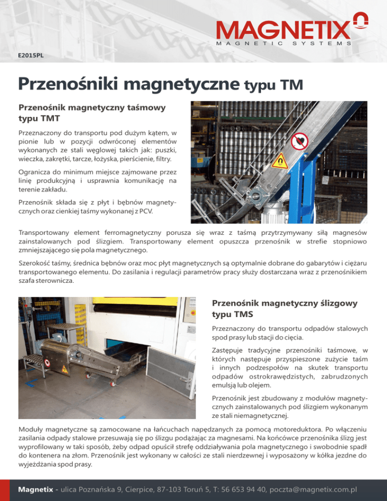 M A G N E T I C S Y S T E M S E2015PL Przenośniki magnetyczne typu TM Przenośnik magnetyczny taśmowy typu TMT Przeznaczony do transportu pod dużym kątem, w pionie lub w pozycji odwróconej elementów wykonanych ze stali węglowej takich jak: puszki, wieczka, zakrętki, tarcze, łożyska, pierścienie, filtry. Ogranicza do minimum miejsce zajmowane przez linię produkcyjną i usprawnia komunikację na terenie zakładu. Przenośnik składa się z płyt i bębnów magnetycznych oraz cienkiej taśmy wykonanej z PCV. Transportowany element ferromagnetyczny porusza się wraz z taśmą przytrzymywany siłą magnesów zainstalowanych pod ślizgiem. Transportowany element opuszcza przenośnik w strefie stopniowo zmniejszającego się pola magnetycznego. Szerokość taśmy, średnica bębnów oraz moc płyt magnetycznych są optymalnie dobrane do gabarytów i ciężaru transportowanego elementu. Do zasilania i regulacji parametrów pracy służy dostarczana wraz z przenośnikiem szafa sterownicza. Przenośnik magnetyczny ślizgowy typu TMS Przeznaczony do transportu odpadów stalowych spod prasy lub stacji do cięcia. Zastępuje tradycyjne przenośniki taśmowe, w których następuje przyspieszone zużycie taśm i innych podzespołów na skutek transportu odpadów ostrokrawędzistych, zabrudzonych emulsją lub olejem. Przenośnik jest zbudowany z modułów magnetycznych zainstalowanych pod ślizgiem wykonanym ze stali niemagnetycznej. Moduły magnetyczne są zamocowane na łańcuchach napędzanych za pomocą motoreduktora. Po włączeniu zasilania odpady stalowe przesuwają się po ślizgu podążając za magnesami. Na końcówce przenośnika ślizg jest wyprofilowany w taki sposób, żeby odpad opuścił strefę oddziaływania pola magnetycznego i swobodnie spadł do kontenera na złom. Przenośnik jest wykonany w całości ze stali nierdzewnej i wyposażony w kółka jezdne do wyjeżdżania spod prasy. Magnetix - ulica Poznańska 9, Cierpice, 87-103 Toruń 5, T: 56 653 94 40, [email protected]