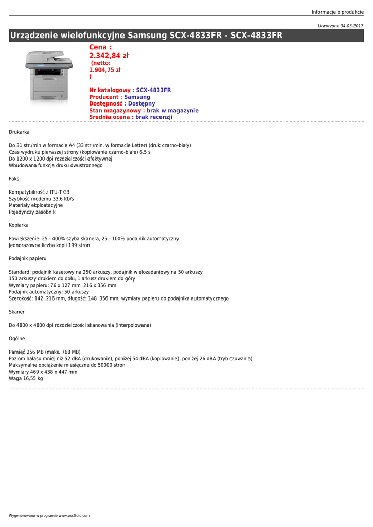 Informacje o produkcie Utworzono 04-03-2017 Urządzenie wielofunkcyjne Samsung SCX-4833FR - SCX-4833FR Cena : 2.342,84 zł (netto: 1.904,75 zł ) Nr katalogowy : SCX-4833FR Producent : Samsung Dostępność : Dostępny Stan magazynowy : brak w magazynie Średnia ocena : brak recenzji Drukarka Do 31 str./min w formacie A4 (33 str./min. w formacie Letter) (druk czarno-biały) Czas wydruku pierwszej strony (kopiowanie czarno-białe) 6.5 s Do 1200 x 1200 dpi rozdzielczości efektywnej Wbudowana funkcja druku dwustronnego Faks Kompatybilność z ITU-T G3 Szybkość modemu 33,6 Kb/s Materiały ekploatacyjne Pojedynczy zasobnik Kopiarka Powiększenie: 25 - 400% szyba skanera, 25 - 100% podajnik automatyczny Jednorazowoa liczba kopii 199 stron Podajnik papieru Standard: podajnik kasetowy na 250 arkuszy, podajnik wielozadaniowy na 50 arkuszy 150 arkuszy drukiem do dołu, 1 arkusz drukiem do góry Wymiary papieru: 76 x 127 mm 216 x 356 mm Podajnik automatyczny: 50 arkuszy Szerokość: 142 216 mm, długość: 148 356 mm, wymiary papieru do podajnika automatycznego Skaner Do 4800 x 4800 dpi rozdzielczości skanowania (interpolowana) Ogólne Pamięć 256 MB (maks. 768 MB) Poziom hałasu mniej niż 52 dBA (drukowanie), poniżej 54 dBA (kopiowanie), poniżej 26 dBA (tryb czuwania) Maksymalne obciążenie miesięczne do 50000 stron Wymiary 469 x 438 x 447 mm Waga 16,55 kg Wygenerowano w programie www.oscGold.com