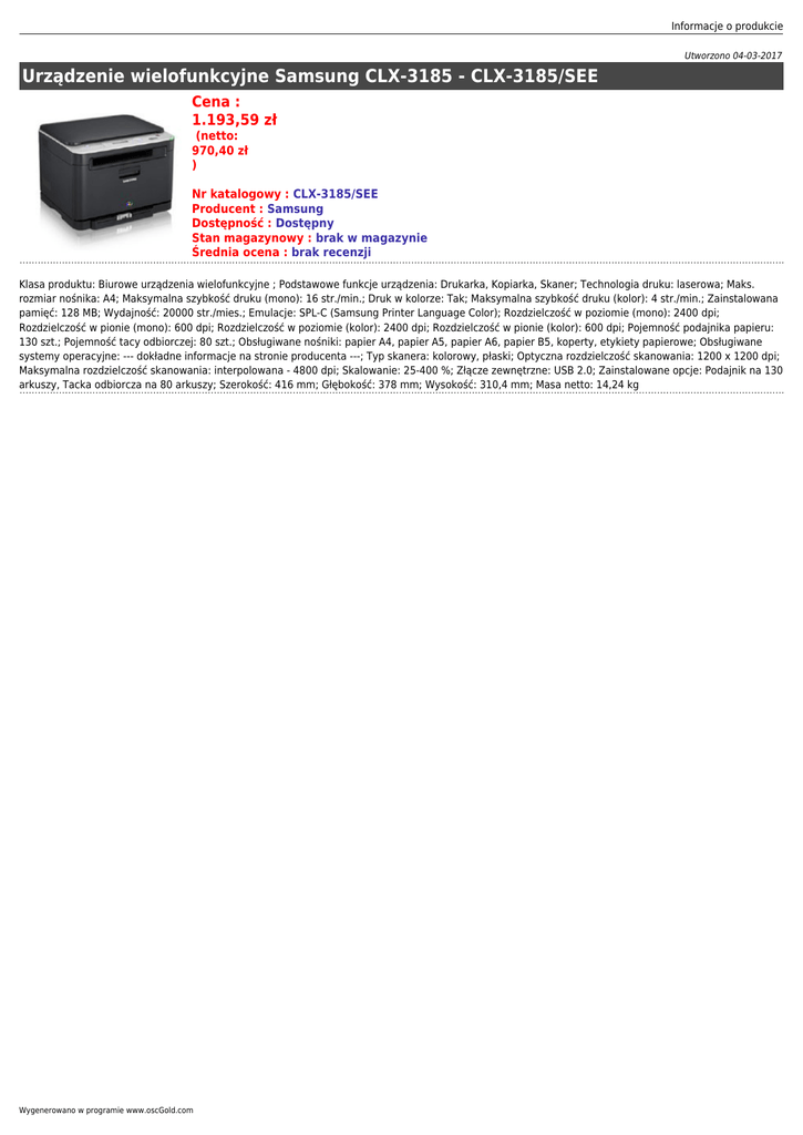 Informacje o produkcie Utworzono 04-03-2017 Urządzenie wielofunkcyjne Samsung CLX-3185 - CLX-3185/SEE Cena : 1.193,59 zł (netto: 970,40 zł ) Nr katalogowy : CLX-3185/SEE Producent : Samsung Dostępność : Dostępny Stan magazynowy : brak w magazynie Średnia ocena : brak recenzji Klasa produktu: Biurowe urządzenia wielofunkcyjne ; Podstawowe funkcje urządzenia: Drukarka, Kopiarka, Skaner; Technologia druku: laserowa; Maks. rozmiar nośnika: A4; Maksymalna szybkość druku (mono): 16 str./min.; Druk w kolorze: Tak; Maksymalna szybkość druku (kolor): 4 str./min.; Zainstalowana pamięć: 128 MB; Wydajność: 20000 str./mies.; Emulacje: SPL-C (Samsung Printer Language Color); Rozdzielczość w poziomie (mono): 2400 dpi; Rozdzielczość w pionie (mono): 600 dpi; Rozdzielczość w poziomie (kolor): 2400 dpi; Rozdzielczość w pionie (kolor): 600 dpi; Pojemność podajnika papieru: 130 szt.; Pojemność tacy odbiorczej: 80 szt.; Obsługiwane nośniki: papier A4, papier A5, papier A6, papier B5, koperty, etykiety papierowe; Obsługiwane systemy operacyjne: --- dokładne informacje na stronie producenta ---; Typ skanera: kolorowy, płaski; Optyczna rozdzielczość skanowania: 1200 x 1200 dpi; Maksymalna rozdzielczość skanowania: interpolowana - 4800 dpi; Skalowanie: 25-400 %; Złącze zewnętrzne: USB 2.0; Zainstalowane opcje: Podajnik na 130 arkuszy, Tacka odbiorcza na 80 arkuszy; Szerokość: 416 mm; Głębokość: 378 mm; Wysokość: 310,4 mm; Masa netto: 14,24 kg Wygenerowano w programie www.oscGold.com