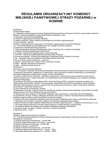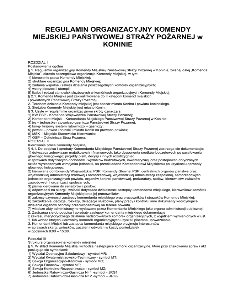 REGULAMIN ORGANIZACYJNY KOMENDY MIEJSKIEJ PAŃSTWOWEJ STRAŻY POŻARNEJ w KONINIE ROZDZIAL I Postanowienia ogólne § 1. Regulamin organizacyjny Komendy Miejskiej Panstwowej Strazy Pozarnej w Koninie, zwanej dalej „Komenda Miejska”, okresla szczególowa organizacje Komendy Miejskiej, w tym: 1) kierowanie praca Komendy Miejskiej; 2) strukture organizacyjna Komendy Miejskiej; 3) zadania wspólne i zakres dzialania poszczególnych komórek organizacyjnych; 4) wzory pieczeci i stempli; 5) liczbe i rodzaj stanowisk sluzbowych w komórkach organizacyjnych Komendy Miejskiej. § 2.1. Komenda Miejska jest zakwalifikowana do II kategorii komend miejskich i powiatowych Panstwowej Strazy Pozarnej. 2. Terenem dzialania Komendy Miejskiej jest obszar miasta Konina i powiatu koninskiego. 3. Siedziba Komendy Miejskiej jest miasto Konin. § 3. Uzyte w regulaminie organizacyjnym skróty oznaczaja: 1) KW PSP - Komende Wojewódzka Panstwowej Strazy Pozarnej; 2) Komendant Miejski - Komendanta Miejskiego Panstwowej Strazy Pozarnej w Koninie; 3) jrg – jednostke ratowniczo-gasnicza Panstwowej Strazy Pozarnej; 4) ksr-g- krajowy system ratowniczo – gasniczy; 5) powiat – powiat koninski i miasto Konin na prawach powiatu; 6) MSK – Miejskie Stanowisko Kierowania; 7) OSP – Ochotnicza Straz Pozarna. ROZDZIAL II Kierowanie praca Komendy Miejskiej § 4.1. Do podpisu i aprobaty Komendanta Miejskiego Panstwowej Strazy Pozarnej zastrzega sie dokumentacje: 1) dotyczaca zobowiazan majatkowych i finansowych, jako dysponenta srodków budzetowych po parafowaniu glównego ksiegowego; projekty pism, decyzji i innych rozstrzygniec w sprawach dotyczacych dochodów i wydatków budzetowych, inwentaryzacji oraz postepowan dotyczacych szkód wyrzadzonych w majatku jednostki, sa przedkladane Komendantowi Miejskiemu po uzyskaniu aprobaty glównego ksiegowego; 2) kierowana do Komendy Wojewódzkiej PSP, Komendy Glównej PSP, centralnych organów panstwa oraz wojewódzkiej administracji rzadowej i samorzadowej, wojewódzkiej administracji zespolonej, samorzadowych jednostek organizacyjnych powiatu, organów kontroli panstwowej, prokuratury, sadów, kierownictw zwiazków zawodowych i organizacji spolecznych; 3) pisma kierowane do senatorów i poslów; 4) odpowiedzi na skargi i wnioski dotyczace dzialalnosci zastepcy komendanta miejskiego, kierowników komórek organizacyjnych Komendy Miejskiej oraz jej pracowników; 5) zakresy czynnosci zastepcy komendanta miejskiego oraz pracowników i strazaków Komendy Miejskiej; 6) zarzadzenia, decyzje, rozkazy, delegacje sluzbowe, plany pracy i kontroli i inne dokumenty koordynujace dzialania organów ochrony przeciwpozarowej na terenie powiatu. 7) wladcze akty administracyjne wydawane przez Komendanta Miejskiego jako organu administracji publicznej. 2. Zastrzega sie do podpisu i aprobaty zastepcy komendanta miejskiego dokumentacje z zakresu merytorycznego dzialania nadzorowanych komórek organizacyjnych, z wyjatkiem wymienionych w ust. 1. lub wobec których kierownicy komórek organizacyjnych uzyskali pisemne upowaznienie. 3. Komendant Miejski lub zastepca komendanta miejskiego przyjmuje interesantów w sprawach skarg, wniosków, zazalen i odwolan w kazdy poniedzialek w godzinach 8:00 – 15:00. Rozdzial III Struktura organizacyjna komendy miejskiej § 5. W sklad Komendy Miejskiej wchodza nastepujace komórki organizacyjne, które przy znakowaniu spraw i akt posluguja sie symbolami: 1) Wydzial Operacyjno-Szkoleniowy - symbol MR; 2) Wydzial Kwatermistrzowsko-Techniczny - symbol MT; 3) Sekcja Organizacyjno-Kadrowa - symbol MO; 4) Sekcja Finansów - symbol MF; 5) Sekcja Kontrolno-Rozpoznawcza - symbol MZ; 6) Jednostka Ratowniczo-Gasnicza Nr 1 -symbol - JRG1; 7) Jednostka Ratowniczo-Gasnicza Nr 2 -symbol – JRG2. § 6. 1. Komendantowi Miejskiemu podlegaja bezposrednio: 1) Wydzial Kwatermistrzowsko-Techniczny; 2) Sekcja Organizacyjno-Kadrowa; 3) Sekcja Finansów. 2. Zastepca Komendanta Miejskiego nadzoruje: 1) Wydzial Operacyjno-Szkoleniowy ; 2) Sekcje Kontrolno-Rozpoznawcza ; 3) jednostki ratowniczo-gasnicze. 3. Zastepca komendanta miejskiego pelni funkcje pelnomocnika ds. ochrony informacji niejawnych oraz funkcje administratora systemu bezpieczenstwa sieci teleinformatycznej. Rozdzial IV Zadania wspólne i zakres dzialania poszczególnych komórek organizacyjnych § 7.1. Komórki organizacyjne maja obowiazek wspóldzialania i wspólpracy miedzy soba, a takze wspólpracuja z jednostkami organizacyjnymi ochrony przeciwpozarowej oraz innymi jednostkami administracji publicznej i organizacjami wykonujacymi zadania na rzecz ochrony przeciwpozarowej i ratownictwa, a takze realizuja inne zadania z zakresu ochrony ludnosci. 2. W realizacji zadan obejmujacych czynnosci kilku komórek organizacyjnych ich prowadzenie nalezy do komórki organizacyjnej, której zakres zadan obejmuje najwiecej zadan lub wlasciwy przelozony sluzbowy wydal w tym zakresie stosowna dyspozycje. 3. Sprawy nieuregulowane niniejszym regulaminem lub spory kompetencyjne dotyczace zakresu i zadan komórek organizacyjnych Komendy Miejskiej rozstrzyga Komendant Miejski. 4. Do wspólnych zadan wszystkich komórek organizacyjnych komendy miejskiej, przy uwzglednieniu ich zakresów merytorycznych, nalezy w szczególnosci : 1) planowanie i realizacja budzetu Komendy Miejskiej; 2) podejmowanie dzialan zwiazanych z wdrazaniem postepu w dziedzinie ochrony przeciwpozarowej i ratownictwa; 3) sporzadzanie programu dzialania oraz planu pracy Komendy Miejskiej , analiz, prognoz, ocen, informacji i sprawozdan z zakresu realizowanych zadan; 4) wspóldzialanie z ogniwami Zwiazku Ochotniczych Strazy Pozarnych Rzeczypospolitej Polskiej, stowarzyszeniami, zwiazkami zawodowymi dzialajacymi w Komendzie Miejskiej oraz innymi organami i jednostkami organizacyjnymi; 5) wspóldzialanie z komórkami organizacyjnymi Starostwa oraz z innymi sluzbami, inspekcjami i strazami, a takze z podmiotami ksrg; 6) wspóldzialanie z organami jednostek samorzadu terytorial