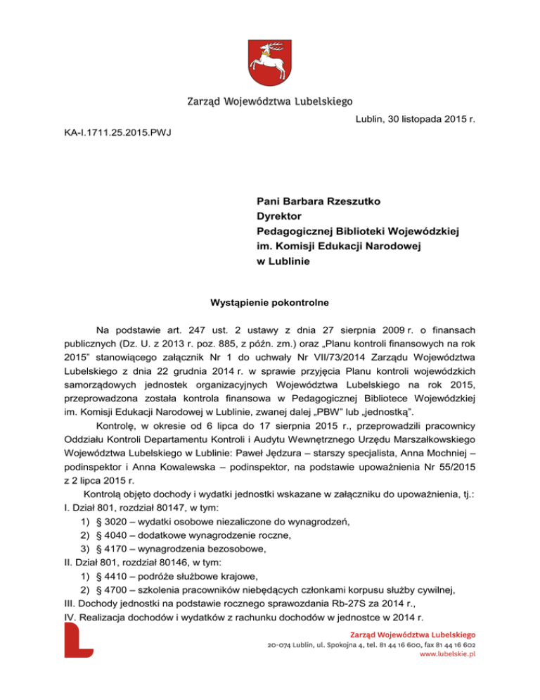 Lublin, 30 listopada 2015 r. KA-I.1711.25.2015.PWJ Pani Barbara Rzeszutko Dyrektor Pedagogicznej Biblioteki Wojewódzkiej im. Komisji Edukacji Narodowej w Lublinie Wystąpienie pokontrolne Na podstawie art. 247 ust. 2 ustawy z dnia 27 sierpnia 2009 r. o finansach publicznych (Dz. U. z 2013 r. poz. 885, z późn. zm.) oraz „Planu kontroli finansowych na rok 2015” stanowiącego załącznik Nr 1 do uchwały Nr VII/73/2014 Zarządu Województwa Lubelskiego z dnia 22 grudnia 2014 r. w sprawie przyjęcia Planu kontroli wojewódzkich samorządowych jednostek organizacyjnych Województwa Lubelskiego na rok 2015, przeprowadzona została kontrola finansowa w Pedagogicznej Bibliotece Wojewódzkiej im. Komisji Edukacji Narodowej w Lublinie, zwanej dalej „PBW” lub „jednostką”. Kontrolę, w okresie od 6 lipca do 17 sierpnia 2015 r., przeprowadzili pracownicy Oddziału Kontroli Departamentu Kontroli i Audytu Wewnętrznego Urzędu Marszałkowskiego Województwa Lubelskiego w Lublinie: Paweł Jędzura – starszy specjalista, Anna Mochniej – podinspektor i Anna Kowalewska – podinspektor, na podstawie upoważnienia Nr 55/2015 z 2 lipca 2015 r. Kontrolą objęto dochody i wydatki jednostki wskazane w załączniku do upoważnienia, tj.: I. Dział 801, rozdział 80147, w tym: 1) § 3020 – wydatki osobowe niezaliczone do wynagrodzeń, 2) § 4040 – dodatkowe wynagrodzenie roczne, 3) § 4170 – wynagrodzenia bezosobowe, II. Dział 801, rozdział 80146, w tym: 1) § 4410 – podróże służbowe krajowe, 2) § 4700 – szkolenia pracowników niebędących członkami korpusu służby cywilnej, III. Dochody jednostki na podstawie rocznego sprawozdania Rb-27S za 2014 r., IV. Realizacja dochodów i wydatków z rachunku dochodów w jednostce w 2014 r. Ustalenia kontroli W okresie od 10 stycznia 1995 r. do 31 sierpnia 2014 r. dyrektorem PBW była Pani Grażyna Stoma. Od 1 września 2014 r. dyrektorem PBW jest Pani Barbara Rzeszutko. I. Rozdział 80147 I.1 § 3020 – wydatki osobowe niezaliczone do wynagrodzeń Wydatki z § 3020 zostały wykonane w wysokości 6 283,57 zł. Na tą kwotę składały się wydatki z tytułu pomocy zdrowotnej dla nauczycieli, zakupu odzieży i obuwia roboczego oraz dofinansowania do zakupu okularów korygujących wzrok. 1. W 2014 r. PBW udzieliła 12 nauczycielom i nauczycielom emerytom 13 świadczeń na pomoc zdrowotną w kwocie 5 087,00 zł. Kontroli poddano przyznanie wszystkich świadczeń. Pomoc zdrowotną przeznaczono na cele określone w uchwale Nr XIX/266/08 Sejmiku Województwa Lubelskiego z dnia 3 marca 2008 r. w sprawie określenia rodzaju świadczeń pomocy zdrowotnej dla nauczycieli jednostek oświatowych prowadzonych przez Województwo Lubelskie oraz warunków i sposobu ich przyznawania (Dz. Urz. Woj. Lub. Nr 43/2008 z 9 kwietnia 2008 r. poz. 1345). Jednej osobie udzielono świadczenia w kwocie 300,00 zł, tj. w wysokości przekraczającej kwotę udokumentowanych przez nią kosztów leczenia (110,70 zł), co było niezgodne z § 3 uchwały. W 8 przypadkach stwierdzono brak oświadczenia o wysokości średnich miesięcznych dochodów przypadających na jednego członka rodziny za okres trzech miesięcy, poprzedzających miesiąc złożenia wniosku. Powyższe stanowiło naruszenie § 4 ust. 3 pkt 3 uchwały. Jednemu nauczycielowi-emerytowi, który złożył dwa wnioski o przyznanie świadczenia w związku z przewlekłą chorobą udzielono je i wypłacono dwukrotnie, co było sprzeczne z § 2 uchwały, który stanowi, że pomoc zdrowotna udzielana jest w formie jednorazowego bezzwrotnego zasiłku pieniężnego. Decyzje Dyrektora o przyznaniu pomocy zdrowotnej nie były przekazywane w formie pisemnej osobie zainteresowanej. Powyższe stanowiło naruszenie § 5 ust. 4 uchwały. 2. W 2014 r. PBW wydatkowała kwotę 746,57 zł na zakup odzieży i obuwia roboczego dla dwóch sprzątaczek i robotnika ds. lekkich. PBW zapewniła pracownikom nieodpłatnie odzież i obuwie robocze zgodnie z art. 2377 § 1 pkt 1 ustawy z dnia 26 czerwca 1974 r. Kodeks pracy (Dz. U. z 2014 r. poz. 1502, z późn. zm.). 24 marca 2015 r. wypłacono ww. pracownikom ekwiwalent pieniężny za pranie odzieży roboczej za styczeń, luty i marzec w wysokości 15,00 zł brutto. Wypłata ekwiwalentu nastąpiła zgodnie z przepisem art. 2379 § 3 Kodeksu pracy i postanowieniami zarządzenia nr 1A/2015 Dyrektora z dnia 29 stycznia 2015 r. 3. W 2014 r. jednostka wydatkowała kwotę 450,00 zł na dofinansowanie 3 pracownikom do zakupu okularów korygujących wzrok. Zgodnie z § 8 ust. 2 rozporządzenia Ministra Pracy i Polityki Socjalnej z dnia 1 grudnia 1998 r. w sprawie bezpieczeństwa i higieny pracy na stanowiskach wyposażonych w monitory ekranowe (Dz. U. nr 148, poz. 973) PBW zapewniła pracownikom okulary korygujące wzrok. Pokrywanie kosztów zakupu okularów następowało zgodnie z postanowieniami zarządzenia nr 1/20010 Dyrektora _______________________________________________________________________________________ Wystąpienie pokontrolne KA-I.1711.25.2015.PWJ Strona 2 z 7 z dnia 12 lutego 2010 r. w sprawie zakupu dla pracowników okularów korygujących wzrok. I.2 § 4040 – dodatkowe wynagrodzenie roczne Dodatkowe wynagrodzenie roczne za 2014 r. wypłacono 52 pracownikom. Kontroli poddano prawidłowość przyznania, naliczenia i wypłacenia dodatkowego wynagrodzenia rocznego 13 pracownikom. Pracownicy, którym wypłacono wynagrodzenie nabyli do niego prawo zgodnie z art. 2 ustawy z dnia 12 grudnia 1997 r. o dodatkowym wynagrodzeniu rocznym dla pracowników jednostek sfery budżetowej (Dz. U. z 2013 r. poz. 1144). Wysokość świadczenia naliczano zgodnie z art. 4 ust. 1 ustawy. Wypłata świadczenia nastąpiła w terminie wskazanym w art. 5 ust. 2 ustawy. I.3 § 4170 – wynagrodzenia bezosobowe W zakresie wydatków zakwalifikowanych do § 4170 – wynagrodzenia bezosobowe stwierdzono, że w przypadku dwóch z czterech umów zlecenia, zawartych na podstawie art. 23711 § 2 Kodeksu pr