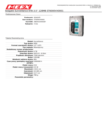PRZEDSIĘBIORSTWO HANDLOWO USŁUGOWE MERX D. MIGACZ, K. PORĘBA SP.J. ul. Nawojowska 88B 33-330 NOWY SĄCZ Seagate Surveillance 6TB 3.5'' 128MB ST6000VX0001 Podstawowe Dane Producent: SEAGATE Kod vendora: ST6000VX0001 Kod EAN: ABEAN-DH40387 Rękojmia: 3 lata Tabela Parametryczna Model: Surveillance Typ dysku: HDD Format szerokości dysku: 3,5'' (LFF) Typ napędu: Wewnętrzny Dodatkowy numer producenta: Pojemność dysku: 6 TB Interfejs dysku: SATA III - 6 Gb/s Prędkość obrotowa: 7200 obr/min Bufor: 128 MB Wielkość sektora dysku: 4Kn Czas pracy pomiędzy awariami 1000000 h (MTBF): Pobór mocy: 8 W Pobór mocy (czuwanie): 0.5 W Wysokość: 2.611 cm Szerokość: 10.185 cm Głębokość: 14.7 cm Waga: 780 g Pozostałe parametry: Powered by TCPDF (www.tcpdf.org)