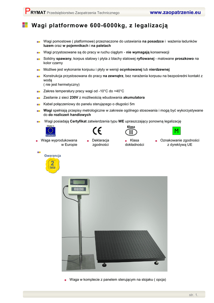 PRYMAT Przedsiębiorstwo Zaopatrzenia Technicznego www.zaopatrzenie.eu Wagi platformowe 600-6000kg, z legalizacją Wagi pomostowe ( platformowe) przeznaczone do ustawiania na posadzce i ważenia ładunków luzem oraz w pojemnikach i na paletach Wagi przystosowane są do pracy w ruchu ciągłym - nie wymagają konserwacji Solidny spawany, korpus stalowy i płyta z blachy stalowej ryflowanej - malowane proszkowo na kolor czarny Możliwe jest wykonanie korpusu i płyty w wersji ocynkowanej lub nierdzewnej Konstrukcja przystosowana do pracy na zewnątrz, bez narażenia korpusu na bezpośredni kontakt z wodą ( nie jest hermetyczny) Zakres temperatury pracy wagi od -10°C do +40°C Zasilanie z sieci 230V z możliwością wbudowania akumulatora Kabel połączeniowy do panelu sterującego o długości 5m Wagi spełniają przepisy metrologiczne w zakresie ogólnego stosowania i mogą być wykorzystywane do do rozliczeń handlowych Wagi posiadają Certyfikat zatwierdzenia typu WE upraszczający ponowną legalizację Waga wyprodukowana w Europie Deklaracja zgodności Klasa dokładności Oznakowanie zgodności z dyrektywą UE Waga w komplecie z panelem sterującym na stojaku ( opcja) str. 1. PRYMAT Przedsiębiorstwo Zaopatrzenia Technicznego www.zaopatrzenie.eu Konstrukcja wagi Korpus wagi 1500kg, z czterema tensometrami Wyprowadzenie przewodu, poziomica oraz tabliczka znamionowa Stopki regulowane, uchylne stal chromowana+guma Funkcje wagi Regulacja zera Tarowanie wielokrotne w pełnym zakresie pomiarowym Wskazania minusowe Przełączanie wskazań netto/brutto Kontrola wartości zadanej Kontrola wartości granicznej Funkcja samoczynnego testu diagnostycznego Panel sterujący KPZ51E-8 z wyświetlaczem ( standardowy ) Solidna obudowa z wytrzymałego ABS Klawiatura pyło- i wodoszczelna zabezpieczona folią Podświetlany wyświetlacz z cyframi o wysokości 25mm oraz symbolami obsługi Osobny włącznik/wyłącznik Dodatkowe wyposażenie panelu sterującego (opcje) Złącze RS232 ( do komputera) Gniazdo drukarki Wyjście przekaźnika High-OK-Low do sterowania innymi urządzeniami ( np. dozownikami) str. 2. PRYMAT Przedsiębiorstwo Zaopatrzenia Technicznego www.zaopatrzenie.eu System ważący Cztery wysokiej jakości niklowane tensometry DMS Stopień ochrony IP67 Klasa pomiarowa III/, Klasa dokładności 0,02%, z dopuszczeniem do legalizacji EU Wagi z platformą 800 x 800 mm Udźwig Wymiar platformy Waga platformowa 800x800mm/600kg Waga platformowa 800x800mm/1200kg 600 kg 1200 kg 800 x 800 mm 800 x 800 mm Wysokość platformy 95 mm Zakres ważenia legalizowanego 95 mm od 4kg do 600kg od 4kg do 1200kg Działka odczytowa 200 g 200g (do 600kg) 500g (powyżej 600kg) Ciężar 60 kg 60 kg 06-201 06-203 Waga platformowa 800x800mm/1500kg Waga platformowa 800x800mm/3000kg 1500 kg 3000 kg 800 x 800 mm 800 x 800 mm 95 mm 95 mm od 10kg do 1500kg od 10kg do 3000kg Działka odczytowa 500 g 500g (do 1500kg) 1kg (powyżej 1500kg) Ciężar 60 kg 60 kg 06-205 06-207 Nr katalogowy Udźwig Wymiar platformy Wysokość platformy Zakres ważenia legalizowanego Nr katalogowy str. 3. PRYMAT Przedsiębiorstwo Zaopatrzenia Technicznego www.zaopatrzenie.eu Wagi z platformą 1000 x 1000 mm Waga platformowa 1000x1000mm/600kg Waga platformowa 1000x1000mm/1200kg Waga platformowa 1000x1000mm/1500kg 600 kg 1200 kg 1500 kg 1000 x 1000 mm 1000 x 1000 mm 1000 x 1000 mm 95 mm 95 mm 95 mm od 4kg do 600kg od 4kg do 1200kg od 10kg do 1500kg Działka odczytowa 200 g 200g (do 600kg) 500g (powyżej 600kg) 500 g Ciężar 80 kg 80 kg 80 kg 06-209 06-211 06-213 Waga platformowa 1000x1000mm/2000kg Waga platformowa 1000x1000mm/3000kg 2000 kg 3000 kg 1000 x 1000 mm 1000 x 1000 mm 95 mm 95 mm od 10kg do 2000kg od 10kg do 3000kg 1 kg 500g (do 1500kg) 1kg (powyżej 1500kg) 80 kg 80 kg 06-215 06-217 Udźwig Wymiar platformy Wysokość platformy Zakres ważenia legalizowanego Nr katalogowy Udźwig Wymiar platformy Wysokość platformy Zakres ważenia legalizowanego Działka odczytowa Ciężar Nr katalogowy str. 4. PRYMAT Przedsiębiorstwo Zaopatrzenia Technicznego www.zaopatrzenie.eu Wagi z platformą 1250 x 830 mm Waga platformowa 1250x830mm/600kg Udźwig 600 kg Wymiar platformy 1250 x 830 mm Wysokość platformy 95 mm Zakres ważenia legalizowanego od 4kg do 600kg Działka odczytowa 200 g Ciężar 83 kg Nr katalogowy 06-219 Udźwig Ciężar Nr katalogowy 1200 kg 1500 kg 1250 x 830 mm 1250 x 830 mm 95 mm 95 mm od 4kg do 1200kg od 10kg do 1500kg 200g (do 600kg) 500g (powyżej 600kg) 500 g 83 kg 83 kg 06-221 06-223 Waga platformowa 1250x8300mm/3000kg 2000 kg 3000 kg Wysokość platformy 95 mm Działka odczytowa Waga platformowa 1250x830mm/1500kg Waga platformowa 1250x830mm/2000kg Wymiar platformy 1250 x 830 mm Zakres ważenia legalizowanego Waga platformowa 1250x830mm/1200kg 1250 x 830 mm 95 mm od 10kg do 2000kg od 10kg do 3000kg 1 kg 500g (do 1500kg) 1kg (powyżej 1500kg) 83 kg 83 kg 06-225 06-227 str. 5. PRYMAT Przedsiębiorstwo Zaopatrzenia Technicznego www.zaopatrzenie.eu Wagi z platformą 1250 x 1000 mm Waga platformowa 1250x1000mm/600kg Waga platformowa 1250x1000mm/1200kg Waga platformowa 1250x1000mm/1500kg 600 kg 1200 kg 1500 kg 1250 x 1000 mm 1250 x 1000 mm 1250 x 1000 mm 95 mm 95 mm 95 mm od 4kg do 600kg od 4kg do 1200kg od 10kg do 1500kg 200 g 200g (do 600kg) 500g (powyżej 600kg) 500 g Ciężar 100 kg 100 kg 100 kg Nr katalogowy 06-229 06-231 06-233 Waga platformowa 1250x1000mm/2000kg Waga platformowa 1250x1000mm/3000kg 2000 kg 3000 kg 1250 x 1000 mm 1250 x 1000 mm 95 mm 95 mm od 10kg do 2000kg od 10kg do 3000kg 1 kg 500g (do 1500kg) 1kg (powyżej 1500kg) Ciężar 100 kg 100 kg Nr katalogowy 06-235 06-237 Udźwig Wymiar platformy Wysokość platformy Zakres ważenia legalizowanego Działka odczytowa Udźwig Wymiar platformy Wysokość platformy Zakres ważenia legalizowanego Działka odczytowa str. 6. PRYMAT Przedsiębiorstwo Zaopatrzenia Technicznego www.zaopatrzenie.eu Wagi z platformą 1250 x 1250 mm Waga platformowa 1250x1250mm/600kg Waga plat