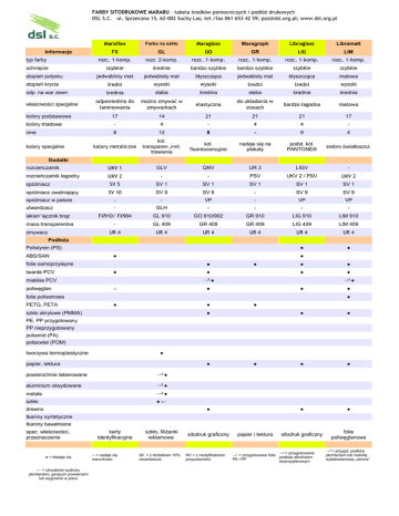 FARBY SITODRUKOWE MARABU – tabela środków pomocniczych i podłóż drukowych DSL S.C. ul. Sprzeczna 15, 62-002 Suchy Las; tel./fax 061 653 42 59; [email protected]; www.dsl.org.pl Maraflex Farba na szkło Maragloss Maragraph Libragloss Libramatt FX GL GO GR LIG LIM typ farby rozc. 1-komp. rozc. 2-komp. rozc. 1-komp. rozc. 1-komp. rozc. 1-komp. rozc. 1-komp. schnięcie szybkie średnie bardzo szybkie bardzo szybkie szybkie szybkie jedwabisty mat jedwabisty mat błyszcząca jedwabisty mat błyszcząca matowa stopień krycia średni wysoki wysoki średni średni wysoki odp. na war zewn średnia słaba średnia słaba średnia średnia odpowiednia do laminowania można zmywać w zmywarkach elastyczna do układania w stosach bardzo łagodna matowa 17 Informacje stopień połysku właściwości specjalne 17 14 21 21 21 kolory triadowe - 4 - 4 4 - inne 8 12 8 - 9 4 kolory metaliczne kol. transparen.,imit. trawienia kol. fluorescencyjne nadaje się na plakaty podst. kol. PANTONE® srebro światłoszcz. rozcieńczalnik UKV 1 GLV QNV UR 3 LIGV - rozcieńczalnik łagodny UKV 2 - - PSV UKV 2 / PSV UKV 2 opóźniacz SV 5 SV 1 SV 1 SV 1 SV 1 SV 1 opóźniacz zwalniający kolory podstawowe kolory specjalne Dodatki SV 10 SV 9 SV 9 - SV 9 SV 9 opóźniacz w paście - - VP - VP VP utwardzacz - GLH - - - - FX910/ FX904 GL 910 GO 910/902 GR 910 LIG 910 LIM 910 - GL 409 GR 409 GR 409 LIG 409 LIM 409 UR 4 UR 4 UR 4 UR 4 UR 4 UR 4 ● ● lakier/ lącznik brąz masa transparentna zmywacz Podłoża Polistyren (PS) ABS/SAN ● ● folie samoprzylepne twarde PCV ● ● ● ● ● ● ● → ● miekkie PCV poliwęglan ● →2 ● 2 ● ○ ● PETG, PETA ● ● folie poliestrowe ● ● ● ● szkło akrylowe (PMMA) ● ● ● ● ● ● sitodruk graficzny folie poliwęglanowe PE, PP przygotowany PP nieprzygotowany poliamid (PA) poliacetal (POM) tworzywa termoplastyczne ● ● papier, tektura powierzchnie lakierowane →2 ● aluminium oksydowane →2 ● metale →2 ● szkło ●← drewno ● ● tkaniny syntetyczne tkaniny bawełniane spec. właściwości, przeznaczenie ● = Nadaje się ← = utrwalenie wydruku płomieniem, gorącym powietrzem lub wygrzanie w piecu karty identyfikacyjne ○ = nadaje się warunkowo szkło, filiżanki reklamowe 2K = z dodatkiem 10% utwardzacza sitodruk graficzny HV = z modyfikatorem przyczepności papier i tektura →2 = przygotowanie →1 = przygotowane folie podłoża alkoholem PE i PP izopropylenowym →3 = przygot. podłoża płomieniem lub metodą wyładowaniową „carona” FARBY SITODRUKOWE MARABU – tabela środków pomocniczych i podłóż drukowych DSL S.C. ul. Sprzeczna 15, 62-002 Suchy Las; tel./fax 061 653 42 59; [email protected]; www.dsl.org.pl Libraprint Libraspeed Maramold Maramold Marapoly Maraplan LIP LIS MACR MPC P PL typ farby rozc. 1-komp. rozc. 1-komp. rozc. 1-komp. Rozc. 1 i 2 komp. Rozc. 2-komp. rozc. 1-komp. schnięcie szybkie bardzo szybkie szybkie szybkie średnie szybkie błyszcząca błyszcząca błyszcząca błyszcząca mocno błyszcząca jedwabisty mat stopień krycia średni średni średni średni wysoki wysoki odp. na war zewn średnia dobra średnia średnia bardzo dobra bardzo dobra bardzo łatwa w druku do formowania próżniowego doskonała do formatowania odporna na wysoką temperaturę wysoka odporność na związki zasadowe odporna na plastyfikatory kolory podstawowe 17 21 17 17 17 13 kolory triadowe 8 8 - - - - inne 1 26 - 1 - 3 druk czterokolorowy odporna nablaknięcie rozc. 1-komp. UKV 2 UKV 1 UKV 1 rozcieńczalnik łagodny PSV UKV 2 / PSV - opóźniacz SV 5 SV 1 SV 1 opóźniacz zwalniający SV 10 SV 9 SV 10 SV 10 VP VP - - - - lakier/ lącznik brąz LIP 910 LIS 910 MACR 910 masa transparentna LIP 409 LIS 409 UR 4 UR 4 Polistyren (PS) ● ● ABS/SAN ● ● folie samoprzylepne ● ● twarde PCV ● ● miekkie PCV →2 ● Informacje stopień połysku właściwości specjalne kolory specjalne odporna na rozc. 1 i 2 komp. blaknięcie lakier do druku srebrny i złoty Dodatki rozcieńczalnik opóźniacz w paście utwardzacz zmywacz UKV 1 PV PLV - - - SV 1 SV 5 - SV 10 - - - - H2 H1 - MPC 910 P 910 - - - P 409 - UR 4 UR 4 UR 4 UR 4 Podłoża poliwęglan ● →2 ● ● ● folie poliestrowe PETG, PETA ● szkło akrylowe (PMMA) ● ● ● ● ● →3 ● PE, PP przygotowany PP nieprzygotowany ● poliamid (PA) poliacetal (POM) ● tworzywa termoplastyczne papier, tektura ● ● powierzchnie lakierowane →2 ● aluminium oksydowane →2 ● metale →2 ● szkło ● drewno ● tkaniny syntetyczne tkaniny bawełniane spec. właściwości, przeznaczenie ● = Nadaje się ← = utrwalenie wydruku płomieniem, gorącym powietrzem lub wygrzanie w piecu sitodruk graficzny ○ = nadaje się warunkowo PMMA 2K = z dodatkiem 10% utwardzacza IMD na PMMA HV = z modyfikatorem przyczepności IMD na poliwęglan skrzynki nabutelki z PE / PP →2 = przygotowanie →1 = przygotowane folie podłoża alkoholem PE i PP izopropylenowym miękkie pcv plandeki →3 = przygot. podłoża płomieniem lub metodą wyładowaniową „carona” FARBY SITODRUKOWE MARABU – tabela środków pomocniczych i podłóż drukowych DSL S.C. ul. Sprzeczna 15, 62-002 Suchy Las; tel./fax 061 653 42 59; [email protected]; www.dsl.org.pl Maraprop Marapur Marapol Marastar Maraflor Texaprint PP PU PY SR TK TXT typ farby rozc. 1-komp. rozc. 2-komp. rozc. 1 i 2komp. rozc. 1 i 2komp. rozc. 2-komp. wodna 1-komp. schnięcie średnie średnie średnie bardzo szybkie szybkie szybkie matowa matowa średni, TXT 170 wysoki Informacje stopień połysku jedwabisty mat mocno błyszcząca mocno błyszcząca mocno błyszcząca stopień krycia średni wysoki wysoki wysoki wysoki odp. na war zewn średnia bardzo dobra średnia bardzo dobra średnia wysoki nieprzygotowane pp odporna na chemikalia elastyczna odporna na benzynę odporna na pranie utwardzana na gorąco kolory podstawowe 14 21 21 21 17 12 kolory triadowe 4 - - - - 3 inne 1 8 1 36 1 - biała mocnokryjąca odcienie d
