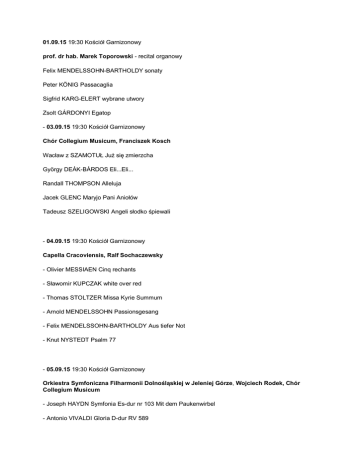 01.09.15 19:30 Kościół Garnizonowy prof. dr hab. Marek Toporowski - recital organowy Felix MENDELSSOHN-BARTHOLDY sonaty Peter KÖNIG Passacaglia Sigfrid KARG-ELERT wybrane utwory Zsolt GÁRDONYI Egatop - 03.09.15 19:30 Kościół Garnizonowy Chór Collegium Musicum, Franciszek Kosch Wacław z SZAMOTUŁ Już się zmierzcha György DEÁK-BÁRDOS Eli...Eli... Randall THOMPSON Alleluja Jacek GLENC Maryjo Pani Aniołów Tadeusz SZELIGOWSKI Angeli słodko śpiewali - 04.09.15 19:30 Kościół Garnizonowy Capella Cracoviensis, Ralf Sochaczewsky - Olivier MESSIAEN Cinq rechants - Sławomir KUPCZAK white over red - Thomas STOLTZER Missa Kyrie Summum - Arnold MENDELSSOHN Passionsgesang - Felix MENDELSSOHN-BARTHOLDY Aus tiefer Not - Knut NYSTEDT Psalm 77 - 05.09.15 19:30 Kościół Garnizonowy Orkiestra Symfoniczna Filharmonii Dolnośląskiej w Jeleniej Górze, Wojciech Rodek, Chór Collegium Musicum - Joseph HAYDN Symfonia Es-dur nr 103 Mit dem Paukenwirbel - Antonio VIVALDI Gloria D-dur RV 589 - Giuseppe VERDI Uwertura do opery Nieszpory sycylijskie