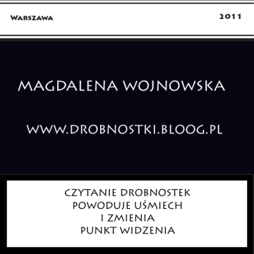 2011 Warszawa Il tarivid MAGDALENA WOJNOWSKA 1 WWW.DROBNOSTKI.BLOOG.PL CZYTANIE DROBNOSTEK POWODUJE UŚMIECH I ZMIENIA PUNKT WIDZENIA za fri Pożyczę: point of view Gdy zamykamy drzwi do mieszkania, lodówka i pralka schodzą się na ploty. Lodówka GRUBĄ KRESKĘ 2 narzeka na brak prywatności. Żali się, że każdy zagląda do niej bez pukania. A pralka? Pralka Opis przedmiotu: czarna 200-centymetrowa kres- wyciąga nasze brudy... Najbardziej jednak narzeka ka, bez nadruków służąca do oddzielania się od komputer − nie dość, że haruje dniami i nocami, trudnych spraw czy wszelkich wspomnień; świetnie to i tak mu nie płacą. sprawdza się w sytua-cjach, gdy ciężko o czymś Podobno szafa ma dość otwierania się na innych, (o kimś) zapomnieć. a lampka świecenia przykładem. Stan: bardzo dobry − używana kilkakrotnie. Skąd to wiem? Od czajnika. Powiedział mi, bo gwiżdże na nich wszystkich. Pasuje do każdego życia. 3 bajeczka 4 Pudełko Wspomnień Za naszą-klasą i innymi stronami www od kilku lat W zwykłych pudełkach, ozdobionych kolorowym żyje wielki granatowy potwór o imieniu Facebook. papierem, chowamy swoje niezwykłe życie. Otrzymane Jak głosi legenda, a raczej historia, uwodzi wszyst- listy, pełne wielkich emocji i pytań bez odpowiedzi, kich, którzy zawitają w jego strony. wypisane kartki z zakątków świata, spisane myśli na Iluż to śmiałków próbowało mu się oprzeć! Iluż luźnych kartkach. Są i bilety z koncertów, piękne przysięgało, że nie ulegnie urokowi Facebooka. Na papeterie i niewysłane listy. I żyją w nich ludzie. próżno! Gdy tylko przekroczyli próg jaskini Dawno zapomniani, uwiecznieni w listach, w podpisie (a raczej odwiedzili jego stronę), oddawali na zdjęciu. (a może lepiej: wrzucali) wszystko: myśli, pasje... Nie chciałabym nikogo straszyć, ale Z całym szacunkiem do obecnych czasów, pendrive to podobno Facebook pożera w całości. nie to samo. 5 tERAZ aLBO nIGDY kALOSZE Wraz z jesienią w całej Polsce ruszyła akcja “Podziel się par- Najtrudniej jest żyć teraz. Dzisiaj. asolem”. Celem inicjatywy jest propagowanie prospołecznej postawy wobec zapominalskich i nierozsądnych. Inaczej 6 Bo my ciągle żyjemy jutro albo wczoraj. mówiąc: zamiast współczuć tym, którzy zapomnieli para- Planujemy, gdybamy, ustalamy terminy, wspominamy, sola albo nie przewidzieli deszczu, zaproś ich pod osłonę patrzymy za siebie i przed siebie. z tkaniny rozpiętej na składanych drutach przymocowanych do pręta, chroniącą przed opadem atmosferycznym Gdyby w szkole życia był egzamin z przedmiotu spadającym z chmur w formie kropel (nie jest łatwo znaleźć “Carpe Diem” , myślę, że większość z nas by go oblała. synonimy słów “parasol” i “deszcz”...). Zaproszeni pod parasol mogą odwdzięczyć się zapraszającym symboliczną Na szczęście do poprawki można podchodzić złotówką, przemiłą pogawędką bądź trzymaniem pręta. codziennie. Jak zapewniają organizatorzy akcji, okazji do dzielenia się parasolem tej jesieni będzie wiele. Dla tych, którzy nie podejmą wyzwania, przygotowano specjalne nieprzemakalne przypinki “Lubię być samolubEM”. 7 Bałgan Każdego dnia porządkuję swoje życie. nonsens Jeśli sens naszego życia jest głęboko ukryty, to czasem mam ochotę stanąć na środku świata i krzyknąć: Porażki chowam do szafy. 8 Wstyd ścieram razem z kurzem. Pozytywne wspomnienia starannie wycieram i ustawiam na komodzie. Sukcesy odkurzam. Lubię te porządki. Po prostu, mam pewność, że wszystko jest na swoim miejscu. Ok, SENS. Nie chowaj się − wyłaź. Żarty się skończyły. 9 ER Psychotest Sprawdź, jakim typem pasażera autobusu jesteś. Górniczo-hutnicza orkiestra dęta robi nam paparara, robi nam paparara (...) Ryba rak ryba rak a tam mamy tatarak 10 Boża radość jak rzeka, Boża radość wypełnia duszę mą. Ram pam pam, parara ram, ram pam pam, parara Kurkiem kranu kręci kruk, kroplą tranu brudząc bruk, a przy kranie, robiąc pranie, królik gra na fortepianie. Czarna krowa w kropki bordo gryzła trawę kręcąc mordą. Kręcąc mordą i rogami gryzła trawę wraz z jaskrami. Wypowiedzieć nie umiem, to chociaż sobie popiszę. Trrrrrrrrrrrrrrrrrrrrrrrrrrrrrrrrrrrrrrrrrrrrrrr Podróżnik − z niegasnącym zaciekawieniem podziwiasz widoki za oknem, mimo że jeździsz tą trasą codziennie. Kierowca numer 2 − wydaje Ci się, że kierujesz autobusem, podczas skręcania przechylasz się odpowiednio w prawą lub lewą stronę. W hamowaniu jesteś najlepszy. Czytelnik − czytasz wszystko: książki, smsy, tablice informacyjne, regulaminy Konsultant telefoniczny − rozmawiasz przez telefon o wszystkim i o niczym, udzielasz porad, wysłuchujesz zażaleń Morfeusz − bezskutecznie walczysz z dopadającą Cię sennością DJ − nadajesz muzyczne brzmienia w autobusie, nie pytasz o zgodę Sportowiec − preferujesz jazdę bez trzymanki Strażnik Teksasu − pilnujesz drzwi Hamlet − zdarza Ci się prowadzić monolog, którego słucha nie tylko Twój rozmówca, ale i podróżnicy, kierowcy numer 2, czytelnicy , sportowcy i strażnicy Teksasu. Gapa − wiadomo − bez biletu. 11 Potyczki M.W. Niebezpieczne Związki Moja znajomość z rokiem 2009 r. dobiega końca. Powiem 12 Przyznaję, że czasem wyłazi ze mnie kawał Magdy. Nie Madziuni, Magdalenki, Magdusi, Madzinki czy Madzi... otwarcie: nie zaiskrzyło między nami. Dlaczego? Na początku naszej znajomości (notabene poznaliśmy się w Warszawie) 2009 snuł dalekosiężne plany i obiecywał gruszki na wierzbie. Naiwnie wierzyłam, że będzie zupełnie inny niż cwaniaczek 2008 czy bezmyślny 2007. Pomyliłam się. Jak każdy z “byłych” Podkładam wtedy słowne miny, wiążę sznurówki złośliwości, chowam się za ironią i zabijam puentą. miał swoje mocne i słabe strony. Miłe było to, że nie przyszedł z pustymi rękoma. Przyniósł prawo jazdy, pracę i kilka trafnych decyz