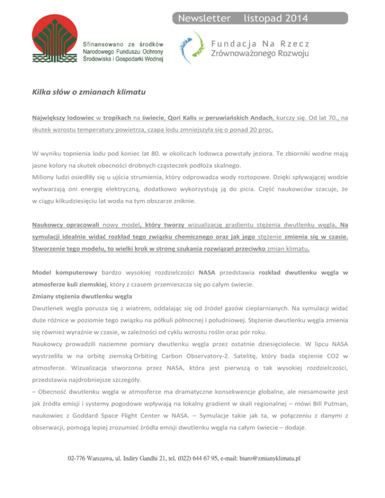 Kilka słów o zmianach klimatu Największy lodowiec w tropikach na świecie, Qori Kalis w peruwiańskich Andach, kurczy się. Od lat 70., na skutek wzrostu temperatury powietrza, czapa lodu zmniejszyła się o ponad 20 proc. W wyniku topnienia lodu pod koniec lat 80. w okolicach lodowca powstały jeziora. Te zbiorniki wodne mają jasne kolory na skutek obecności drobnych cząsteczek podłoża skalnego. Miliony ludzi osiedliły się u ujścia strumienia, który odprowadza wody roztopowe. Dzięki spływającej wodzie wytwarzają oni energię elektryczną, dodatkowo wykorzystują ją do picia. Część naukowców szacuje, że w ciągu kilkudziesięciu lat woda na tym obszarze zniknie. Naukowcy opracowali nowy model, który tworzy wizualizację gradientu stężenia dwutlenku węgla. Na symulacji idealnie widać rozkład tego związku chemicznego oraz jak jego stężenie zmienia się w czasie. Stworzenie tego modelu, to wielki krok w stronę szukania rozwiązań przeciwko zmian klimatu. Model komputerowy bardzo wysokiej rozdzielczości NASA przedstawia rozkład dwutlenku węgla w atmosferze kuli ziemskiej, który z czasem przemieszcza się po całym świecie. Zmiany stężenia dwutlenku węgla Dwutlenek węgla porusza się z wiatrem, oddalając się od źródeł gazów cieplarnianych. Na symulacji widać duże różnice w poziomie tego związku na półkuli północnej i południowej. Stężenie dwutlenku węgla zmienia się również wyraźnie w czasie, w zależności od cyklu wzrostu roślin oraz pór roku. Naukowcy prowadzili naziemne pomiary dwutlenku węgla przez ostatnie dziesięciolecie. W lipcu NASA wystrzeliła w na orbitę ziemską Orbiting Carbon Observatory-2. Satelitę, który bada stężenie CO2 w atmosferze. Wizualizacja stworzona przez NASA, która jest pierwszą o tak wysokiej rozdzielczości, przedstawia najdrobniejsze szczegóły. – Obecność dwutlenku węgla w atmosferze ma dramatyczne konsekwencje globalne, ale niesamowite jest jak źródła emisji i systemy pogodowe wpływają na lokalny gradient w skali regionalnej – mówi Bill Putman, naukowiec z Goddard Space Flight Center w NASA. – Symulacje takie jak ta, w połączeniu z danymi z obserwacji, pomogą lepiej zrozumieć źródła emisji dwutlenku węgla na całym świecie – dodaje. 02-776 Warszawa, ul. Indiry Gandhi 21, tel. (022) 644 67 95, e-mail: [email protected] Wizualizacja atmosfery Wizualizacja stężenia dwutlenku węgla powstała dzięki modelowi komputerowemu GEOS-5, który został stworzony przez naukowców z NASA. Symulacja jest częścią projektu „Nature Run”. Program ten zbiera dane o warunkach atmosferycznych, emisji gazów cieplarnianych ze źródeł naturalnych i antropogenicznych. Model na podstawie tych informacji tworzy symulację naturalnych zachować atmosfery ziemskiej. Wizualizacje obejmują okres od maja 2005 roku do czerwca 2007 roku.Naukowcy ulepszali ten model przez kilka lat. Nowszą wersję badacze przedstawią społeczności naukowej na konferencji naukowej w tym tygodniu w Nowym Orleanie w Stanach Zjednoczonych. – Jesteśmy bardzo podekscytowani, że możemy podzielić się tym zestawem danych – powiedział Putman. – Mamy nadzieję, że kompleksowość tego modelu będzie podstawą do badań i poszerzania wiedzy o Ziemi – dodaje. Rekordowy poziom dwutlenku węgla Wiosną 2014 roku dwutlenek węgla w atmosferze osiągnął rekordowo wysoki poziom. Stężenie gazów cieplarnianych w atmosferze ciągłe rośnie, głównie w wyniku spalania paliw kopalnych. Stworzony model pomoże naukowcom zrozumieć procesy, które najbardziej napędzają wzrost stężenia dwutlenku węgla w atmosferze. Rozdzielczość modelu jest około 64 razy większa od typowych modeli klimatycznych, które przedstawiają zmienne takie jak temperatura, ciśnienie i wiatr na siatce poziomej podzielonej na pola o szerokości około 50 km, przy wizualizacji Natura Run wykorzystano siatkę z pól około 7 km. Co słychać w projekcie Zakładka „abecadło klimatu” została uruchomiona na portalu edukacyjnym www.klimatdladzieci.pl. Zakładka jest w całości poświęcona tematyce zmianom klimatu, a treści są dostosowane do możliwości percepcyjnych najmłodszych dzieci. W zakładce można znaleźć 12 gier i zabaw edukacyjnych dla najmłodszych, które poprzez zabawę będą mogły zaznajomić się z tematyką przeciwdziałania zmianom klimatu. Ponadto, zachęcamy do śledzenia informacji w podzakładce SZKOLENIA I WARSZTATY, gdyż już w krótce znajdą się tam informacje na temat szkoleń realizowanych dla nauczycieli oraz warsztatów dla dzieci. 02-776 Warszawa, ul. Indiry Gandhi 21, tel. (022) 644 67 95, e-mail: [email protected] Czy wiesz, że… Spalając węgiel, ropę i gaz produkujemy dwutlenek węgla. Co roku dziesiątki miliardów ton tego gazu trafiają do atmosfery. Od początku epoki przemysłowej jego ilość w atmosferze z niecałych 0.03% wzrosła do blisko 0.04% i rośnie coraz szybciej. Te ułamki procenta to bardzo dużo - wiemy, że w ciągu ostatnich setek tysięcy lat nigdy w atmosferze nie było go tak wiele. Także tempo wzrostu stężenia dwutlenku węgla jest bezprecedensowe w historii. Temperatura Ziemi w ciągu 100 lat wzrosła jedynie o 0.8°C, a już obserwujemy znaczące zmiany klimatu. Zmiany klimatu dopiero się rozpoczęły. Gazy cieplarniane zwiększają docierającą do powierzchni Ziemi energię, ale oceany, mające olbrzymią bezwładność cieplną, jeszcze się nie ogrzały znacząco. Znacznie wyraźniejsze ocieplenie, sięgające 2-3°C obserwujemy nad lądami, szczególnie we wnętrzu Azji, oraz w Arktyce. Na stały, ale powolny wzrost działania gazów cieplarnianych, nakładają się inne wieloletnie fluktuacje, szczególnie aktywności słonecznej i prądów morskich. Wstajemy rano i patrzymy przez okno. Pada czy jest słonecznie? Jest zimno czy też ciepło? To są pytania o pogodę. Pogoda to stan atmosfery w danej chwili. Może się zmieniać z