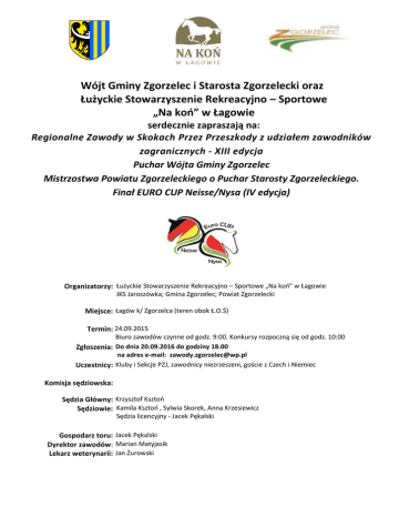 Wójt Gminy Zgorzelec i Starosta Zgorzelecki oraz Łużyckie Stowarzyszenie Rekreacyjno – Sportowe „Na koń” w Łagowie serdecznie zapraszają na: Regionalne Zawody w Skokach Przez Przeszkody z udziałem zawodników zagranicznych - XIII edycja Puchar Wójta Gminy Zgorzelec Mistrzostwa Powiatu Zgorzeleckiego o Puchar Starosty Zgorzeleckiego. Finał EURO CUP Neisse/Nysa (IV edycja) Organizatorzy: Łużyckie Stowarzyszenie Rekreacyjno – Sportowe „Na koń” w Łagowie JKS Jaroszówka; Gmina Zgorzelec; Powiat Zgorzelecki Miejsce: Łagów k/ Zgorzelca (teren obok Ł.O.Ś) Termin: 24.09.2015 Biuro zawodów czynne od godz. 9:00. Konkursy rozpoczną się od godz. 10:00 Zgłoszenia: Do dnia 20.09.2016 do godziny 18.00 na adres e-mail: [email protected] Uczestnicy: Kluby i Sekcje PZJ, zawodnicy niezrzeszeni, goście z Czech i Niemiec Komisja sędziowska: Sędzia Główny: Krzysztof Ksztoń Sędziowie: Kamila Ksztoń , Sylwia Skorek, Anna Krzesiewicz Sędzia licencyjny - Jacek Pękalski Gospodarz toru: Jacek Pękalski Dyrektor zawodów: Marian Matyjasik Lekarz weterynarii: Jan Żurowski Program Zawodów: Sobota, 24.09.2016 - Zawody regionalne: 1. Konkurs klasy LL- 90 cm dokładności /238.1.1/ 2. Konkurs klasy L-100 cm /260.3/ MISTRZOSTWA POWIATU ZGORZELECKIEGO 260.3 - KONKURS NA ZASADZIE KONKURSU ZWYKŁEGO. PO ZAKOŃCZONYM PRZEJEŹDZIE (po zamknięciu czasu) W CELU ANULOWANIA JEDNEJ ZRZUTKI Z PARKURU MOŻNA SKOCZYĆ SPECJALNIE PRZYGOTOWANĄ PRZESZKODĘ (wyższą o 10 cm i trudniejszą, można ją jechać ale nie trzeba, pokonana bezbłędnie przeszkoda daje minus 4 punkty, zrzucona – dopisuje kolejne się 4 punkty karne). Zawodnik podejmuje decyzję o skoku przeszkody dodatkowej po ukończeniu parkuru podstawowego. 3. Konkurs klasy L- 100cm licencyjny 4. Konkurs klasy P-110cm dwufazowy /274.5.2/ /238.1.2/ Finał Euro Cup Neisse/Nysa 5. Konkurs klasy N- 120 dokładności z rozgrywką /238.1.2/ Puchar Wójta Gminy Zgorzelec 6. Konkurs klasy C- 130 cm zwykły /238.2.1/ Rodzaj podłoża:Parkur i rozprężania – trawiaste podłoże Opłaty :Konkursy regionalne : 1, 2 3, 4, 5 6 Listy startowe: 30zł / 8 EUR 40zł / 10 EUR 50zł / 12 EUR Listy startowe będą widoczne na stronie: www.nakonwlagowie.pl najpóźniej 20.09.2015 (pt.) od godz. 18.00 Sprawy organizacyjne: Zgłoszenia powinny zawierać: imię i nazwisko zawodnika, jego nr PZJ/WZJ, przynależność klubową, datę ważności badań lekarskich o ile nie ma ich w bazie PZJ , nr konkursu i ilość przejazdów; Imię konia, nr PZJ/ WZJ; Zawodnicy zobowiązani są do uiszczenia opłaty w gotówce na minimum 1 godzinę przed rozpoczęciem konkursu. Zmiany na listach startowych po terminie zgłoszeń lub w dniu zawodów: opłata 20 zł. Członkowie Stowarzyszenia NA KOŃ z zapłaconą składką członkowską za 2016 rok są zwolnieni z opłaty startowej. Organizator nie zapewnia boksów dla koni na terenie zawodów. Organizator umożliwia darmowe przenocowanie konia w stajni ok. 3 km od miejsca zawodów na własną odpowiedzialność. Organizator nie ponosi odpowiedzialności za jakiekolwiek szkody na zdrowiu lub mieniu ani zawodników ani koni podczas ich pobytu w stajni jak również podczas transportu. Dokumentacja zgodnie z przepisami PZJ. Obowiązują aktualne badania weterynaryjne koni oraz szczepienia. Bez w/w dokumentów konie nie będą dopuszczone do startów. Obowiązuje posiadanie numerów startowych zawodnika przypiętych w widocznym miejscu Mistrzem Powiatu Zgorzeleckiego zostaje osoba mieszkająca na terenie Powiatu Zgorzeleckiego. Niezależnie prowadzona będzie klasyfikacja dla wszystkich zawodników. Osoby nieletnie proszone są o przedstawienie pisemnej zgody rodziców na start w zawodach. Na całym terenie zawodów, wszystkie osoby dosiadające koni obowiązuje noszenie prawidłowo zapiętego ochronnego nakrycia głowy (kask) Organizator nie ponosi odpowiedzialności za wypadki, szkody i kradzieże podczas zawodów. Organizator zastrzega sobie prawo do zmiany w programie zawodów, a w przypadku niewystarczającej liczby zgłoszeń - do odwołania niektórych konkursów lub ograniczenia puli nagród finansowych. W PRZYPADKU REZYGNACJI Z UDZIAŁU W ZAWODACH, INFORMACJE NALEŻY PODAĆ NAJPÓŹNIEJ DO CZWARTKU 22.09.2016r. DO GODZINY 16:00 na adres:[email protected] NAGRODY W KONKURSACH Konkursy regionalne Nr. 1. Konkurs LL-90 cm Nagrody Flot’s, drobne nagrody rzeczowe za czyste przejazdy 2. L-100 cm 3. 4. L1-100 cm LICENCYJNY P-110 cm 5. N-120 cm 6. C – 130 cm Flot’s, puchary i nagrody rzeczowe za miejsca I – III Puchar, flo, nagroda rzeczowa dla Mistrza Powiatu Zgorzeleckiego Flot’s Flot’s, puchary za miejsca I-III, nagrody pieniężne za pięć pierwszych miejsc: I = 250 zł; II = 200 zł; III = 150 zł; IV = 80 zł; V = 50 zł! Osobno puchary, flo i nagrody pieniężne otrzymuje trzech najlepszych finalistów cyklu Euro Cup Neisse/Nysa IV edycja Flot’s, puchary za miejsca I-III, nagrody pieniężne za pięć pierwszych miejsc: : I = 300 zł; II = 250 zł; III = 200 zł; IV = 100 zł; V = 50 zł! Flot’s, puchary za miejsca I-III, nagrody pieniężne za trzy pierwsze miejsca: I = 400 zł; II = 300 zł; III = 200 zł! Organizator zastrzega sobie możliwość zmiany wysokości i/lub formy nagród lub w przypadku małej frekwencji lub miejsc ex aeqo KODEKS POSTĘPOWANIA Z KONIEM: Polski Związek Jeździecki prosi wszystkie osoby zaangażowane w jakikolwiek sposób w sporty konne, o przestrzeganie poniżej przedstawionego kodeksu oraz zasady, że dobro konia jest najważniejsze. Dobro konia musi być zawsze i wszędzie uwzględniane w sportach konnych i nie może być podporządkowane współzawodnictwu sportowemu ani innym celom np. komercyjnym. I. Na wszystkich etapach treningu i przygotowań konia do startu w zawodach, dobro konia musi stać ponad wszelkimi innymi wymaganiami. Dotyczy to stałej opieki, metod treningu, starannego obrządku, kuci a i transportu. II. Konie i jeźdźcy muszą być wytrenowani