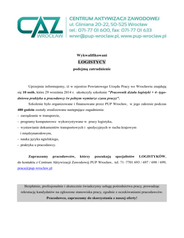 Wykwalifikowani LOGISTYCY podejmą zatrudnienie Uprzejmie informujemy, iż w rejestrze Powiatowego Urzędu Pracy we Wrocławiu znajdują się 10 osób, które 29 września 2014 r. ukończyły szkolenie "Pracownik działu logistyki + 4- tygodniowa praktyka u pracodawcy (w pełnym wymiarze czasu pracy)". Szkolenie było organizowane i finansowane przez PUP Wrocław, w jego zakresie podczas 480 godzin zostały zrealizowane następujące zagadnienia: - zarządzanie w transporcie, - programy komputerowe wykorzystywane w pracy logistyka, - wystawianie dokumentów transportowych i spedycyjnych w ruchu krajowym i międzynarodowym, - nauka języka ngielskiego, - praktyka u pracodawcy. Zapraszamy pracodawców, którzy poszukują specjalistów LOGISTYKÓW, do kontaktu z Centrum Aktywizacji Zawodowej PUP Wrocław, tel. 71–7701 693 / 697 / 698 / 699, [email protected] Bezpłatnie, profesjonalnie i skutecznie świadczymy usługę pośrednictwa pracy, prowadząc rekrutację kandydatów na zgłoszone stanowiska pracy, zgodnie z oczekiwaniami pracodawców. Pracodawco, zapraszamy do skorzystania z naszej oferty! Wykwalifikowani PROGRAMIŚCI w języku .Net i C# podejmą zatrudnienie Uprzejmie informujemy, iż w rejestrze Powiatowego Urzędu Pracy we Wrocławiu znajduje się 11 osób, które w III kwartale 2014 roku ukończyły szkolenie „Programowanie w języku .Net i C# wraz z 4-tyg. praktyką u pracodawcy w pełnym wymiarze czasu pracy”. Szkolenie było organizowane i finansowane przez PUP Wrocław, w jego zakresie w trakcie 584 godzin zostały zrealizowane następujące zagadnienia: - programowanie w języku C# i VB, - programowanie obiektowe, - nauka technologii webowych, JavaScript, SQL,XML, - obsługa MS Visual Studio, - wzorce projektowe, testy jednostkowe, systemy kontroli wersji, Framework 3.5, 4.0 i 4.5, - doskonalenie branżowego słownictwa w języku angielskim, - praktyczne wykorzystanie wiedzy nabytej na szkoleniu podczas praktyki u pracodawcy. Absolwenci szkolenia posiadają wykształcenie wyższe w kierunkach studiów z rozszerzonym programem nauczania matematyki oraz znajomość języka angielskiego w mowie i piśmie. Zapraszamy pracodawców, którzy w celu zatrudnienia poszukują PROGRAMISTÓW, do kontaktu z Centrum Aktywizacji Zawodowej PUP Wrocław, tel. 71–77 01 693/697/698/699, [email protected] Bezpłatnie, profesjonalnie i skutecznie świadczymy usługę pośrednictwa pracy, prowadząc rekrutację kandydatów na zgłoszone stanowiska pracy, zgodnie z oczekiwaniami pracodawców. Pracodawco, zapraszamy do skorzystania z naszej oferty! Wykwalifikowani PROGRAMIŚCI w języku JAVA podejmą zatrudnienie Uprzejmie informujemy, iż w rejestrze Powiatowego Urzędu Pracy we Wrocławiu znajduje się 19 osób, które w dniu 2 października 2014 r. ukończyły szkolenie „Programowanie w języku JAVA + 4- tygodniowa praktyka u pracodawcy (w pełnym wymiarze czasu pracy)”. Szkolenie było organizowane i finansowane przez PUP Wrocław, w jego zakresie w trakcie 584 godzin zostały zrealizowane następujące zagadnienia: - programowanie w JAVA SE/J2EE, - programowanie obiektowe, - znajomość baz danych (Oracle, SQL), - znajomość wzorców projektowych, - doskonalenie branżowego słownictwa w języku angielskim, - praktyczne wykorzystanie wiedzy nabytej na szkoleniu podczas praktyki u pracodawcy. Absolwenci szkolenia posiadają wykształcenie wyższe w kierunkach studiów z rozszerzonym programem nauczania matematyki oraz znajomość języka angielskiego w mowie i piśmie. Zapraszamy pracodawców, którzy w celu zatrudnienia poszukują PROGRAMISTÓW, do kontaktu z Centrum Aktywizacji Zawodowej PUP Wrocław, tel. 71–77 01 693/697/698/699, [email protected] Bezpłatnie, profesjonalnie i skutecznie świadczymy usługę pośrednictwa pracy, prowadząc rekrutację kandydatów na zgłoszone stanowiska pracy, zgodnie z oczekiwaniami pracodawców. Pracodawco, zapraszamy do skorzystania z naszej oferty! Wykwalifikowani PROGRAMIŚCI w języku C++ podejmą zatrudnienie Uprzejmie informujemy, iż w rejestrze Powiatowego Urzędu Pracy we Wrocławiu znajduje się 10 osób, które we wrześniu i październiku 2014 r. ukończyły szkolenie „Programowanie w języku C++ i 4-tygodniowa praktyka u pracodawcy (w pełnym wymiarze czasu pracy)”. Szkolenie było organizowane i finansowane przez PUP Wrocław, w jego zakresie w trakcie 560 godzin zostały zrealizowane następujące zagadnienia: - programowanie obiektowe, - algorytmy STL, - wzorce projektowe, - system operacyjny Linux, - wielowątkowość oraz mechanizmy synchronizacji, - doskonalenie branżowego słownictwa w języku angielskim, - praktyczne wykorzystanie wiedzy nabytej naszkoleniu podczas praktyki u pracodawcy. Absolwenci szkolenia posiadają wykształcenie wyższe w kierunkach studiów z rozszerzonym programem nauczania matematyki oraz znajomość języka angielskiego w mowie i piśmie. Zapraszamy pracodawców, którzy w celu zatrudnienia poszukują PROGRAMISTÓW, do kontaktu z Centrum Aktywizacji Zawodowej PUP Wrocław, tel. 71–77 01 693/697/698/699, [email protected] Bezpłatnie, profesjonalnie i skutecznie świadczymy usługę pośrednictwa pracy, prowadząc rekrutację kandydatów na zgłoszone stanowiska pracy, zgodnie z oczekiwaniami pracodawców. Pracodawco, zapraszamy do skorzystania z naszej oferty! Wykwalifikowani SPAWACZE metodą MAG podejmą zatrudnienie Uprzejmie informujemy, iż w rejestrze Powiatowego Urzędu Pracy we Wrocławiu znajduje się 6 osób, które w sierpniu 2014 r. ukończyły szkolenie "Spawanie zaawansowane metodą MAG stali węglowych konstrukcyjnych zakończone egzaminem TUV + 2-tyg. praktyka u pracodawcy (w pełnym wymiarze czasu pracy)". Szkolenie, organizowane i finansowane przez PUP Wrocław, zostało zrealizowane przez firmę AIR PRODUCT Sp. z o. o., a w jego zakresie w trakcie 296 godzin zostały zrealizowane następujące zagadnienia: - spawanie stali węglowych konstrukcyjnych MAG, - egzamin TÜV