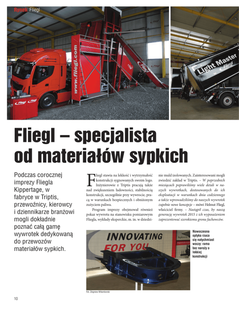 Rynek Fliegl Fliegl – specjalista od materiałów sypkich Podczas corocznej imprezy Fliegla Kippertage, w fabryce w Triptis, przewoźnicy, kierowcy i dziennikarze branżowi mogli dokładnie poznać całą gamę wywrotek dedykowaną do przewozów materiałów sypkich. F liegl stawia na lekkość i wytrzymałość konstrukcji sygnowanych swoim logo. Inżynierowie z Triptis pracują także nad zwiększeniem ładowności, stabilnością konstrukcji, szczególnie przy wywrocie, pracą w warunkach bezpiecznych i obniżonym zużyciem paliwa. Program imprezy obejmował również pokaz wywrotu na stanowisku pomiarowym Fliegla, wykłady eksperckie, m. in. w dziedzi- Nowoczesna optyka rzuca się natychmiast woczy: rama bez naroży o lekkiej konstrukcji Fot. Zbigniew Witamborski 10 nie muld izolowanych. Zainteresowani mogli zwiedzić zakład w Triptis. – W poprzednich miesiącach poprawiliśmy wiele detali w naszych wywrotkach, dostosowanych do ich eksploatacji w warunkach dnia codziennego a także wprowadziliśmy do naszych wywrotek zupełnie nowe koncepcje – mówi Helmut Fliegl, właściciel firmy. – Nastąpił czas, by naszą generację wywrotek 2015 z ich wyposażeniem zaprezentować szerokiemu gronu fachowców. Dzięki lekkiej konstrukcji masa własna Light Master Agrar wynosi 6750 kg. Mulda osadzona jest w stabilnej ramie stalowej o zredukowanej masie. Dodatkowe oszczędności zapewnia zastosowanie w konstrukcji naczepy innych lekkich komponentów, przykładowo osi. Lekka mulda stalowa jest pod względem niskich kosztów alternatywą dla powszechnie używanych muld aluminiowych. Naczepa oferuje, oprócz wysokiej ładowności, także możliwość transportu wymagających ładunków, posiada dopuszczenie typu EG, pozwalające na jej użytkowanie we wszystkich krajach EU. Przemyślane na okrągło Fliegl rozszerzył, i tak już obszerną, paletę swoich wywrotek o nowy pojazd: lekką naczepę Light Master Agrar INNE NOWOŚCI * Mechanizm wywrotu przesunięto do przodu, pomiędzy osie, dla ochrony przed zanieczyszczeniami na placach budowy i w terenie. * Przesunięcie podestu w kierunku cylindra hydraulicznego, w celu redukcji wysokości pojazdu przy wywrocie muldy i zapewnienia przestrzeni oddzielającej podest i przewody, a tym samym zmniejszenie ryzyka uszkodzenia tych ostatnich. Nowoczesna optyka rzuca się natychmiast w oczy: rama bez naroży o lekkiej konstrukcji. W ten sposób Fliegl redukuje masę pojazdu i zwiększa ładowność. Jednocześnie osiągnięto lepszą stabilność, pozwalającą na optymalne rozłożenie działających pionowo sił podczas wywrotu. W dolnej części zaokrąglonej ramy znajduje się lekko do góry zagięty stalowy profil, Helmut Fliegl, właściciel firmy: Nastąpił czas, by naszą generację wywrotek 2015 z ich wyposażeniem zaprezentować szerokiemu gronu fachowców ułatwiający sprzęganie naczepy, ograniczając jej uszkodzenia. Owalny kształt ułatwia manewrowanie, ponieważ bez naroży oferowane jest więcej miejsca w obrębie sprzęgu naczepy. Zbigniew Witamborski Nowość: Fliegl Light Master Agrar Fliegl rozszerzył, i tak już obszerną, paletę swoich wywrotek o nowy pojazd: lekką naczepę Light Master Agrar. Ten model jest dedykowany dla branży rolniczej wschodnioeuropejskich rynków. Na takie pojazdy stale wzrasta popyt na rynku polskim, węgierskim oraz w krajach nadbałtyckich. Dla transportu różnorodnych rolniczych towarów sypkich Light Master Agrar posiada muldę stalową ze skośną ścianą czołową, wykonaną z trudno ścieralnej stali. Ściany naczepy i podłoga wykonane są z 4 mm materiału. Podwójne aluminiowe drzwi tylne zaopatrzono w wbudowane zbożowe otwory zsypowe. 11