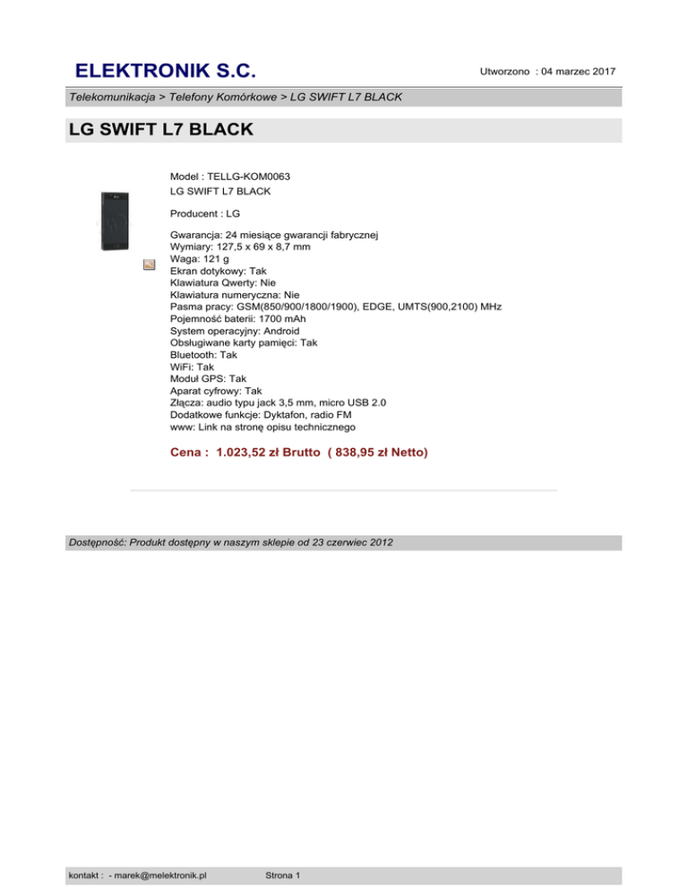 ELEKTRONIK S.C. Utworzono : 04 marzec 2017 Telekomunikacja > Telefony Komórkowe > LG SWIFT L7 BLACK LG SWIFT L7 BLACK Model : TELLG-KOM0063 LG SWIFT L7 BLACK Producent : LG Gwarancja: 24 miesiące gwarancji fabrycznej Wymiary: 127,5 x 69 x 8,7 mm Waga: 121 g Ekran dotykowy: Tak Klawiatura Qwerty: Nie Klawiatura numeryczna: Nie Pasma pracy: GSM(850/900/1800/1900), EDGE, UMTS(900,2100) MHz Pojemność baterii: 1700 mAh System operacyjny: Android Obsługiwane karty pamięci: Tak Bluetooth: Tak WiFi: Tak Moduł GPS: Tak Aparat cyfrowy: Tak Złącza: audio typu jack 3,5 mm, micro USB 2.0 Dodatkowe funkcje: Dyktafon, radio FM www: Link na stronę opisu technicznego Cena : 1.023,52 zł Brutto ( 838,95 zł Netto) Dostępność: Produkt dostępny w naszym sklepie od 23 czerwiec 2012 kontakt : - [email protected] Strona 1
