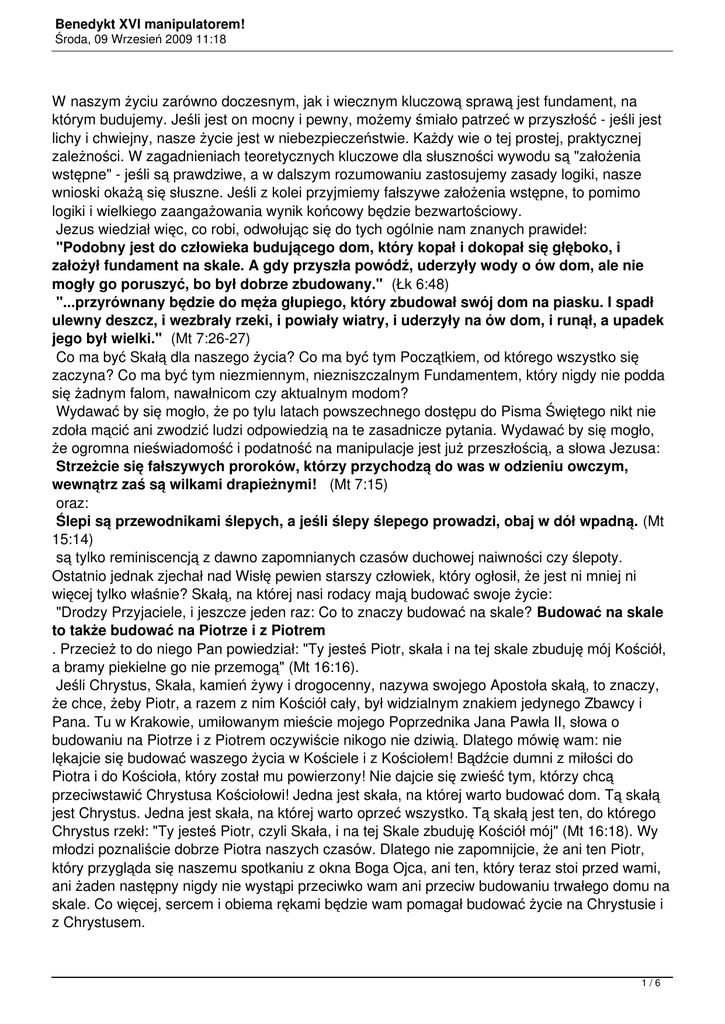 Benedykt XVI manipulatorem! Środa, 09 Wrzesień 2009 11:18 W naszym życiu zarówno doczesnym, jak i wiecznym kluczową sprawą jest fundament, na którym budujemy. Jeśli jest on mocny i pewny, możemy śmiało patrzeć w przyszłość - jeśli jest lichy i chwiejny, nasze życie jest w niebezpieczeństwie. Każdy wie o tej prostej, praktycznej zależności. W zagadnieniach teoretycznych kluczowe dla słuszności wywodu są "założenia wstępne" - jeśli są prawdziwe, a w dalszym rozumowaniu zastosujemy zasady logiki, nasze wnioski okażą się słuszne. Jeśli z kolei przyjmiemy fałszywe założenia wstępne, to pomimo logiki i wielkiego zaangażowania wynik końcowy będzie bezwartościowy. Jezus wiedział więc, co robi, odwołując się do tych ogólnie nam znanych prawideł: "Podobny jest do człowieka budującego dom, który kopał i dokopał się głęboko, i założył fundament na skale. A gdy przyszła powódź, uderzyły wody o ów dom, ale nie mogły go poruszyć, bo był dobrze zbudowany." (Łk 6:48) "...przyrównany będzie do męża głupiego, który zbudował swój dom na piasku. I spadł ulewny deszcz, i wezbrały rzeki, i powiały wiatry, i uderzyły na ów dom, i runął, a upadek jego był wielki." (Mt 7:26-27) Co ma być Skałą dla naszego życia? Co ma być tym Początkiem, od którego wszystko się zaczyna? Co ma być tym niezmiennym, niezniszczalnym Fundamentem, który nigdy nie podda się żadnym falom, nawałnicom czy aktualnym modom? Wydawać by się mogło, że po tylu latach powszechnego dostępu do Pisma Świętego nikt nie zdoła mącić ani zwodzić ludzi odpowiedzią na te zasadnicze pytania. Wydawać by się mogło, że ogromna nieświadomość i podatność na manipulacje jest już przeszłością, a słowa Jezusa: Strzeżcie się fałszywych proroków, którzy przychodzą do was w odzieniu owczym, wewnątrz zaś są wilkami drapieżnymi! (Mt 7:15) oraz: Ślepi są przewodnikami ślepych, a jeśli ślepy ślepego prowadzi, obaj w dół wpadną. (Mt 15:14) są tylko reminiscencją z dawno zapomnianych czasów duchowej naiwności czy ślepoty. Ostatnio jednak zjechał nad Wisłę pewien starszy człowiek, który ogłosił, że jest ni mniej ni więcej tylko właśnie? Skałą, na której nasi rodacy mają budować swoje życie: "Drodzy Przyjaciele, i jeszcze jeden raz: Co to znaczy budować na skale? Budować na skale to także budować na Piotrze i z Piotrem . Przecież to do niego Pan powiedział: "Ty jesteś Piotr, skała i na tej skale zbuduję mój Kościół, a bramy piekielne go nie przemogą" (Mt 16:16). Jeśli Chrystus, Skała, kamień żywy i drogocenny, nazywa swojego Apostoła skałą, to znaczy, że chce, żeby Piotr, a razem z nim Kościół cały, był widzialnym znakiem jedynego Zbawcy i Pana. Tu w Krakowie, umiłowanym mieście mojego Poprzednika Jana Pawła II, słowa o budowaniu na Piotrze i z Piotrem oczywiście nikogo nie dziwią. Dlatego mówię wam: nie lękajcie się budować waszego życia w Kościele i z Kościołem! Bądźcie dumni z miłości do Piotra i do Kościoła, który został mu powierzony! Nie dajcie się zwieść tym, którzy chcą przeciwstawić Chrystusa Kościołowi! Jedna jest skała, na której warto budować dom. Tą skałą jest Chrystus. Jedna jest skała, na której warto oprzeć wszystko. Tą skałą jest ten, do którego Chrystus rzekł: "Ty jesteś Piotr, czyli Skała, i na tej Skale zbuduję Kościół mój" (Mt 16:18). Wy młodzi poznaliście dobrze Piotra naszych czasów. Dlatego nie zapomnijcie, że ani ten Piotr, który przygląda się naszemu spotkaniu z okna Boga Ojca, ani ten, który teraz stoi przed wami, ani żaden następny nigdy nie wystąpi przeciwko wam ani przeciw budowaniu trwałego domu na skale. Co więcej, sercem i obiema rękami będzie wam pomagał budować życie na Chrystusie i z Chrystusem. 1/6 Benedykt XVI manipulatorem! Środa, 09 Wrzesień 2009 11:18 (J.Ratzinger, Kraków, 27 maja br., wyróżnienia autora) Bóg dał nam rozum, byśmy rozróżniali Prawdę od fałszu. ?Syn Boży przyszedł i dał nam rozum, abyśmy poznali tego, który jest prawdziwy (?) (1 J 5:20) Rozpoczynając racjonalną analizę jakiegoś przesłania, musimy sprawdzić, czy nie zawiera ono sprzeczności wewnętrznych - twierdzeń nielogicznych czy wzajemnie się wykluczających (test świadectw wewnętrznych). Już pobieżna lektura tej krótkiej wypowiedzi "kolejnego wcielenia apostoła Piotra" rodzi poważny znak zapytania: Jeśli prawdą jest (A): "Jedna jest skała, na której warto budować dom. Tą skałą jest Chrystus" i jednocześnie (B) "Jedna jest skała, na której warto oprzeć wszystko. Tą skałą jest ten, do którego Chrystus rzekł: Ty jesteś Piotr?", to zakładając, że papież był trzeźwy, nie da się inaczej logicznie zinterpretować i zharmonizować jego słów, jak tylko poprzez wniosek, że Chrystus i Piotr to jedna i ta sama osoba. Dalej Ratzinger idzie jeszcze śmielej, gdy twierdzi, że tych Piotrów jest przynajmniej dwóch: "ani ten Piotr, który przygląda się naszemu spotkaniu z okna Boga Ojca, ani ten, który teraz stoi przed wami", a będzie ich jeszcze więcej: "ani żaden następny"! Łącząc to więzami logiki, należy wywnioskować, że skoro Chrystus i Piotr to jedno, a mamy wielu Piotrów, to i Chrystusów jest u nas pod dostatkiem? Biblia i o tym nas zawczasu ostrzega: Gdyby wam wtedy kto powiedział: Oto tu jest Chrystus albo tam, nie wierzcie. Powstaną bowiem fałszywi mesjasze i fałszywi prorocy (...) (Mt 24:23-24) Kolejnym sprawdzianem prawdziwości przesłania jest porównanie go z innymi wiarygodnymi źródłami (test świadectw zewnętrznych). Skupmy się na jednym, ale za to najbardziej miarodajnym źródle poznania dla chrześcijan - na Piśmie Świętym. Czy rzeczywiście dopuszcza ono twierdzenie J.Ratzingera (i całej religii rzymsko-katolickiej), że słowa Jezusa: "T y jesteś Piotr, skała i na tej skale zbuduję mój Kościół" czynią ap