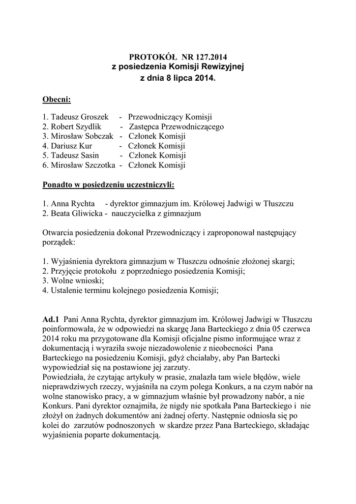 PROTOKÓŁ NR 127.2014 z posiedzenia Komisji Rewizyjnej z dnia 8 lipca 2014. Obecni: 1. Tadeusz Groszek 2. Robert Szydlik 3. Mirosław Sobczak 4. Dariusz Kur 5. Tadeusz Sasin 6. Mirosław Szczotka - Przewodniczący Komisji Zastępca Przewodniczącego Członek Komisji Członek Komisji Członek Komisji Członek Komisji Ponadto w posiedzeniu uczestniczyli: 1. Anna Rychta - dyrektor gimnazjum im. Królowej Jadwigi w Tłuszczu 2. Beata Gliwicka - nauczycielka z gimnazjum Otwarcia posiedzenia dokonał Przewodniczący i zaproponował następujący porządek: 1. Wyjaśnienia dyrektora gimnazjum w Tłuszczu odnośnie złożonej skargi; 2. Przyjęcie protokołu z poprzedniego posiedzenia Komisji; 3. Wolne wnioski; 4. Ustalenie terminu kolejnego posiedzenia Komisji; Ad.1 Pani Anna Rychta, dyrektor gimnazjum im. Królowej Jadwigi w Tłuszczu poinformowała, że w odpowiedzi na skargę Jana Barteckiego z dnia 05 czerwca 2014 roku ma przygotowane dla Komisji oficjalne pismo informujące wraz z dokumentacją i wyraziła swoje niezadowolenie z nieobecności Pana Barteckiego na posiedzeniu Komisji, gdyż chciałaby, aby Pan Bartecki wypowiedział się na postawione jej zarzuty. Powiedziała, że czytając artykuły w prasie, znalazła tam wiele błędów, wiele nieprawdziwych rzeczy, wyjaśniła na czym polega Konkurs, a na czym nabór na wolne stanowisko pracy, a w gimnazjum właśnie był prowadzony nabór, a nie Konkurs. Pani dyrektor oznajmiła, że nigdy nie spotkała Pana Barteckiego i nie złożył on żadnych dokumentów ani żadnej oferty. Następnie odniosła się po kolei do zarzutów podnoszonych w skardze przez Pana Barteckiego, składając wyjaśnienia poparte dokumentacją. Zdaniem Pani dyrektor dziwne jest to, że Pan Bartecki poszukując pracy, zwrócił uwagę tylko na nabór w gimnazjum, skoro w szkołach w naszej gminie ogłoszono nabory na różne stanowiska, a kryteria naboru były bardzo podobne. Ogłoszenie o naborze ukazało się nie tylko na stronie BIP, ale również na stronie Kuratorium Mazowieckiego, także informacja poszła w świat, powiedziała Pani dyrektor i oświadczyła, że Pani Elżbieta B. została przeniesiona służbowo z uwagi na fakt, iż spełniała wskazane w ofercie kryteria doboru na stanowisko nauczyciela muzyki, plastyki i zajęć artystycznych, a ona jako dyrektor czuje się dyskryminowana dlatego, że została poddana krytyce bez wcześniejszego wysłuchania jej i nagłośnienia sprawy skargi w prasie bez rozpatrzenia i podania fałszywej informacji, bez jakiejkolwiek próby rozmowy z nią. Następnie Pani dyrektor zwróciła się z prośbą o nie wykorzystywanie stanowiska pracownika do prowadzenia kampanii wyborczej, pracownika który posiada wysoki poziom wiedzy merytorycznej, pedagogicznej, kulturę osobistą i ma wysokie umiejętności dydaktyczne i wychowawczej oraz dodatkowe działania na rzecz szkoły. Po udzieleniu wyjaśnień Pani dyrektor przekazała oficjalne pismo wraz z dokumentacją ( załącznik nr 1 do niniejszego protokołu) Przewodniczącemu Komisji, który zlecił radnemu Sobczakowi jego odczytanie. Po odczytaniu pisma wywiązała się dyskusja, radni zadawali Pani dyrektor pytania, na które udzielała odpowiedzi. Podsumowując dyskusję Przewodniczący Komisji stwierdził, że zastanawiający jest fakt, iż nigdy i nigdzie nie pojawił się Pan Bartecki lub jego pełnomocnik. Radny Szydlik dodał, że szkoda, iż przy przekazywaniu skargi Radzie nie została przekazana przez Burmistrza i obsługę prawną Urzędu informacja o przeniesieniu służbowym Pani Elżbiety B, co znacznie ułatwiłoby prace Radzie i Komisji. Komisja wypracuje stanowisko w sprawie skargi i opinię na piśmie przekaże Przewodniczącemu Rady. Ad2. Protokół Nr 126/2014 z 104 lipca 2014 roku został przyjęty. Ad3. Komisja postanowiła na kolejne posiedzenie zaprosić Burmistrza i Panią Prawnik z Urzędu w celu przygotowania opinii o skardze. Ad4. Termin kolejnego posiedzenia Komisji ustalono na dzień 8 lipca 2014 roku godzina 8.30 Komisja ustaliła również terminy posiedzenia Komisji w miesiącu sierpniu tj. 04 sierpnia 2014 r. godzina 8.30; 2 08 sierpnia 2014 r. godzina 8.30; 25 sierpnia 2014 r. godzina 8.30 . Na tym protokół zakończono. Przewodniczący Komisji Tadeusz Groszek Załączniki do wglądu w pok.38 Nagranie wideo z posiedzenia stanowi załącznik do niniejszego protokołu. Dokument utworzyła: Bożena Brzozowska dnia 21 lipca 2014 r. 3 4
