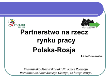 Partnerstwo na rzecz rynku pracy Polska-Rosja Lidia Domańska Warmińsko-Mazurski Pakt Na Rzecz Rozwoju Poradnictwa Zawodowego Olsztyn, 12 lutego 2013r. FORMY WSPÓŁPRACY PROGRAM WSPÓŁPRACY TRANSGRANICZNEJ 2007-2013 LITWA – POLSKA – ROSJA „Warmia i Mazury – Obwód Kaliningradzki Pracując ponad granicami” INFORMACJE OGÓLNE O PROJEKCIE Projekt złożony do WST w Warszawie 14.09.2010r. 2. Pozytywna ocena formalna - 11.03.2011r. 3. Informacja o ocenie merytorycznej (WKM)02.03.2012r. 4. Podpisanie Umowy Partnerskiej - 30.06.2012r. 5. Zawarcie Umowy o Dofinansowanie projektu wrzesień 2012r. 1. PARTNERZY PROJEKTU Wojewódzki Urząd Pracy w Olsztynie – Lider Projektu Agencja ds. Zapewnienia Pracy Ludności Obwodu Kaliningradzkiego FR – Partner Projekt tworzono we współpracy z Partnerem rosyjskim Wkład merytoryczny dot. warsztatów i seminariów opracowali doradcy zawodowi i pośrednicy pracy obu instytucji CZAS TRWANIA I KWOTA PROJEKTU Całkowity okres trwania projektu: 24 miesiące (1 października 2012 – 30 września 2014) Całkowity koszt kwalifikowalny projektu: 156 385, 85 EUR Kwota dofinansowania 140 747, 26 EUR Wkład własny partnerów 15 638, 59 EUR (90% całkowitego kosztu) Finansowanie: 90% Projekt / 10% wkład własny OBSZAR REALIZACJI PROJEKTU POLSKA – województwo warmińsko – mazurskie, miasta: Olsztyn, Elbląg, Ełk ROSJA – Obwód Kaliningradzki, miasta: Kaliningrad, Prawdinsk, Czerniachowsk, Bałtijsk, Gurjewsk, Ozjersk CELE PROJEKTU CEL OGÓLNY: podniesienie wiedzy i kwalifikacji kluczowych pracowników psz (doradców zawodowych i pośredników pracy) województwa warmińskomazurskiego i Obwodu Kaliningradzkiego FR CELE SZCZEGÓŁOWE: Transfer informacji i wiedzy Rozszerzenie zakresu współpracy Partnerów Nawiązanie współpracy pomiędzy bezrobotnymi, MŚP i lokalnymi instytucjami rynku pracy GRUPY DOCELOWE W ramach projektu wsparciem zostaną objęte dwie instytucje publicznych służb zatrudnienia tj. Wojewódzki Urząd Pracy w Olsztynie Agencja ds. Zapewnienia Pracy Ludności Obwodu Kaliningradzkiego oraz pracownicy PSZ Obwodu Kaliningradzkiego i województwa warmińsko – mazurskiego zaangażowani w realizację zadań z zakresu pośrednictwa pracy i doradztwa zawodowego BENEFICJENCI KOŃCOWI INSTYTUCJE RYNKU PRACY PRZEDSTAWICIELE MŚP OSOBY BEZROBOTNE PLACÓWKI EDUKACYJNE GŁÓWNE DZIAŁANIA PROJEKTU 2 dwudniowe konferencje – otwierająca i zamykająca projekt (obie po stronie polskiej), każda dla 60 osób (po 30 osób ze strony polskiej i rosyjskiej) 2 pięciodniowe warsztaty – po jednym u każdego z Partnerów, każdy dla 16 osób (po 8 osób z każdej strony) 2 trzydniowe seminaria – po jednym u każdego z Partnerów, każde dla 30 osób (po 15 z każdej strony) GŁÓWNE DZIAŁANIA cd. 4 spotkania organizacyjne, w których udział weźmie personel projektu obu Partnerów Utworzenie wspólnej bazy danych dla celów informacyjnych i promocyjnych projektu Wydanie dwujęzycznej publikacji – podręcznika dobrych praktyk Zakup sprzętu elektronicznego, materiałów informacyjnych i promocyjnych, biurowych 3 audyty, monitoring, ewaluacja HARMONOGRAM DZIAŁAŃ Konferencje: rozszerzona grupa uczestników Luty 2013 – konferencja inauguracyjna w Polsce Lipiec 2014 – konferencja w Polsce zamykająca projekt Warsztaty: udział biorą doradcy zawodowi i pośrednicy pracy Kwiecień 2013 – warsztaty w Polsce Lipiec 2013 – warsztaty w Rosji Seminaria: rozszerzona grupa uczestników Październik 2013 – seminarium w Polsce Marzec 2014 – seminarium w Rosji REZULTATY TWARDE Uzyskanie przez 26 uczestników (80%) dyplomów ukończenia warsztatów Zdobycie przez 48 uczestników (80%) zaświadczeń o uczestnictwie w seminariach Frekwencja na konferencjach wyniesie 80% (łącznie 96 osób) 200 osób zostanie poinformowanych o realizacji projektu Podręcznik dobrych praktyk - dwujęzyczna publikacja (j.polski/j.rosyjski) w nakładzie 400 sztuk REZULTATY MIĘKKIE Podniesienie poziomu wiedzy i kwalifikacji kluczowych pracowników Wzrost samooceny, wydajności i efektywności pracy uczestników projektu Wymiana informacji i poszerzenie wiedzy nt. sytuacji na rynku pracy obu Partnerów Dalsza współpraca obu Partnerów Stworzenie możliwości współpracy instytucjom rynku pracy w celu poprawy sytuacji osób bezrobotnych WARSZTATY i SEMINARIA Zarówno oba warsztaty, jak i seminaria odbywać się będą w podziale na dwa moduły: dla doradców zawodowych 2. dla pośredników pracy 1. WARSZTATY - TEMATYKA I moduł – doradcy zawodowi Warsztaty mające na celu przekazywanie dobrych praktyk w zakresie pracy z osobami bezrobotnymi m.in. badanie predyspozycji, nauka praktycznych umiejętności w poszukiwaniu pracy i planowaniu kariery zawodowej Warsztaty poprawiające kreatywność oraz dające nowe spojrzenie na proces zmian na rynku pracy Wizyta w Centrum Aktywizacji Zawodowej (Polska) oraz w Centrach Zatrudnienia (Rosja) Prezentowanie metod pracy z pracodawcą WARSZTATY – TEMATYKA II moduł – pośrednicy pracy Metody pracy pośredników pracy psz Warmii i Mazur Funkcjonowanie usługi międzynarodowego pośrednictwa pracy EURES – cele, struktura, zadania Omówienie zadań agencji zatrudnienia i ich powiązań z WUP Zatrudnianie cudzoziemców – rola pup, WUP, UW Wdrażanie zadań związanych z koordynacją systemów zabezpieczenia społecznego Współpraca psz z przedsiębiorcami-identyfikacja problemów Wizerunek psz i możliwości jego kształtowania W ramach obu warsztatów będą przeprowadzone ankiety samooceny SEMINARIA - TEMATYKA I moduł – doradcy zawodowi Rozwiązania prawne i organizacyjne regulujące funkcjonowanie poradnictwa zawodowego w Polsce i Obwodzie Kaliningradzkim Metody stosowane do oceny osobowości bezrobotnego SEMINARIA - TEMATYKA II moduł - pośrednicy pracy Pośrednictwo pracy na lokalnym, krajowym i międzynarodowym rynku pracy – komplementarność usługi pośrednictwa pracy Zagadnienia z zakresu funkcjonowa