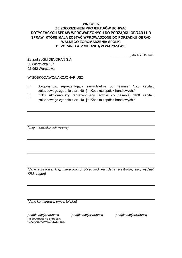 WNIOSEK ZE ZGŁOSZENIEM PROJEKTU/ÓW UCHWAŁ DOTYCZĄCYCH SPRAW WPROWADZONYCH DO PORZĄDKU OBRAD LUB SPRAW, KTÓRE MAJĄ ZOSTAĆ WPROWADZONE DO PORZĄDKU OBRAD WALNEGO ZGROMADZENIA SPÓŁKI DEVORAN S.A. Z SIEDZIBĄ W WARSZAWIE ___________, dnia 2015 roku Zarząd spółki DEVORAN S.A. ul. Wiertnicza 107 02-952 Warszawa WNIOSKODAWCA/AKCJONARIUSZ1 [ ] [ ] Akcjonariusz reprezentujący samodzielnie co najmniej 1/20 kapitału zakładowego zgodnie z art. 401§4 Kodeksu spółek handlowych.2 Kilku Akcjonariuszy reprezentujący łącznie co najmniej 1/20 kapitału zakładowego zgodnie z art. 401§4 Kodeksu spółek handlowych.2 (imię, nazwisko, lub nazwa) (dane adresowe, kraj, miejscowość, ulica, kod, ew. dane rejestrowe, sąd, wydział, KRS, regon) (dane kontaktowe, email, telefon) _________________ podpis akcjonariusza 1 2 NIEPOTRZEBNE SKREŚLIĆ ZAZNACZYĆ WŁAŚCIWE POLE _________________ podpis akcjonariusza _________________ podpis akcjonariusza WAŻNE INFORMACJE DLA AKCJONARIUSZY SPÓŁKI DEVORAN S.A. W przypadku akcjonariusza lub akcjonariuszy, których sposób reprezentacji wymaga przedłożenia właściwych dokumentów zgodnie z zasadami ich reprezentacji, wymagane jest załączenie do powyższego żądania oryginałów lub kopii dokumentów, w postaci właściwej dla sposobu, w jaki zostało złożone żądanie (oryginał w wersji papierowej lub kopia w postaci skanu dokumentu w formacie PDF). Żądanie w formie pisemnej wraz z kompletem załączników, powinno być złożone za potwierdzeniem złożenia w siedzibie Spółki pod adresem: ul. Wiertnicza 107, 02-952 Warszawa lub wysłane do Spółki, za potwierdzeniem wysłania i potwierdzeniem odbioru, na adres: ul. Wiertnicza 107, 02-952 Warszawa, lub wysłane Spółce w przypadku formy elektronicznej na adres e-mail: [email protected]. Spółka może podjąć proporcjonalne do celu działania służące identyfikacji akcjonariusza lub akcjonariuszy i weryfikacji ważności przesłanych dokumentów. Akcjonariusz lub akcjonariusze mogą składać wniosek przez pełnomocnika. Pełnomocnictwo powinno być sporządzone w formie pisemnej lub udzielone w postaci elektronicznej. W przypadku udzielenia pełnomocnictwa w postaci elektronicznej akcjonariusz informuje o tym fakcie Spółkę za pośrednictwem poczty elektronicznej Spółki za pomocą prawidłowo wypełnionego i podpisanego właściwego formularza pobranego ze strony internetowej Spółki www.devoran-sa.pl. Pełnomocnictwo i załączniki do pełnomocnictwa powinny być dostarczone do spółki (dokument w wersji papierowej lub jego kopia), a w przypadku pełnomocnictwa udzielonego w formie elektronicznej dokument i załączniki, w szczególności zawiadomienie o udzieleniu pełnomocnictwa w postaci elektronicznej, powinny zostać zeskanowane do formatu PDF i wpłynąć do Spółki na adres poczty elektronicznej e-mail: [email protected]. W celu identyfikacji akcjonariusza udzielającego pełnomocnictwa, do pełnomocnictwa powinna zostać załączona: (i) w przypadku akcjonariusza będącego osobą fizyczną - kopia dowodu osobistego, paszportu lub innego urzędowego dokumentu potwierdzającego tożsamość akcjonariusza; albo (ii) w przypadku akcjonariusza innego niż osoba fizyczna - kopia odpisu z właściwego rejestru lub innego dokumentu potwierdzającego upoważnienie osoby fizycznej (lub osób fizycznych) do reprezentowania akcjonariusza na Zgromadzeniu (np. nieprzerwany ciąg pełnomocnictw). W przypadku wątpliwości co do prawdziwości kopii wyżej wymienionych dokumentów, Zarząd Spółki zastrzega sobie prawo do żądania od pełnomocnika okazania przy sporządzaniu listy obecności: (i) w przypadku akcjonariusza będącego osobą fizyczną - kopii potwierdzonej za zgodność z oryginałem przez notariusza lub inny podmiot uprawniony do potwierdzania za zgodność z oryginałem kopii dowodu osobistego, paszportu lub innego urzędowego dokumentu potwierdzającego tożsamość akcjonariusza; albo (ii) w przypadku akcjonariusza innego niż osoba fizyczna - oryginału lub kopii potwierdzonej za zgodność z oryginałem przez notariusza lub inny podmiot uprawniony do potwierdzania za zgodność z oryginałem odpisu z właściwego rejestru lub innego dokumentu potwierdzającego upoważnienie osoby fizycznej (lub osób fizycznych) do reprezentowania pełnomocnika na Zgromadzeniu (np. nieprzerwany ciąg pełnomocnictw). W celu identyfikacji pełnomocnika, Zarząd Spółki zastrzega sobie prawo do żądania od pełnomocnika okazania przy sporządzaniu listy obecności: (i) w przypadku pełnomocnika będącego osobą fizyczną - dowodu osobistego, paszportu lub innego urzędowego dokumentu potwierdzającego tożsamość pełnomocnika Akcjonariusza; albo (ii) w przypadku pełnomocnika innego niż osoba fizyczna - oryginału lub kopii potwierdzonej za zgodność z oryginałem przez notariusza lub inny podmiot uprawniony do potwierdzania za zgodność z oryginałem odpisu z właściwego rejestru lub innego dokumentu potwierdzającego upoważnienie osoby fizycznej (osób fizycznych) do reprezentowania pełnomocnika na Zgromadzeniu (np. nieprzerwany ciąg pełnomocnictw). Akcjonariusz lub akcjonariusze zgłaszający swoje projekty uchwał dotyczące spraw wprowadzonych do porządku obrad Zgromadzenia lub spraw, które mają zostać wprowadzone do porządku obrad przed terminem Zgromadzenia muszą do niniejszego wniosku załączyć zaświadczenie (lub inny dokument równoważny zaświadczeniu), wystawione przez właściwy podmiot, potwierdzające stan posiadania przez akcjonariusza lub akcjonariuszy, wymagany do złożenia powyższego żądania części kapitału zakładowego Spółki (wersja papierowa lub skan dokumentu w formacie PDF). TREŚĆ WNIOSKU W załączeniu niniejszym załączamy treść proponowanych projektów uchwał. __________________ podpis wnioskodawcy