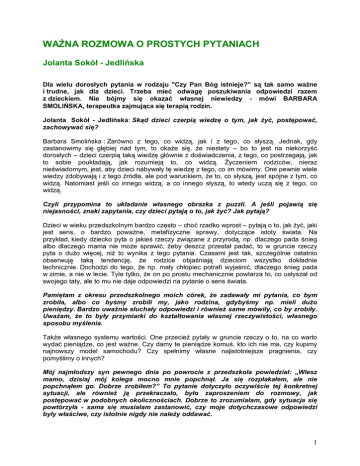 WAŻNA ROZMOWA O PROSTYCH PYTANIACH Jolanta Sokół - Jedlińska Dla wielu dorosłych pytania w rodzaju "Czy Pan Bóg istnieje?" są tak samo ważne i trudne, jak dla dzieci. Trzeba mieć odwagę poszukiwania odpowiedzi razem z dzieckiem. Nie bójmy się okazać własnej niewiedzy - mówi BARBARA SMOLIŃSKA, terapeutka zajmująca się terapią rodzin. Jolanta Sokół - Jedlińska: Skąd dzieci czerpią wiedzę o tym, jak żyć, postępować, zachowywać się? Barbara Smolińska : Zarówno z tego, co widzą, jak i z tego, co słyszą. Jednak, gdy zastanowimy się głębiej nad tym, to okaże się, że niestety – bo to jest na niekorzyść dorosłych – dzieci czerpią taką wiedzę głównie z doświadczenia, z tego, co postrzegają, jak to sobie poukładają, jak rozumieją to, co widzą. Życzeniem rodziców, nieraz nieświadomym, jest, aby dzieci nabywały tę wiedzę z tego, co im mówimy. One pewnie wiele wiedzy zdobywają i z tego źródła, ale pod warunkiem, że to, co słyszą, jest spójne z tym, co widzą. Natomiast jeśli co innego widzą, a co innego słyszą, to wtedy uczą się z tego, co widzą. Czyli przypomina to układanie własnego obrazka z puzzli. A jeśli pojawią się niejasności, znaki zapytania, czy dzieci pytają o to, jak żyć? Jak pytają? Dzieci w wieku przedszkolnym bardzo często – choć rzadko wprost – pytają o to, jak żyć, jaki jest sens, o bardzo poważne, metafizyczne sprawy, dotyczące istoty świata. Na przykład, kiedy dziecko pyta o jakieś rzeczy związane z przyrodą, np. dlaczego pada śnieg albo dlaczego mama nie może sprawić, żeby deszcz przestał padać, to w gruncie rzeczy pyta o dużo więcej, niż to wynika z tego pytania. Czasami jest tak, szczególnie ostatnio obserwuję taką tendencję, że rodzice objaśniają dzieciom wszystko dokładnie technicznie. Dochodzi do tego, że np. mały chłopiec potrafi wyjaśnić, dlaczego śnieg pada w zimie, a nie w lecie. Tyle tylko, że on po prostu mechanicznie powtarza to, co usłyszał od swojego taty, ale to mu nie daje odpowiedzi na pytanie o sens świata. Pamiętam z okresu przedszkolnego moich córek, że zadawały mi pytania, co bym zrobiła, albo co byśmy zrobili my, jako rodzina, gdybyśmy np. mieli dużo pieniędzy. Bardzo uważnie słuchały odpowiedzi i również same mówiły, co by zrobiły. Uważam, że to były przymiarki do kształtowania własnej rzeczywistości, własnego sposobu myślenia. Także własnego systemu wartości. One przecież pytały w gruncie rzeczy o to, na co warto wydać pieniądze, co jest ważne. Czy damy te pieniądze komuś, kto ich nie ma, czy kupimy najnowszy model samochodu? Czy spełnimy własne najistotniejsze pragnienia, czy pomyślimy o innych? Mój najmłodszy syn pewnego dnia po powrocie z przedszkola powiedział: „Wiesz mamo, dzisiaj mój kolega mocno mnie popchnął. Ja się rozpłakałem, ale nie popchnąłem go. Dobrze zrobiłem?” To pytanie dotyczyło oczywiście tej konkretnej sytuacji, ale również ją przekraczało, było zaproszeniem do rozmowy, jak postępować w podobnych okolicznościach. Dobrze to zrozumiałam, gdy sytuacja się powtórzyła - sama się musiałam zastanowić, czy moje dotychczasowe odpowiedzi były właściwe, czy istotnie nigdy nie należy oddawać. 1 Mam podobne wspomnienie dotyczące mojego najstarszego syna. Kiedy był mały, a my byliśmy młodzi i bardzo idealistyczni, mówiliśmy mu, że nigdy nie można nikogo uderzyć ani popchnąć. Nasz syn był potem nadmiernie bezradny, nie potrafił się obronić. Wtedy przestraszyliśmy się i zdaliśmy sobie sprawę, że życie jest bardziej zróżnicowane. Często w terapii ludzi dorosłych słyszę takie deklaracje: „Ja bym nigdy nikogo nie uderzył”. Jednak są przecież sytuacje, że ktoś może kogoś zaatakować, że mężczyzna musi obronić kogoś słabszego. Może jednak wtedy będzie się bił, a nawet jeśli nigdy nie będzie się bił, to istotne, żeby to wynikało z jego świadomego wyboru, a nie z poczucia, że tak nie wolno. Dochodzimy tutaj do tego, że w rozmowach z dziećmi warto im uświadamiać prawo do dokonywania wyborów. Nie chodzi o to, by stworzyć sztywny zespół norm: tego nigdy nie można, to zawsze trzeba. Oczywiście w ten sposób staramy się je ustrzec, ale skutek może być dokładnie odwrotny do zamierzonego przez nas, bo stworzone przez nas ramy są za sztywne. W jaki sposób kształtować w dzieciach wolność wyboru? Przez rozmowę. Przez dopytywanie się, co dziecko czuje, co myśli o danej sytuacji. Można odwołać się do naturalnego poczucia sprawiedliwości, razem zastanawiać się, jakie są możliwości różnych zachowań. Chodzi o to, żeby dziecko nie czuło konieczności wypełnienia jakiegoś sztywnego wzorca, zwłaszcza, gdy odczuwa wobec niego wewnętrzny sprzeciw. Czy można powiedzieć, że są okresy rozwojowe, w których stawianie pytań „jak żyć” jest szczególnie intensywne? Pierwszym jest wiek przedszkolny, choć pytania wówczas bywają zakamuflowane. Potem takim okresem jest wiek dojrzewania. Ten pierwszy okres, można powiedzieć filozoficzny, kończy się wraz z początkiem szkolnej edukacji nastawionej przede wszystkim na gromadzenie wiedzy konkretnej. Trzeba jednak powiedzieć, że i my, rodzice, przyczyniamy się do zamierania takiej dociekliwości. Brakuje nam bowiem dyspozycyjności i uwagi – dzieci zadają pytania często w sytuacjach dla nas niedogodnych i otrzymują wtedy odpowiedzi zbywające albo czysto techniczne. To ostatnie dotyczy często młodych i wykształconych rodziców. Mój mąż opowiadał niedawno, że kiedy prowadził zajęcia muzyczne z siedmiolatkami, dzieci zapytały, dlaczego Pana Boga nie widać. Zaczęli na ten temat rozmawiać, dzieci były bardzo zafrapowane tematem. Jedna dziewczynka powiedziała, że Pan Bóg jest jak powietrze, i my tak Nim oddychamy, jak powietrzem, a inne dziecko powiedziało po prostu: „Nie wiem”. Każde z nich dokon