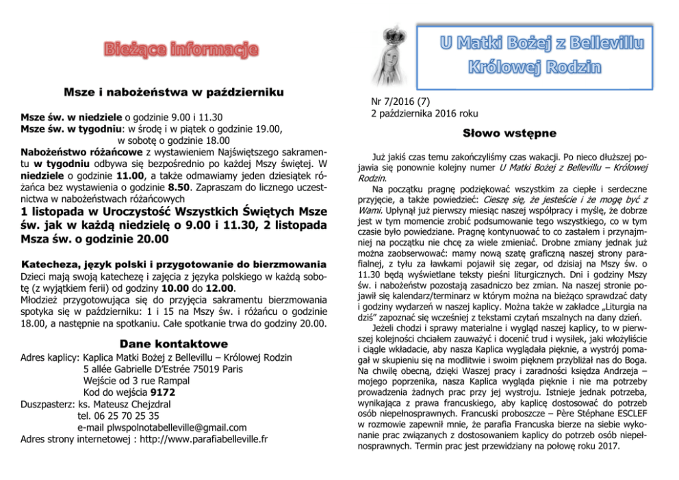 Msze i nabożeństwa w październiku Msze św. w niedziele o godzinie 9.00 i 11.30 Msze św. w tygodniu: w środę i w piątek o godzinie 19.00, w sobotę o godzinie 18.00 Nabożeństwo różańcowe z wystawieniem Najświętszego sakramentu w tygodniu odbywa się bezpośrednio po każdej Mszy świętej. W niedziele o godzinie 11.00, a także odmawiamy jeden dziesiątek różańca bez wystawienia o godzinie 8.50. Zapraszam do licznego uczestnictwa w nabożeństwach różańcowych 1 listopada w Uroczystość Wszystkich Świętych Msze św. jak w każdą niedzielę o 9.00 i 11.30, 2 listopada Msza św. o godzinie 20.00 Katecheza, język polski i przygotowanie do bierzmowania Dzieci mają swoją katechezę i zajęcia z języka polskiego w każdą sobotę (z wyjątkiem ferii) od godziny 10.00 do 12.00. Młodzież przygotowująca się do przyjęcia sakramentu bierzmowania spotyka się w październiku: 1 i 15 na Mszy św. i różańcu o godzinie 18.00, a następnie na spotkaniu. Całe spotkanie trwa do godziny 20.00. Dane kontaktowe Adres kaplicy: Kaplica Matki Bożej z Bellevillu – Królowej Rodzin 5 allée Gabrielle D’Estrée 75019 Paris Wejście od 3 rue Rampal Kod do wejścia 9172 Duszpasterz: ks. Mateusz Chejzdral tel. 06 25 70 25 35 e-mail [email protected] Adres strony internetowej : http://www.parafiabelleville.fr Nr 7/2016 (7) 2 października 2016 roku Słowo wstępne Już jakiś czas temu zakończyliśmy czas wakacji. Po nieco dłuższej pojawia się ponownie kolejny numer U Matki Bożej z Bellevillu – Królowej Rodzin. Na początku pragnę podziękować wszystkim za ciepłe i serdeczne przyjęcie, a także powiedzieć: Cieszę się, że jesteście i że mogę być z Wami. Upłynął już pierwszy miesiąc naszej współpracy i myślę, że dobrze jest w tym momencie zrobić podsumowanie tego wszystkiego, co w tym czasie było powiedziane. Pragnę kontynuować to co zastałem i przynajmniej na początku nie chcę za wiele zmieniać. Drobne zmiany jednak już można zaobserwować: mamy nową szatę graficzną naszej strony parafialnej, z tyłu za ławkami pojawił się zegar, od dzisiaj na Mszy św. o 11.30 będą wyświetlane teksty pieśni liturgicznych. Dni i godziny Mszy św. i nabożeństw pozostają zasadniczo bez zmian. Na naszej stronie pojawił się kalendarz/terminarz w którym można na bieżąco sprawdzać daty i godziny wydarzeń w naszej kaplicy. Można także w zakładce „Liturgia na dziś” zapoznać się wcześniej z tekstami czytań mszalnych na dany dzień. Jeżeli chodzi i sprawy materialne i wygląd naszej kaplicy, to w pierwszej kolejności chciałem zauważyć i docenić trud i wysiłek, jaki włożyliście i ciągle wkładacie, aby nasza Kaplica wyglądała pięknie, a wystrój pomagał w skupieniu się na modlitwie i swoim pięknem przybliżał nas do Boga. Na chwilę obecną, dzięki Waszej pracy i zaradności księdza Andrzeja – mojego poprzenika, nasza Kaplica wygląda pięknie i nie ma potrzeby prowadzenia żadnych prac przy jej wystroju. Istnieje jednak potrzeba, wynikająca z prawa francuskiego, aby kaplicę dostosować do potrzeb osób niepełnosprawnych. Francuski proboszcze – Père Stéphane ESCLEF w rozmowie zapewnił mnie, że parafia Francuska bierze na siebie wykonanie prac związanych z dostosowaniem kaplicy do potrzeb osób niepełnosprawnych. Termin prac jest przewidziany na połowę roku 2017. O terminach będę Was na bieżąco informował, kiedy znane będą szczegóły. W rozmowach z Wami często pojawiała się troska o rozwój duchowy parafian. Wynika z tego potrzeba utworzenia grupy modlitewnej, np. róży różańcowej oraz grupy formacyjnej, np. oazy rodzin. Do końca roku po lepszym rozeznaniu się w sytuacji przedstawię propozycję utworzenia takich grup. W pierwsze niedziele miesiąca podczas Mszy św. o 11.30 będzie kazanie dialogowane dla dzieci. W dalszym ciągu podczas niedziel oraz ważnych świąt i uroczystości będzie pomagał nam ks. Paweł, który studiuje na Instytucie Katolickim w Paryżu. Bardzo proszę, abyście przekazywali swoje uwagi (również te krytyczne), bądź to bezpośrednio do mnie, bądź to za pośrednictwem osób, które są zaangażowane w działalność rady parafialnej. Łatwiej jest pracować, kiedy ma się informację zwrotną, od osób, które współtworzą naszą wspólnotę, czyli od każdego z Was. Wszelkie ważne decyzje będę starał się należycie uzasadnić i uargumentować podczas ogłoszeń parafialnych (co może je czasami nieco wydłużyć) i w naszym parafialnym biuletynie. Zapraszam do współpracy wszystkich na miarę sił i możliwości. Myślę, że dla każdego znajdzie się możliwość i okazja do zaangażowania się. Zapraszam do kontaktu osobistego, ponieważ chciałbym z każdym z Was spotkać się osobiście. Zachęcam także do współpracy przy tworzeniu naszej strony internetowej i biuletynu parafialnego. Każdego kto chciałby zamieścić jakiś tekst bądź to na stronie, bądź w biuletynie proszę o kontakt ze mną. Ks. Mateusz Chejzdral Dlaczego październik jest miesiącem maryjnym? Takie pytanie zadało jedno z forum internetowych młodym internautom i o dziwo wszyscy, którzy na nie odpowiedzieli wiedzieli, że ma on coś wspólnego z odmawianiem różańca. Jedna z internautek powoływała się na objawienia w Fatimie, które miały miejsce w tym miesiącu, w 1917 roku. Oczywiście widać, że kluczem jest tu różaniec i to właśnie on jest główną przyczyną, dla której październik jest nazywany miesiącem maryjnym. Dlaczego październik? Bo oprócz maja ma on najwięcej wspólnego ze czcią Najświętszej Maryi Panny i porównań z Nią związanych. Maj przypomina budzenie się przyrody do życia i jest kojarzony z Maryją czystą i świeżą, zielenią pełną nadziei powołującą do życia nasze zbawienie Jezusa Chrystusa. Październik, w którym przyroda kładzie się powoli do zimowego snu tracąc liście drzew, przywołuje jesień l