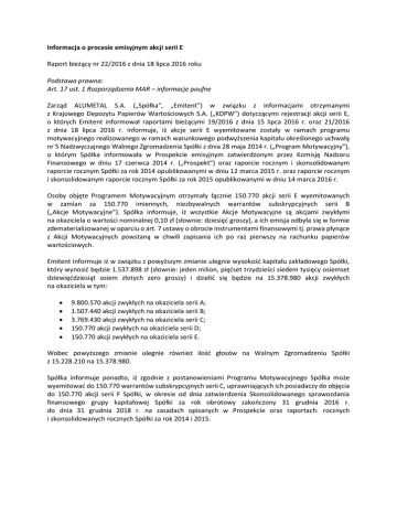 Informacja o procesie emisyjnym akcji serii E Raport bieżący nr 22/2016 z dnia 18 lipca 2016 roku Podstawa prawna: Art. 17 ust. 1 Rozporządzenia MAR – informacje poufne Zarząd ALUMETAL S.A. („Spółka”, „Emitent”) w związku z informacjami otrzymanymi z Krajowego Depozytu Papierów Wartościowych S.A. („KDPW”) dotyczącymi rejestracji akcji serii E, o których Emitent informował raportami bieżącymi 19/2016 z dnia 15 lipca 2016 r. oraz 21/2016 z dnia 18 lipca 2016 r. informuje, iż akcje serii E wyemitowane zostały w ramach programu motywacyjnego realizowanego w ramach warunkowego podwyższenia kapitału określonego uchwałą nr 5 Nadzwyczajnego Walnego Zgromadzenia Spółki z dnia 28 maja 2014 r. („Program Motywacyjny”), o którym Spółka informowała w Prospekcie emisyjnym zatwierdzonym przez Komisję Nadzoru Finansowego w dniu 17 czerwca 2014 r. („Prospekt”) oraz raporcie rocznym i skonsolidowanym raporcie rocznym Spółki za rok 2014 opublikowanymi w dniu 12 marca 2015 r. oraz raporcie rocznym i skonsolidowanym raporcie rocznym Spółki za rok 2015 opublikowanymi w dniu 14 marca 2016 r. Osoby objęte Programem Motywacyjnym otrzymały łącznie 150.770 akcji serii E wyemitowanych w zamian za 150.770 imiennych, niezbywalnych warrantów subskrypcyjnych serii B („Akcje Motywacyjne”). Spółka informuje, iż wszystkie Akcje Motywacyjne są akcjami zwykłymi na okaziciela o wartości nominalnej 0,10 zł (słownie: dziesięć groszy), a ich emisja odbyła się w formie zdematerializowanej w oparciu o art. 7 ustawy o obrocie instrumentami finansowymi tj. prawa płynące z Akcji Motywacyjnych powstaną w chwili zapisania ich po raz pierwszy na rachunku papierów wartościowych. Emitent informuje iż w związku z powyższym zmianie ulegnie wysokość kapitału zakładowego Spółki, który wynosić będzie 1.537.898 zł (słownie: jeden milion, pięćset trzydzieści siedem tysięcy osiemset dziewięćdziesiąt osiem złotych zero groszy) i dzielić się będzie na 15.378.980 akcji zwykłych na okaziciela w tym: 9.800.570 akcji zwykłych na okaziciela serii A; 1.507.440 akcji zwykłych na okaziciela serii B; 3.769.430 akcji zwykłych na okaziciela serii C; 150.770 akcji zwykłych na okaziciela serii D; 150.770 akcji zwykłych na okaziciela serii E. Wobec powyższego zmianie ulegnie również ilość głosów na Walnym Zgromadzeniu Spółki z 15.228.210 na 15.378.980. Spółka informuje ponadto, iż zgodnie z postanowieniami Programu Motywacyjnego Spółka może wyemitować do 150.770 warrantów subskrypcyjnych serii C, uprawniających ich posiadaczy do objęcia do 150.770 akcji serii F Spółki, w okresie od dnia zatwierdzenia Skonsolidowanego sprawozdania finansowego grupy kapitałowej Spółki za rok obrotowy zakończony 31 grudnia 2016 r. do dnia 31 grudnia 2018 r. na zasadach opisanych w Prospekcie oraz raportach: rocznych i skonsolidowanych rocznych Spółki za rok 2014 i 2015.
