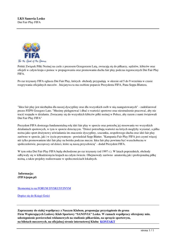 LKS Sanovia Lesko Dni Fair Play FIFA Polski Związek Piłki Nożnej na czele z prezesem Grzegorzem Latą, zwracają się do piłkarzy, sędziów, kibiców oraz oficjeli w całym kraju o pomoc w propagowaniu oraz promowaniu ducha fair play podczas tegorocznych Dni Fair Play FIFA. Po raz trzynasty FIFA ogłasza Dni Fair Play, których obchody przypadają w okresie od 5 do 9 września w czasie rozgrywania oficjalnych meczów . Inicjatywa ta ma osobiste poparcie Prezydenta FIFA, Pana Seppa Blattera. "Idea fair play jest niezbędna dla naszej dyscypliny oraz dla wszystkich osób w nią zaangażowanych" - zadeklarował prezes PZPN Grzegorz Lato. "Musimy pielęgnować i dbać o wartości sportowe oraz niestrudzenie pracować, aby nie tracić rozpędu w działaniu. Zwracamy się do wszystkich kibiców piłki nożnej w Polsce, aby razem z nami świętowali Dni Fair Play FIFA" Prezydent FIFA dostrzega fundamentalną rolę idei fair play w sporcie oraz potrzebę jej stosowania we wszystkich działaniach sportowych, w tym w sporcie dziecięcym. "Dzieci potrzebują wartości na któych mogłyby wyrastać, a piłka nożna jako sport drużynowy uświadamia im znaczenie dyscypliny, szacunku, zespołowego ducha oraz idei fair play zarówno w sporcie, jak i w życiu prywatnym - powiedział Sepp Blatter. "Kampania Fair Play FIFA jest czymś więcej niż tylko promowaniem idei fair play na boisku podczas meczu. Idea fair play powinna być wszechobecna w społeczeństwie, począwszy od dzieci, które są naszą przyszłością" - dodał Prezydent FIFA. W tym roku Dni Fair Play FIFA będą obchodzone po raz trzynasty (od 1997 r.). W latach poprzednich, obchody odbywały się w kilkudziesięciu krajach na całym świecie. Obejmowały zarówno amatorską jak i profesjonalną piłkę nożną, a także projekty realizowaane w społecznościach lokalnych. Informacja: (FIFA/pzpn.pl) Skomentuj to na FORUM DYSKUSYJNYM Dopisz się do Księgi Gości Zapraszamy do stałej współpracy z Naszym Klubem, proponując przystąpienie do grona Firm Wspierających Ludowy Klub Sportowy “SANOVIA” Lesko. W ramach współpracy oferujemy min. udostępnienie powierzchni reklamowych na stadionie piłkarskim, na sprzęcie sportowym, na biletach meczowych, na oficjalnej stronie internetowej Klubu KONTAKT strona 1 / 1