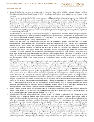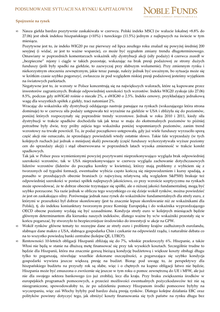 PODSUMOWANIE SYTUACJI NA RYNKU KAPITAŁOWYM Spojrzenie na rynek • • • Nasza giełda bardzo pozytywnie zaskakiwała w czerwcu. Polski indeks MSCI (w walucie lokalnej +8.8% do 27.06) jest obok indeksu hiszpańskiego (+10%) i tureckiego (11.5%) jednym z najlepszych na świecie w tym miesiącu. Pozytywne jest to, że indeks WIG20 po raz pierwszy od lipca zeszłego roku znalazł się powyżej średniej 200 sesyjnej (i widać, ze jest to ważne wsparcie), co może być sygnałem zmiany trendu długoterminowego. Omawiany w poprzednich komentarzach wskaźnik siły dystrybucji akcji (siły podaży) 4 czerwca zszedł w „bezpieczne” rejony i ciągle w takich pozostaje, wskazując na brak presji podażowej ze strony dużych funduszy (jeśli były spadki na giełdzie, to zazwyczaj przy słabszym wolumenie). Przy zmiennym rynku i niekorzystnym otoczeniu zewnętrznym, jakie teraz panuje, należy jednak być uważnym, bo sytuacja może się w krótkim czasie szybko pogorszyć, zwłaszcza że pod względem niskiej presji podażowej jesteśmy wyjątkiem na światowych parkietach. Negatywne jest to, że wzrosty w Polsce koncentrują się na największych walorach, które są kupowane przez inwestorów zagranicznych. Brakuje odpowiedniej szerokości tych wzrostów. Indeks WIG20 zyskuje (do 27.06) 8.5%, podczas gdy mWIG40 rośnie o niecałe 2%, a sWIG80 o 2.5%. Indeks cenowy, przykładający jednakową wagę dla wszystkich spółek z giełdy, traci natomiast 2%. Wracając do wskaźnika siły dystrybucji oddającego nastroje panujące na rynkach (wskazującego która strona dominuje) to w czerwcu siła podaży ustępowała też wyraźnie na giełdzie w USA i zbliżyła się do poziomów, poniżej których rozpoczynały się poprzednie trendy wzrostowe. Jednak w roku 2010 i 2011, kiedy siła dystrybucji w trakcie spadków dochodziła tak jak teraz w maju do ekstremalnych poziomów to później potrzebne były dwie, trzy próby zejścia tego wskaźnika poniżej wspomnianych poziomów, zanim trend wzrostowy na trwałe powrócił. To, że podaż początkowo ustępowała, gdy już wiele funduszy wyrzuciło sporą część akcji nie oznaczało, że sprzedający powiedzieli wtedy ostatnie słowo. Takie fale wyprzedaży (w tych kolejnych ruchach już jednak o mniejszej skali) powracały (część funduszy wykorzystywała wyższe poziomy cen do sprzedaży akcji) i stąd obserwowana w poprzednich latach wysoka zmienność w trakcie korekt spadkowych. Tak jak w Polsce poza wymienionymi powyżej pozytywami nieprzekonywująco wygląda brak odpowiedniej szerokości wzrostów, tak w USA nieprzekonywująco w czerwcu wygląda zachowanie dotychczasowych liderów wzrostów (liderów do początku korekty w kwietniu), którzy mają problemy z wybiciem się z tworzonych od tygodni formacji, ewentualne wybicia często kończą się niepowodzeniem i kursy spadają, a ponadto w przodujących obecnie branżach (z najwyższą relatywną siłą względem S&P500) brakuje też odpowiedniej szerokości w postaci spółek najlepszych jakościowo, co przy wzroście sceptycyzmu na rynkach może spowodować, że te dobrze obecnie trzymające się spółki, ale o niższej jakości fundamentalnej, mogą być szybko porzucone. Na razie jednak w obliczu tego wszystkiego co się dzieje wokół rynków, można powiedzieć że jest on zaskakująco silny. Porównując jednak nasz rynek do wskaźników fundamentalnych dla strefy euro, z którymi w przeszłości był dobrze skorelowany (jest tu znacznie lepsze skorelowanie niż ze wskaźnikami dla Polski), tj. do indeksu koniunktury tworzonym przez Komisję Europejską i do wskaźnika wyprzedzającego OECD obecne poziomy wydają się być uzasadnione. Kondycja strefy euro w kolejnych miesiącach będzie głównym determinantem dla kierunku naszych indeksów, dlatego ważne by w/w wskaźniki przestały się w końcu pogarszać, by stworzyło to bezpieczniejsze środowisko do inwestycji w akcje na GPW. Wokół rynków główne tematy to: recesyjne dane ze strefy euro i problemy krajów zadłużonych eurolandu, słabnące dane makro z USA, słabnąca gospodarka Chin i czekanie na odpowiedź rządu, i naturalnie debata co na to wszystko powiedzą banki centralne (kolejne QE, LTRO?). Rentowności 10-letnich obligacji Hiszpanii zbliżają się do 7%, włoskie przekroczyły 6%. Hiszpanie, a także Włosi nie będą w stanie na dłuższą metę finansować się przy tak wysokich kosztach. Szczególnie trudne to będzie dla Hiszpanii, która ma znacznie gorszą bieżącą kondycję budżetową i większe koszty obsługi długu tylko to pogarszają, niwelując wszelkie dokonane oszczędności, a pogarszająca się szybko kondycja gospodarki wywiera jeszcze większą presję na budżet. Biorąc pod uwagę to, że perspektywy dla hiszpańskiego budżetu na przyszły rok są słabe, więc i o chętnych na kupno obligacji łatwo nie będzie, Hiszpania może być zmuszona o zwrócenie się jeszcze w tym roku o pomoc zewnętrzną do UE i MFW, ale już nie dla swojego sektora bankowego (co już zrobiła), lecz dla kraju. Przy braku zwiększenia środków w europejskich programach pomocowych, a przecież możliwości ewentualnych pożyczkodawców też nie są nieograniczone, spowodowałoby to, że po udzieleniu pomocy Hiszpanom środki pomocowe byłyby na wyczerpaniu, więc zaś Włochy byłyby pod bardzo dużą presją rynków. Dlatego kolejne działania EBC oraz polityków powinny dotyczyć tego, jak obniżyć koszty finansowania się tych państw na rynku długu bez PODSUMOWANIE SYTUACJI NA RYNKU KAPITAŁOWYM • • • sięgania po pomoc z programów pomocowych. Wiele mówi się o rozwiązaniach długoterminowych (tego m.in. będzie dotyczył szczyt 28-29 czerwca), ale pilne są też decyzje krótkoterminowe (też będą dyskutowane na szczycie, tylko nie wiadomo czy zapadną konkretne decyzje). Nie chodzi tu o emisje euroobligacji czy eurobonów, bo Niemcy słusznie nie zgodzą się na dzielenie, a raczej