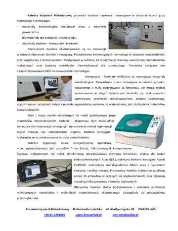 Katedra Inżynierii Materiałowej prowadzi badania naukowe i rozwojowe w obszarze trzech grup materiałów i technologii: materiały konstrukcyjne metalowe wraz z inżynierią powierzchni, biomateriały dla ortopedii i stomatologii, materiały złożone – kompozyty i laminaty. Realizowane badania ukierunkowane są na innowacje w różnych obszarach techniki i medycyny. Poszukiwania innowacyjnych technologii w obszarze biomateriałów, przy współpracy z Uniwersytetem Medycznym w Lublinie, to modyfikacja warstwy wierzchniej biomateriałów metalowych oraz badania materiałów niemetalowych dla stomatologii. Tematyka związana jest z zapotrzebowaniem MŚP na nowoczesne technologie. Kompozyty i laminaty włókniste to rozwojowe materiały konstrukcyjne. Prowadzone prace rozwojowe w ramach projektu kluczowego z POIG dedykowane są lotnictwu, ale mogą znaleźd zastosowanie w innych dziedzinach techniki, np. elektrowniach wiatrowych, przemyśle motoryzacyjnym, sprzętu sportowego, części maszyn i urządzeo. Katedra posiada wyposażenie zarówno do wytwarzania, jak i do badania materiałów kompozytowych. Stale i stopy metali nieżelaznych to nadal podstawowa grupa materiałów konstrukcyjnych. Badania i ekspertyzy tych materiałów, zwłaszcza dla motoryzacji i energetyki, opracowania metod regeneracji części maszyn, np. natryskiwanie cieplne, badania korozyjne i zabezpieczenia antykorozyjne to stała oferta Katedry. Katedra dysponuje nową specjalistyczną aparaturą, m.in. wykorzystywany jest autoklaw firmy Scholz, mikrotomograf komputerowy SkyScan, dyfraktometr rtg HZG4, defektoskop ultradźwiękowy Olympus OmniScan, zestaw do badao elektrochemicznych Atlas 0531, cykliczna komora korozyjna Ascott CC450XP, mikroskopy metalograficzne Nikon wraz z systemem akwizycji i analizy obrazu. Pracownicy Katedry rokrocznie publikują ponad 25 artykułów w liczących się wydawnictwach, oraz zgłaszają i uzyskują kilka patentów i wzorów użytkowych. Oferujemy również studia podyplomowe i szkolenia w zakresie nowoczesnych materiałów i technologii materiałowych, skierowanych szczególnie do pracowników przedsiębiorstw. Katedra Inżynierii Materiałowej +48 81 5384209 Politechnika Lubelska www.kim.pollub.pl ul. Nadbystrzycka 36 20-618 Lublin [email protected]
