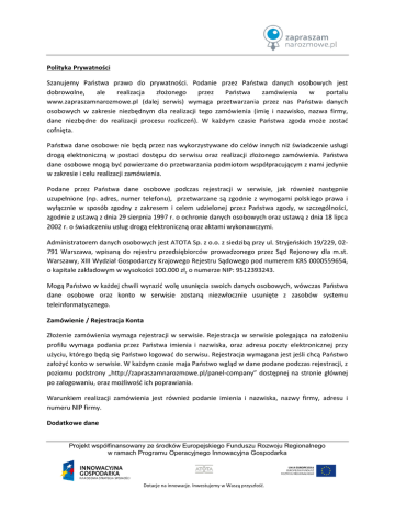 Polityka Prywatności Szanujemy Państwa prawo do prywatności. Podanie przez Państwa danych osobowych jest dobrowolne, ale realizacja złożonego przez Państwa zamówienia w portalu www.zapraszamnarozmowe.pl (dalej serwis) wymaga przetwarzania przez nas Państwa danych osobowych w zakresie niezbędnym dla realizacji tego zamówienia (imię i nazwisko, nazwa firmy, dane niezbędne do realizacji procesu rozliczeń). W każdym czasie Państwa zgoda może zostać cofnięta. Państwa dane osobowe nie będą przez nas wykorzystywane do celów innych niż świadczenie usługi drogą elektroniczną w postaci dostępu do serwisu oraz realizacji złożonego zamówienia. Państwa dane osobowe mogą być powierzane do przetwarzania podmiotom współpracującym z nami jedynie w zakresie i celu realizacji zamówienia. Podane przez Państwa dane osobowe podczas rejestracji w serwisie, jak również następnie uzupełnione (np. adres, numer telefonu), przetwarzane są zgodnie z wymogami polskiego prawa i wyłącznie w sposób zgodny z zakresem i celem udzielonej przez Państwa zgody, w szczególności, zgodnie z ustawą z dnia 29 sierpnia 1997 r. o ochronie danych osobowych oraz ustawą z dnia 18 lipca 2002 r. o świadczeniu usług drogą elektroniczną oraz aktami wykonawczymi. Administratorem danych osobowych jest ATOTA Sp. z o.o. z siedzibą przy ul. Stryjeńskich 19/229, 02791 Warszawa, wpisaną do rejestru przedsiębiorców prowadzonego przez Sąd Rejonowy dla m.st. Warszawy, XIII Wydział Gospodarczy Krajowego Rejestru Sądowego pod numerem KRS 0000559654, o kapitale zakładowym w wysokości 100.000 zł, o numerze NIP: 9512393243. Mogą Państwo w każdej chwili wyrazić wolę usunięcia swoich danych osobowych, wówczas Państwa dane osobowe oraz konto w serwisie zostaną niezwłocznie usunięte z zasobów systemu teleinformatycznego. Zamówienie / Rejestracja Konta Złożenie zamówienia wymaga rejestracji w serwisie. Rejestracja w serwisie polegająca na założeniu profilu wymaga podania przez Państwa imienia i nazwiska, oraz adresu poczty elektronicznej przy użyciu, którego będą się Państwo logować do serwisu. Rejestracja wymagana jest jeśli chcą Państwo założyć konto w serwisie. W każdym czasie maja Państwo wgląd w dane podane podczas rejestracji, z poziomu podstrony „http://zapraszamnarozmowe.pl/panel-company” dostępnej na stronie głównej po zalogowaniu, oraz możliwość ich poprawiania. Warunkiem realizacji zamówienia jest również podanie imienia i nazwiska, nazwy firmy, adresu i numeru NIP firmy. Dodatkowe dane Projekt współfinansowany ze środków Europejskiego Funduszu Rozwoju Regionalnego w ramach Programu Operacyjnego Innowacyjna Gospodarka Dotacje na innowacje. Inwestujemy w Waszą przyszłość. Mogą Państwo również podać nam dodatkowe dane nie związane bezpośrednio z realizacją zamówienia, które będą pomocne w realizacji zamówienia np. adres korespondencyjny, dane kontaktowe w postaci numer telefonu. Dane te będą przez nas wykorzystywane wyłącznie w celu realizacji złożonego przez Państwa zamówienia. Informacje handlowe Mogą Państwo wyrazić zgodę na otrzymywanie od nas na wskazany adres poczty elektronicznej (email) informacji handlowych w rozumieniu ustawy o świadczeniu usług drogą elektroniczną dotyczących w szczególności dostępnych produktów, ofert, itp., pozostawiając w naszej bazie swój adres mailowy. W każdym czasie możecie Państwo zrezygnować z otrzymywania takich informacji, poprzez wybranie aktywnego pola „zrezygnuj z newslettera” znajdującego się w każdej wysłanej przez nas wiadomości handlowej w stopce, lub przesyłając wiadomość za pośrednictwem poczty elektronicznej na adres [email protected], lub odznaczając pole „newsletter” w zakładce Notyfikacje, dostępnej w panelu firmowym po zalogowaniu. Dane gromadzone przez witrynę Przeglądanie serwisu internetowego www.zapraszamnarozmowe.pl możliwe jest bez podawania jakichkolwiek Państwa danych osobowych. Przy każdorazowym otwarciu witryny serwisu przez Państwa przeglądarkę internetową przekazywane są dane dotyczące daty, czasu pobytu w serwisie, nazwy Państwa dostawcy usług internetowych. Powyższe dane są przez nas wykorzystywane wyłącznie anonimowo, to znaczy bez powiązania z konkretną osobą, chyba że korzystają Państwo z serwisu jako zalogowani użytkownicy. Serwis umieszcza na Państwa sprzęcie przy użyciu, którego wyświetlają Państwo stronę internetową serwisu pliki cookies. Cookies to małe ilości danych, które Państwa przeglądarka internetowa zapisuje na Państwa komputerze. Używanie cookies umożliwia nam dostosowanie świadczonych usług i prezentowanych treści w serwisie do Państwa indywidualnych zainteresowań, wymagań i potrzeb. Cookies wykorzystywane są także w celach statystycznych mających obrazować sposób wykorzystania serwisu przez użytkowników. Mają Państwo możliwość wyłączenia w swojej przeglądarce internetowej opcji przyjmowania plików cookies. Zabieg ten może jednak spowodować utrudnienie lub uniemożliwienie korzystania z wszystkich funkcji serwisu. Projekt współfinansowany ze środków Europejskiego Funduszu Rozwoju Regionalnego w ramach Programu Operacyjnego Innowacyjna Gospodarka Dotacje na innowacje. Inwestujemy w Waszą przyszłość.