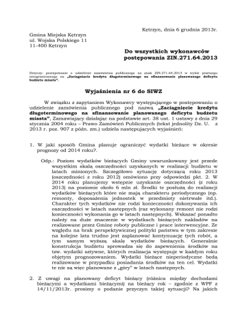 Kętrzyn, dnia 6 grudnia 2013r. Gmina Miejska Kętrzyn ul. Wojska Polskiego 11 11-400 Kętrzyn Do wszystkich wykonawców postępowania ZIN.271.64.2013 Dotyczy: postępowanie o udzielenie zamówienia publicznego na znak ZIN.271.64.2013 w trybie przetargu nieograniczonego na „Zaciągnięcie kredytu długoterminowego na sfinansowanie planowanego deficytu budżetu miasta”. Wyjaśnienia nr 6 do SIWZ W związku z zapytaniem Wykonawcy występującego w postępowaniu o udzielenie zamówienia publicznego pod nazwą „Zaciągnięcie kredytu długoterminowego na sfinansowanie planowanego deficytu budżetu miasta”, Zamawiający działając na podstawie art. 38 ust. 1 ustawy z dnia 29 stycznia 2004 roku – Prawo Zamówień Publicznych (tekst jednolity Dz. U. z 2013 r. poz. 907 z późn. zm.) udziela następujących wyjaśnień: 1. W jaki sposób Gmina planuje ograniczyć wydatki bieżące w okresie prognozy od 2014 roku?. Odp.: Poziom wydatków bieżących Gminy uwarunkowany jest przede wszystkim skalą oszczędności uzyskanych w realizacji budżetu w latach minionych. Szczegółowo sytuację dotyczącą roku 2013 (oszczędności z roku 2012) omówiono przy odpowiedzi pkt. 2. W 2014 roku planujemy wstępnie uzyskanie oszczędności (z roku 2013) na poziomie około 6 mln zł. Środki te posłużą do realizacji wydatków bieżących które nie mają charakteru periodycznego (np. remonty, doposażenia jednostek w przedmioty nietrwałe itd.). Charakter tych wydatków nie rodzi konieczności dokonywania ich oszczędności w latach następnych (raz wykonany remont nie rodzi konieczności wykonania go w latach następnych). Wskazać ponadto należy na duże znaczenie w wydatkach bieżących nakładów na realizowane przez Gminę roboty publiczne i prace interwencyjne. Ze względu na brak perspektywicznej polityki państwa w tym zakresie na kolejne lata trudno jest zaplanować kontynuację tych robót, a tym samym wyższą skalę wydatków bieżących. Generalnie konstrukcja budżetu sprowadza się do zapewnienia środków na tzw. wydatki sztywne, których realizacja występuje w każdym roku objętym prognozowaniem. Wydatki bieżące nieperiodyczne będą realizowane w przypadku posiadania środków na ten cel. Wydatki te nie są więc planowane z „góry” w latach następnych. 2. Z uwagi na planowany deficyt bieżący (różnica między dochodami bieżącymi a wydatkami bieżącymi) na bieżący rok – zgodnie z WPF z 14/11/2013r. prosimy o podanie przyczyn takiej sytuacji? Na jakich poziomach wydatków i dochodów nastąpiły główne zmiany oraz z jakich powodów? Co spowodowało znaczący wzrost wydatków bieżących w stosunku do 2012r.?. Odp.: Gmina Miejska Kętrzyn wypracowała za rok 2012 nadwyżkę budżetową w kwocie 3.787.547 zł oraz dysponowała środkami o których mowa w art. 217 ust. 2 pkt. 6 ustawy o finansach publicznych w kwocie 2.885.602 zł. Łącznie z tytułu oszczędnej gospodarki finansowej prowadzonej w 2012 roku Gmina dysponowała w 2013 roku środkami w kwocie 6.673.149 zł. Środki te (oszczędności) przeznaczono na spłatę planowanych na 2013 rok rat kredytów w kwocie 2.826.125 zł, a pozostała kwota włączona została do budżetu roku 2013 i przeznaczona zarówno na wydatki bieżące jak i majątkowe, powodując wzrost deficytu bieżącego roku (oszczędności wynikające z lat ubiegłych stanowią przychody, które po włączeniu do budżetu wpływają na wielkość deficytu). Oszczędności roku 2012 przeznaczono m.in. na następujące wydatki bieżące: remont czytelni i pomieszczeń administracyjnych Biblioteki oraz obchody 150 rocznicy śmierci Arno Holza – kwota 150.000 zł, prace interwencyjne i roboty publiczne – kwota 700.000 zł, zabezpieczenie środków na dopłaty do komunikacji miejskiej – kwota 200.000 zł, remonty szkół – kwota 150.000 zł. Wydatki te zostały dokonane wyłącznie w oparciu o powstałe oszczędności. W 2013 roku Gmina zabezpieczyła ponadto środki na remonty ulic (wymianę dywaników asfaltowych) w kwocie 1.800.000 zł. Występująca na dzień 14/11/2013 roku różnica w planie pomiędzy dochodami bieżącymi i wydatkami bieżącymi w kwocie 2.696.533 zł (dochody bieżące 66.485.930 zł, wydatki bieżące 69.182.463 zł) dotyczy wydatków nieperiodycznych których realizacja w latach następnych nie jest planowana, a możliwa była w roku bieżącym ze względu na wypracowane oszczędności (remonty biblioteki, szkół, dopłaty do komunikacji miejskiej – zakupiono cztery nowe autobusy, rozszerzono front robót publicznych, położono nowe dywaniki asfaltowe ....). 3. Czy w przeszłości występowała konieczność spłat rat z tytułu udzielonego poręczenia dla BS Mikołajki oraz w jakich wysokościach (dotyczy: PGK Komunalnik)?. Odp. Nie. Z poważaniem Z up. Burmistrza Miasta /-/ Władysław Litwinowicz Skarbnik Miasta
