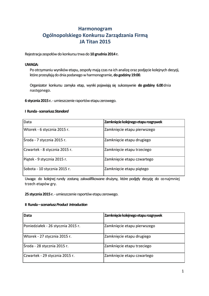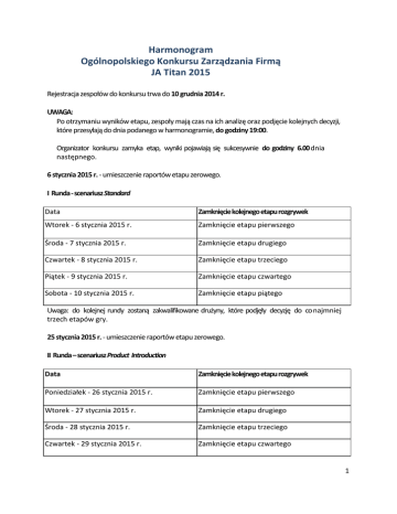 Harmonogram Ogólnopolskiego Konkursu Zarządzania Firmą JA Titan 2015 Rejestracja zespołów do konkursu trwa do 10 grudnia 2014 r. UWAGA: Po otrzymaniu wyników etapu, zespoły mają czas na ich analizę oraz podjęcie kolejnych decyzji, które przesyłają do dnia podanego w harmonogramie, do godziny 19:00. Organizator konkursu zamyka etap, wyniki pojawiają się sukcesywnie do godziny 6.00 dnia następnego. 6 stycznia 2015 r. - umieszczenie raportów etapu zerowego. I Runda - scenariusz Standard Data Zamknięcie kolejnego etapu rozgrywek Wtorek - 6 stycznia 2015 r. Zamknięcie etapu pierwszego Środa - 7 stycznia 2015 r. Zamknięcie etapu drugiego Czwartek - 8 stycznia 2015 r. Zamknięcie etapu trzeciego Piątek - 9 stycznia 2015 r. Zamknięcie etapu czwartego Sobota - 10 stycznia 2015 r. Zamknięcie etapu piątego Uwaga: do kolejnej rundy zostaną zakwalifikowane drużyny, które podjęły decyzję do co najmniej trzech etapów gry. 25 stycznia 2015 r. - umieszczenie raportów etapu zerowego. II Runda – scenariusz Product Introduction Data Zamknięcie kolejnego etapu rozgrywek Poniedziałek - 26 stycznia 2015 r. Zamknięcie etapu pierwszego Wtorek - 27 stycznia 2015 r. Zamknięcie etapu drugiego Środa - 28 stycznia 2015 r. Zamknięcie etapu trzeciego Czwartek - 29 stycznia 2015 r. Zamknięcie etapu czwartego 1 Piątek - 30 stycznia 2015 r. Zamknięcie etapu piątego Sobota - 31 stycznia 2015 r. Zamknięcie etapu szóstego Uwaga: do kolejnej rundy zostaną zakwalifikowane drużyny, które wpisały decyzje do co najmniej trzech etapów gry. 15 lutego 2014 r. - umieszczenie raportów etapu zerowego. III Runda – scenariusz Global Competition Data Zamknięcie kolejnego etapu rozgrywek Poniedziałek - 16 lutego 2015 r. Zamknięcie etapu pierwszego Wtorek - 17 lutego 2015 r. Zamknięcie etapu drugiego Środa - 18 lutego 2015 r. Zamknięcie etapu trzeciego Czwartek - 19 lutego 2015 r. Zamknięcie etapu czwartego Piątek - 20 lutego 2015 r. Zamknięcie etapu piątego Poniedziałek - 23 lutego 2015 r. Zamknięcie etapu szóstego Wtorek - 24 lutego 2015 r. Zamknięcie etapu siódmego Środa - 25lutego 2015 r. Zamknięcie etapu ósmego Czwartek - 26 lutego 2015 r. Zamknięcie etapu dziewiątego Piątek - 27 lutego 2015 r. Zamknięcie etapu dziesiątego Informacja o ilości drużyn zakwalifikowanych do kolejnych rund zostanie podana na stronie konkursu. 8 marca 2015r. - umieszczenie raportów etapu zerowego. IV Runda - scenariusz Industry lnnovation Data Zamknięcie kolejnego etapu rozgrywek Poniedziałek - 9 marca 2015 r. Zamknięcie etapu pierwszego Wtorek - 10 marca 2015 r. Zamknięcie etapu drugiego 2 Środa - 11 marca 2015 r. Zamknięcie etapu trzeciego Czwartek - 12 marca 2015 r. Zamknięcie etapu czwartego Piątek - 13 marca 2015 r. Zamknięcie etapu piątego Poniedziałek - 16 marca 2015 r. Zamknięcie etapu szóstego Wtorek - 17 marca 2015 r. Zamknięcie etapu siódmego Środa - 18 marca 2015 r. Zamknięcie etapu ósmego Czwartek - 19 marca 2015 r. Zamknięcie etapu dziewiątego Piątek -20 marca 2015 r. Zamknięcie etapu dziesiątego W razie potrzeby w piątek 27 marca 2015 r. rozegrane zostaną on-line rozgrywki półfinałowe – scenariusz Full Business Cycle Rozgrywki finałowe dla najlepszych zespołów odbędą się w Warszawie (lub jej okolicach) w dniach 15, 16 i 17 kwietnia 2015 r. Uwaga: Jeśli drużyna nie podejmie 50 % decyzji w trakcie trwania rundy, zgodnie z regulaminem nie może przejść dalej, pomimo zajęcia wiodącego miejsca w swojej grupie. 3