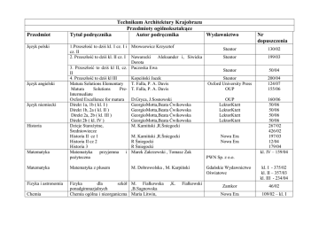 Technikum Architektury Krajobrazu Przedmioty ogólnokształcące Autor podręcznika Wydawnictwo Przedmiot Tytuł podręcznika Język polski 1.Przeszłość to dziś kl. I cz. I i Mrowcewicz Krzysztof Stentor cz. II 2. Przeszłość to dziś kl. II cz. I Nawarecki Aleksander i, Siwicka Stentor Dorota 3. Przeszłość to dziś kl II, cz. Paczoska Ewa Stentor II 4. Przeszłość to dziś kl III Kopciński Jacek Stentor Matura Solutions Elementary T. Falla, P. A. Davis Oxford University Press Matura Solutions Pre- T. Falla, P. A. Davis OUP Intermediate Oxford Excellence for matura D.Gryca, J.Sosnowski OUP Direkt 1a, 1b ( kl. I ) GeorgioMotta,Beata Ćwikowska LektorKtett Direkt 1b, 2a ( kl. II ) GeorgioMotta,Beata Ćwikowska LektorKtett Direkt 2a, 2b ( kl. III ) GeorgioMotta,Beata Ćwikowska LektorKtett Direkt 2b ( kl. IV ) GeorgioMotta,Beata Ćwikowska LektorKtett Dzieje Starożytne, M. Kamiński ,R.Śniegocki Średniowiecze Historia II cz 1 M. Kamiński ,R.Śniegocki Nowa Era Historia II cz 2 R Śniegocki Nowa Era Historia 3 R Śniegocki Matematyka przyjemna i Marek Zakrzewski , Tomasz Żak pożyteczna PWN Sp. z o.o. Język angielski Język niemiecki Historia Matematyka M. Dobrowolska , M. Karpiński Matematyka Matematyka z plusem Fizyka i astronomia Fizyka dla szkół M. Fiałkowska ponadgimnazjalnych ,B.Sagnowska Chemia ogólna i nieorganiczna Maria Litwin, Chemia ,K. Fiałkowski Nr dopuszczenia 130/02 199/03 50/04 200/04 124/07 155/06 160/06 50/06 50/06 50/06 50/06 267/02 426/02 197/03 12/04 179/04 kl. IV – 159/04 Gdańskie Wydawnictwo Oświatowe kl. I - 375/02 kl. II – 357/03 kl. III - 234/04 Zamkor 46/02 Nowa Era 109/02 – kl. I Biologia Geografia Przysposobienie obronne Technologia informacyjna Podstawy przedsiębiorczości Wiedza o społeczeństwie – zakres podstawowy Chemia organiczna – zakres podstawowy Biologia Geografia-bogactwo przyrodnicze Ziemi Geografia czII Bądźmy bezpieczni .cz. I i cz. II Technologia informacyjna Czas na przedsiębiorczość Wiedza o społeczeństwie Szarota, Styka-Wlazło, J. Szymońska Maria Litwin, Szarota, Styka-Wlazło, J. Szymońska A. Jerzmanowski P. Wład J. Kop, M. Kucharska, E. Szkurłat Mieczysław Borowiecki ,Zbigniew Pytasz, Edward Rygała Praca zbiorowa Katarzyna Garbacik Magdalena Żmijko Z. Smutek , J. Maleska, B. Surmacz Nowa Era 166/03 – kl. II WSiP Ortus 120/04 83/02 PWN 54/03 21/05 3/06 PWN PWN 26/07 Wydawnictwo Szkolne PWN DKOS-500275/07 Operon 139/04 Hortpress 24/04 zawód - technik architektury krajobrazu Klasa I Podstawy projektowania architektury krajobrau Rośliny ozdobne Urządzanie i pielęgnacja obiektów architektury krajobrazu Podstawy krajobrazu cz. I architektury E. Gadomska , K. Gańko , M. Garczarczyk , K.Zinowiec-Cieplik Rośliny ozdobne architekturze Praca zbiorowa krajobrazu cz. I Urządzanie terenów zieleni A. Bartosiewicz Urządzanie i pielęgnacja K .Gadomski, E. Gadomska terenów zieleni cz. I Urządzenie terenów zieleni A. Bartosiewicz Hortpress WSiP 24/04 05/98 Hortpress 10/05 WSiP 05/98 Ochrona i kształtowanie krajobrazu Podstawy krajobrazu cz II architektury E. Gadomska, A. Różańska, B. Sikora Hortpress 18/05 P. Latocha Hortpress 22/05 L. Startek, K. Mynett E. Gadomska, K. Gańko, M Garczarczyk, K. Zinowiec-Cieplik Hortpress 33/96 Hortpress 24/04 Hortpress 10/05 WSiP 05/98 Hortpress 18/05 Hortpress 24/2004 WSiP 65/98 Klasa II Rośliny ozdobne Podstawy projektowania architektury krajobrazu Urządzanie i pielęgnacja obiektów architektury krajobrazu Ochrona i kształtowanie krajobrazu Rośliny ozdobne w architekturze krajobrazu cz. II Rośliny ozdobne Podstawy architektury krajobrazu cz. I Urządzanie i pielęgnacja K .Gadomski, E. Gadomska terenów zieleni cz. I Urządzenie terenów zieleni A. Bartosiewicz Podstawy Architektury E. Gadomska, A. Różańska, B. Sikora Krajobrazu cz. II Klasa III Podstawy architektury krajobrazu Maszyny i urządzenia techniczne Rośliny ozdobne Podstawy Krajobrazu cz. I Architektury E. Gadomska, K. Gańko i inni Maszyny i urządzenia rolnicze Rośliny ozdobne w architekturze krajobrazu cz. III i cz, IV; Rośliny ozdobne Cz. Waszkiwewicz P. Latocha , L. Startek, K. Mynett Hortpress Hortpress 22/05 – cz III 26/06 – cz. IV Urządzanie i pielęgnacja terenów zieleni Ochrona kształtowanie krajobrazu Rośliny ozdobne Urządzanie i pielęgnacja terenów zieleni cz III; Urządzanie terenów zieleni i Podstawy Architektury Krajobrazu cz. II; Kształtowanie terenów zieleni Hortpress 10/05 A. Bartosiewicz E. Gadomska, A. Różańska, B. Sikora WSiP Hortpress 05/98 18/05 WSiP 4/98 Hortpress Hortpress 33/96 54/03/2004 A. Bartosiewicz K. Gadomski, E. Gadomska WSiP Hortpress 5/98 10/05 J. Pokorski , A. Siwiec WSiP 1998 4/98 E. Gadomska, K. Gańko i inni Hortpress 24/2004 E. Gadomska , A. Różańska K. Gadomski, E. Gadomska Hortpress Hortpress 18/2005 A. Kożuch, A. Marcysiak, B. Piechowicz WSiP 93/99 J. Pokorski, A. Siwiec Klasa IV L. Startek, K. Mynett dekoracje A. Nizińska Rośliny ozdobne Bukieciarstwo i roślinne Urządzanie Urządzenie terenów zieleni; i pielęgnacja Urządzanie i pielęgnacja terenów zieleni terenów zieleni cz. III Pracownia Kształtowanie terenów zieleni; architektury Podstawy Architektury krajobrazu Krajobrazu cz. I; Podstawy Architektury Krajobrazu cz II; Urządzanie i pielęgnacja terenów zieleni cz I Ekonomika i zarządzanie firmą K .Gadomski, E. Gadomska Podstawy rachunkowości cz . I