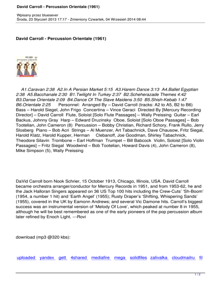 David Carroll - Percussion Orientale (1961) Wpisany przez bluesever Środa, 23 Styczeń 2013 17:17 - Zmieniony Czwartek, 04 Wrzesień 2014 08:44 David Carroll - Percussion Orientale (1961) A1.Caravan 2:38 A2.In A Persian Market 5:15 A3.Harem Dance 3:13 A4.Ballet Egyptian 2:38 A5.Bacchanale 2:30 B1.Twilight In Turkey 2:37 B2.Scheherazade Themes 4:42 B3.Danse Orientale 2:09 B4.Dance Of The Slave Maidens 3:50 B5.Shish-Kebab 1:47 B6.Orientale 2:25 Personnel: Arranged By – David Carroll (tracks: A2 to A5, B2 to B6) Bass – Harold Siegel, John Frigo Concertina – Vince Geraci Directed By [Mercury Recording Director] – David Carroll Flute, Soloist [Solo Flute Passages] – Wally Preissing Guitar – Earl Backus, Johnny Gray Harp – Edward Druzinsky Oboe, Soloist [Solo Oboe Passages] – Bob Tootelian, John Cameron (8) Percussion – Bobby Christian, Richard Schory, Frank Rullo, Jerry Slosberg Piano – Bob Acri Strings – Al Muenzer, Art Tabachnick, Dave Chausow, Fritz Siegal, Harold Klatz, Harold Kupper, Herman Clebanoff, Joe Goodman, Shirley Tabachnick, Theodore Silavin Trombone – Earl Hoffman Trumpet – Bill Babcock Violin, Soloist [Solo Violin Passages] – Fritz Siegal Woodwind – Bob Tootelian, Howard Davis (4), John Cameron (8), Mike Simpson (5), Wally Preissing DaVid Carroll born Nook Schrier, 15 October 1913, Chicago, Illinois, USA. David Carroll became orchestra arranger/conductor for Mercury Records in 1951, and from 1953-62, he and the Jack Halloran Singers appeared on 36 US Top 100 hits including the Crew-Cuts’ ‘Sh-Boom’ (1954, a number 1 hit) and ‘Earth Angel’ (1955); Rusty Draper’s ‘Shifting, Whispering Sands’ (1955), covered in the UK by Eamonn Andrews; and several Vic Damone hits. Carroll’s biggest success was an instrumental version of ‘Melody Of Love’, which peaked at number 8 in 1955, although he will be best remembered as one of the early pioneers of the pop percussion album later refined by Enoch Light. ---Rovi download (mp3 @320 kbs): uploaded yandex gett 4shared mediafire mega solidfiles zalivalka cloudmailru fil 1/2 David Carroll - Percussion Orientale (1961) Wpisany przez bluesever Środa, 23 Styczeń 2013 17:17 - Zmieniony Czwartek, 04 Wrzesień 2014 08:44 ecloudio anonfiles oboom back 2/2