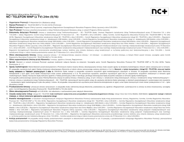 Regulamin Warunków Promocji: NC+ TELEFON MNP (z TV) 24m (9/16) 1. 2. 3. 4. 5. Organizator Promocji: ITI Neovision S.A. (Dostawca usług). Nazwa Promocji: NC+ TELEFON MNP (z TV) 24m (9/16) (Promocja). Oferta Łączona: Program Oferty Łączonej, uregulowany Regulaminem Szczegółowych Warunków Programu Oferty Łączonej z dnia 5.09.2016 r. Opis Promocji: Promocja umożliwia korzystanie z Usług Telekomunikacyjnych Dostawcy usług, w ramach Programu Oferty Łączonej. Dokumenty dotyczące Promocji: Umowa o świadczenie Usług Telekomunikacyjnych – NC+ TELEFON (dalej: Umowa), Regulamin świadczenia Usług Telekomunikacyjnych przez ITI Neovision S.A. z dnia 7.03.2016 r. (dalej: Regulamin), Cennik Usług Telekomunikacyjnych ITI Neovision S.A. – NC+ TELEFON z dnia 5.09.2016 r. (dalej: Cennik), Cennik Regulaminu Warunków Promocji NC+ TELEFON MNP (z TV) 24m (9/16), Regulamin Szczegółowych Warunków świadczenia Usługi NC+ TELEFON z dnia 5.09.2016 r., Cennik Regulaminu Szczegółowych Warunków świadczenia Usługi NC+ TELEFON z dnia 5.09.2016 r., Regulamin Szczegółowych Warunków świadczenia Usługi nc+ doładowanie 2GB Mobile z dnia 5.09.2016 r., Cennik Regulaminu Szczegółowych Warunków świadczenia Usługi nc+ doładowanie 2GB Mobile z dnia 5.09.2016 r., Regulamin Szczegółowych Warunków świadczenia Usługi 5GB Mobile z dnia 5.09.2016 r., Cennik Regulaminu Szczegółowych Warunków świadczenia Usługi 5GB Mobile z dnia 5.09.2016 r., Regulamin Szczegółowych Warunków świadczenia Usługi Noce bez limitu Mobile z dnia 5.09.2016 r., Cennik Regulaminu Szczegółowych Warunków świadczenia Usługi Noce bez limitu Mobile z dnia 5.09.2016 r., Regulamin Szczegółowych Warunków Programu Oferty Łączonej z dnia 5.09.2016 r., Regulamin Szczegółowych Warunków świadczenia Usług połączeń międzynarodowych oraz roamingu międzynarodowego świadczonych przez ITI Neovision S.A. z dnia 5.09.2016 r., Cennik Regulaminu Szczegółowych Warunków świadczenia Usług połączeń międzynarodowych oraz roamingu międzynarodowego świadczonych przez ITI Neovision S.A. z dnia 5.09.2016 r., Regulamin Szczegółowych Warunków przenoszenia przydzielonego numeru telefonu przy zmianie dostawcy usług świadczonych w ruchomej publicznej sieci telekomunikacyjnej z dnia 7.03.2016 r., Cennik świadczenia Usług w trakcie trwania przeniesienia numeru do ITI Neovision S.A. z dnia 5.09.2016 r. 6. Okres obowiązywania Umowy: miesiąc zawarcia Umowy + 23 miesiące/miesiąc zawarcia Umowy + 22 miesiące - w zależności od dnia miesiąca, w którym Klient zawarł Umowę, szczegóły: patrz Cennik Regulaminu Warunków Promocji NC+ TELEFON MNP (z TV) 24m (9/16). 7. Okres wypowiedzenia Umowy przez Abonenta: 1 miesiąc, zgodnie z Umową, Regulaminem. 8. Sprzęt: Abonent w ramach niniejszej Promocji uzyskuje możliwość nabycia Sprzętu na własność. Szczegóły patrz: Cennik Regulaminu Warunków Promocji NC+ TELEFON MNP (z TV) 24m (9/16), Tabela Promocyjna 6 i 7. 9. Zgody marketingowe: Klient/Abonent przed skorzystaniem z Promocji/w trakcie trwania Okresu obowiązywania Umowy może wyrazić zgody na działania marketingowe, których zakres wskazany jest w Umowie. W przypadku wyrażenia tych zgód, Opłaty miesięczne obowiązujące Abonenta w trakcie okresu oznaczonego zostaną obniżone o 5 zł, tj. Abonent, z tytułu korzystania z Usługi NC+ TELEFON, uiszczać TELEFON, uiszcza ć będzie kwoty wskazane w Tabelach promocyjnych 2 albo 4 . Obniżenie Opłat nastąpi w przypadku wyrażenia wszystkich zgód marketingowych zawartych w Umowie. W przypadku wycofania przez Abonenta którejkolwiek z tych zgód, suma Opłat miesięcznych może zostać podwyższona o 5 zł. Po ponownym wyrażeniu uprzednio wycofanych zgód lub po uzupełnieniu wszystkich wskazanych w Umowie zgód marketingowych, Opłaty miesięczne będą naliczane zgodnie z Tabelą promocyjną 2 albo 4 tak długo, jak długo obowiązywać będą wszystkie wskazane w Umowie zgody marketingowe. W przypadku jednoczesnego zawarcia przez Klienta/Abonenta więcej niż jednej Umowy z Dostawcą usług, w tym: Umowy o świadczenie Usług telewizyjnych, Umowy o świadczenie Usług Telekomunikacyjnych – Internet, Umowy o świadczenie Usług Telekomunikacyjnych – NC+ TELEFON, stanowiących łącznie pakiet usług, do uzyskania obniżenia Opłat opisanego w zdaniach poprzedzających, wystarczające jest wyrażenie i nieodwołanie zgód marketingowych tylko dla jednej z Umów. W przypadku niewyrażenia lub wycofania przez Abonenta którejkolwiek ze zgód, suma Opłat miesięcznych może zostać podwyższona o 5 zł – tylko dla jednej z Umów 10. Przekształcenie Umowy: umowa po okresie oznaczonym, w przypadku braku odmiennej decyzji Abonenta, przekształca się, zgodnie z Regulaminem, automatycznie w umowę na okres nieoznaczony, szczegóły patrz: Cennik Regulaminu Warunków Promocji NC+ TELEFON MNP (z TV) 24m (9/16). 11. Okres obowiązywania Promocji: od 5.09.2016 r. do odwołania, z zachowaniem praw nabytych Abonentów. 12. Zasady wyłączania Usług: U sług: Usługa NC+ TELEFON: brak możliwości wyłączenia poza przypadkami rozwiązania/wygaśnięcia Umowy. Usługi: Noce bez limitu Mobile, 5GB Mobile: wyłączenie wyłączen ie nastąpi z końcem miesiąca, w którym dokonano zgłoszenia wyłączenia Usługi. Usługi. 13. Kwestie nieuregulowane: w kwestiach nieuregulowanych niniejszym Regulaminem Warunków Promocji zastosowanie będą miały postanowienia: Umowy, Regulaminu, Cennika, Cennika Regulaminu Warunków Promocji NC+ TELEFON MNP (z TV) 24m (9/16), Regulaminu Szczegółowych Warunków świadczenia Usługi NC+ TELEFON z dnia 5.09.2016 r., Cennika Regulaminu Szczegółowych Warunków świadczenia Usługi NC+ TELEFON z dnia 5.09.2016 r., Regulaminu Szczegółowych Warunków świadczenia Usługi nc+ doładowanie 2GB Mobile z dnia 5.09.2016 r., Cennika Regulaminu Szczegółowych Warunków świadczenia Usługi nc+ doładowanie 2GB Mobile z d
