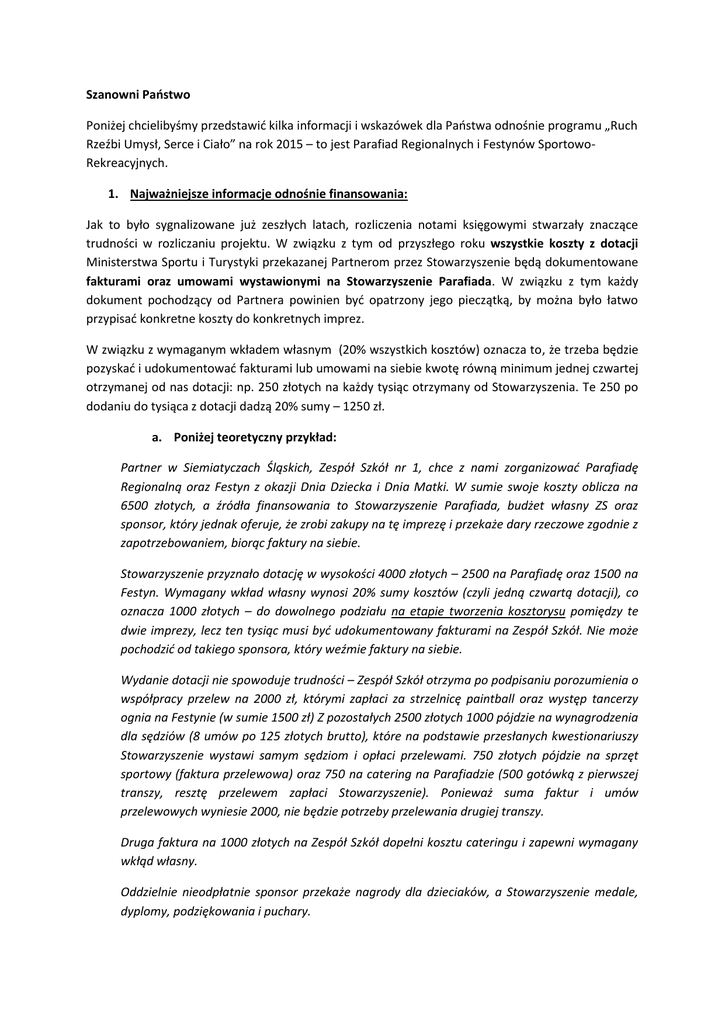 Szanowni Państwo Poniżej chcielibyśmy przedstawić kilka informacji i wskazówek dla Państwa odnośnie programu „Ruch Rzeźbi Umysł, Serce i Ciało” na rok 2015 – to jest Parafiad Regionalnych i Festynów SportowoRekreacyjnych. 1. Najważniejsze informacje odnośnie finansowania: Jak to było sygnalizowane już zeszłych latach, rozliczenia notami księgowymi stwarzały znaczące trudności w rozliczaniu projektu. W związku z tym od przyszłego roku wszystkie koszty z dotacji Ministerstwa Sportu i Turystyki przekazanej Partnerom przez Stowarzyszenie będą dokumentowane fakturami oraz umowami wystawionymi na Stowarzyszenie Parafiada. W związku z tym każdy dokument pochodzący od Partnera powinien być opatrzony jego pieczątką, by można było łatwo przypisać konkretne koszty do konkretnych imprez. W związku z wymaganym wkładem własnym (20% wszystkich kosztów) oznacza to, że trzeba będzie pozyskać i udokumentować fakturami lub umowami na siebie kwotę równą minimum jednej czwartej otrzymanej od nas dotacji: np. 250 złotych na każdy tysiąc otrzymany od Stowarzyszenia. Te 250 po dodaniu do tysiąca z dotacji dadzą 20% sumy – 1250 zł. a. Poniżej teoretyczny przykład: Partner w Siemiatyczach Śląskich, Zespół Szkół nr 1, chce z nami zorganizować Parafiadę Regionalną oraz Festyn z okazji Dnia Dziecka i Dnia Matki. W sumie swoje koszty oblicza na 6500 złotych, a źródła finansowania to Stowarzyszenie Parafiada, budżet własny ZS oraz sponsor, który jednak oferuje, że zrobi zakupy na tę imprezę i przekaże dary rzeczowe zgodnie z zapotrzebowaniem, biorąc faktury na siebie. Stowarzyszenie przyznało dotację w wysokości 4000 złotych – 2500 na Parafiadę oraz 1500 na Festyn. Wymagany wkład własny wynosi 20% sumy kosztów (czyli jedną czwartą dotacji), co oznacza 1000 złotych – do dowolnego podziału na etapie tworzenia kosztorysu pomiędzy te dwie imprezy, lecz ten tysiąc musi być udokumentowany fakturami na Zespół Szkół. Nie może pochodzić od takiego sponsora, który weźmie faktury na siebie. Wydanie dotacji nie spowoduje trudności – Zespół Szkół otrzyma po podpisaniu porozumienia o współpracy przelew na 2000 zł, którymi zapłaci za strzelnicę paintball oraz występ tancerzy ognia na Festynie (w sumie 1500 zł) Z pozostałych 2500 złotych 1000 pójdzie na wynagrodzenia dla sędziów (8 umów po 125 złotych brutto), które na podstawie przesłanych kwestionariuszy Stowarzyszenie wystawi samym sędziom i opłaci przelewami. 750 złotych pójdzie na sprzęt sportowy (faktura przelewowa) oraz 750 na catering na Parafiadzie (500 gotówką z pierwszej transzy, resztę przelewem zapłaci Stowarzyszenie). Ponieważ suma faktur i umów przelewowych wyniesie 2000, nie będzie potrzeby przelewania drugiej transzy. Druga faktura na 1000 złotych na Zespół Szkół dopełni kosztu cateringu i zapewni wymagany wkłąd własny. Oddzielnie nieodpłatnie sponsor przekaże nagrody dla dzieciaków, a Stowarzyszenie medale, dyplomy, podziękowania i puchary. Rozlicznie tych imprez przekazane do Stowarzyszenia w części finansowej uwzględniać więc będzie tylko 5000 złotych (4000 z dotacji i 1000 wkładu własnego), a pozostały 1500 i wszelkie dary pochodzące od sponsora można ująć tylko w sprawozdaniu merytorycznym. 2. Faktury: Koszty własne Partnerów powinny być dokumentowane fakturami własnymi Partnerów (tj. wystawionymi na Partnera, a nie na inny podmiot). Dotyczy to kwoty minimum 20% sumy kosztów znanej z poprzednich lat. Na każdej takiej fakturze powinien znaleźć się opis informujący, że te koszty zostały poniesione w związku z organizacją konkretnej imprezy wraz z jej nazwą i datą. a. Poniżej przykład opisu: Wymieniony drugostronnie sprzęt sportowy został zakupiony ze środków własnych w kwocie 150 zł na potrzeby realizacji Festynu Sportowo-Rekreacyjnego z okazji Dnia Dziecka w Siemiatyczach Śląskich w dniu 1.06.2015 w ramach programu „Ruch Rzeźbi Umysł, Serce i Ciało 2015” realizowanego we współpracy ze Stowarzyszeniem Parafiada im. św. Józefa Kalasancjusza w Warszawie. Tak opisane faktury po przesłaniu nam ich zestawienia będziemy mogli uznać (Nota Uznaniowa wystawiona przez Stowarzyszenie Parafiada Partnerowi Regionalnemu) i wykazać w Ministerstwie jako wkład własny. 3. Zasady przekazywania dotacji Jeśli chodzi o koszty z dotacji, z każdym z partnerów będziemy ustalać procedury przekazania środków stosownie do potrzeb. Wchodzą tu w grę zarówno faktury przelewowe płacone przez Stowarzyszenie, jak i transze zaliczek do płacenia gotówką na miejscu. W podstawowym założeniu każdemu z Partnerów po podpisaniu Porozumienia przekażemy na konto połowę przyznanej dotacji, a resztę rozliczymy na podstawie indywidualnych ustaleń płacąc za faktury przelewowe lub zwracając za opłacone faktury gotówkowe drugą transzą. W przypadku przekroczenia kwoty dotacji wygenerowanymi kosztami (mowa o sumie kwot faktur na Stowarzyszenie) Partnerzy będą zobowiązani do wpłacenia darowizny na kwotę, o którą przekroczyli dotację, by pokryć wygenerowane dla Stowarzyszenia koszty. Kwota przekroczenia będzie się liczyć do wkładu własnego Partnera pod warunkiem przekazania darowizny. 4. Umowy z sędziami, obsługą techniczną, instruktorską i medyczną Oddzielną kwestią są dotowane umowy z sędziami, obsługą techniczną, instruktorską i medyczną. Jeżeli nie mogą Państwo uzyskać na takie usługi faktury wystawionej na Stowarzyszenie, sami wystawimy umowy dla konkretnych osób. Umowy takie muszą być wystawione najpóźniej w dniu imprezy, w związku z tym dla każda osoba powinna wypełnić kwestionariusz osobowy według wzoru zamieszczonego na stronie www.parafiada.pl. Wypełnione kwestionariusze należy przesłać do Stowarzyszenia najpóźniej 10 dni przed imprezą drogą mailową (skany) lub listem poleconym. Proszę zwrócić uwagę, by w każ