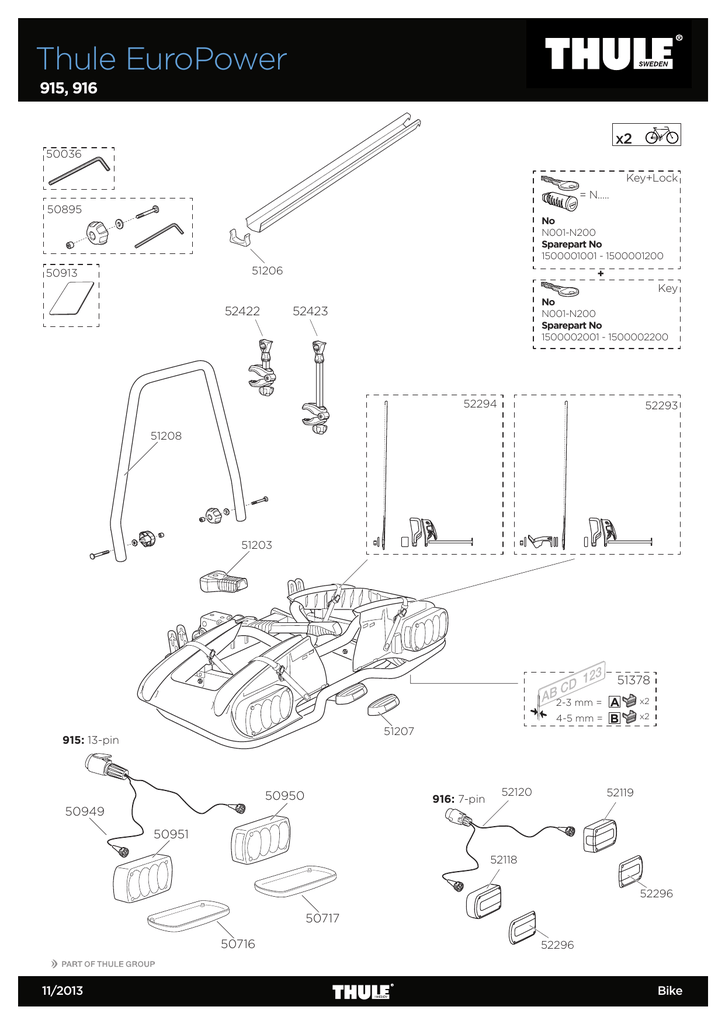 Thule EuroPower 915, 916 x2 50036 Key+Lock = N..... 50895 No N001-N200 Sparepart No 1500001001 - 1500001200 51206 50913 + Key 52422 No N001-N200 Sparepart No 1500002001 - 1500002200 52423 52294 52293 51208 51203 51378 2-3 mm = 4-5 mm = 51207 915: 13-pin 50950 916: 7-pin 50949 52120 A B x2 x2 52119 50951 52118 52296 50717 50716 11/2013 52296 Bike