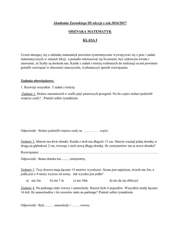 Akademia Zaruskiego III edycja r.szk.2016/2017 ODZNAKA MATEMATYK KLASA I Uczeń starający się o odznakę matematyk powinien systematycznie wywiązywać się z prac i zadań matematycznych w ramach lekcji a ponadto interesować się liczeniem, być ciekawym świata i zauważać, że liczby są dookoła nas. Każde z zadań z treścią wybranych do realizacji uczeń powinien potrafić rozwiązać w obecności nauczyciela, wytłumaczyć sposób rozwiązania. Zadania obowiązkowe: 1. Rozwiąż wszystkie 5 zadań z treścią: Zadanie 1. Stolarz zamontował w szafie pięć pionowych przegród. Na ile części stolarz podzielił wnętrze szafy? . Pomóż sobie rysunkiem. Odpowiedź: Stolarz podzielił wnętrze szafy na …..……… części. Zadanie 2. Marcin ma dwie słomki. Każda z nich ma długość 13 cm. Marcin wsunął jedną słomkę w drugą na głębokość 2 cm, tworząc z nich nową długą słomkę. Ile centymetrów ma ta nowa słomka? Rozwiązanie: …………………………………………………………………………………………… Odpowiedź: Nowa słomka ma ………. centymetry. Zadanie 3. Trzy drzewa mają łącznie 15 metrów wysokości. Sosna jest najniższa, świerk ma 5m, a jodła jest o 4 metry wyższa od sosny. Jak wysoka jest jodła? a) ma 3m b) ma 7 m c) ma 10m d) nie da się obliczyć Zadanie 4. Na parkingu stały rowery i samochody. Razem było 6 pojazdów. Wszystkie miały łącznie 16 kół. Ile samochodów i ile rowerów stało na parkingu? Pomóż sobie rysunkiem. Odpowiedź: Były …..… samochody i …….. rowery. Zadanie 5. Brat i siostra mają razem 9 lat. Ile będą mieli razem lat za trzy lata? Rozwiązanie: ……………………………………………………………………………………………….. Odpowiedź: Razem za trzy lata będą mieli…….. lat. 2. Jakie są najmniejsze, największe, najwolniejsze, najszybsze zwierzęta świata? Wykonaj plakat i przedstaw swoją pracę w klasie. 3. Odwiedź Centrum Nauki Kopernik - opowiedz w klasie co tam Ciebie zainteresowało i dlaczego? 4. Przedstaw swoją drogę do szkoły. Ile kroków musisz zrobić aby dojść do szkoły? Jeśli podróżujesz w inny sposób jak daleko jest szkoła od Twojego domu, ile czasu zajmuje Ci droga. Wykonaj rysunek jak podróżujesz do szkoły i narysuj na nim co można policzyć w drodze do szkoły /np. 20 drzew/ 5. Ciekawostki słynnych obiektów, budowli. Wybierz dowolny ciekawy wg Ciebie obiekt np. stadion sportowy, zabytek albo swój dom. Narysuj go i dopisz kilka ciekawostek liczbowych np. ile jest tam pięter? Ile schodów? Ile ma lat? itp. Przedstaw swój rysunek w klasie. Wytłumacz co oznaczają liczby, które zamieściłeś na rysunku. Zadania do wyboru: 1. Rozwiąż dwa poniższe zadania: Zadanie 1. Doktor Ojboli zapisał choremu Marudzie 3 pigułki i zalecił, aby zażywał je po jednej, co 7 minut. Po ilu minutach od zażycia pierwszej pigułki Maruda zażyje ostatnią? Pomóż sobie rysunkiem. Odpowiedź: Ostatnią pigułkę zażyje po ………….. minutach od zażycia pierwszej. Zadanie 2. Papa Smerf znalazł książkę, w której brakowało pewnej liczby kartek. Kiedy ją otworzył, z lewej strony zobaczył numer 24, a z prawej numer 29. Ile kartek brakowało pomiędzy tymi stronami? Pomóż sobie rysunkiem. Odpowiedź: Brakowało ……………. kartek. 2. Rozwiąż dwa poniższe zadania. Zadanie 1.Podczas meczu koszykówki Paweł trafił do kosza 5 razy, Leszek miał 2 razy więcej trafień niż Paweł, a Zbyszek o 3 mniej niż Paweł i Leszek razem. Ile razy trafił do kosza Leszek, a ile Zbyszek? Rozwiązanie: Paweł-………………………….. Leszek- …………………………. Zbyszek- ……………………….. Odpowiedź: Leszek trafił do kosza ……… razy, a Zbyszek …….razy. Zadanie 2. W sadzie rosło 11 jabłoni w jednym rzędzie. Między każdą jabłonią ustawiono po 2 ule. Napisz, ile uli razem ustawiono między jabłoniami. Pomóż sobie rysunkiem. Odpowiedź: Razem ustawiono …..……… uli. 3. Rozwiąż zadanie z treścią oraz zrób własną listę zakupów rzeczy które są potrzebne w piórniku. Sprawdź z rodzicami w sklepie ile kosztują 3 wybrane produkty z Twojej listy. Czy wszystkie produkty z tej samej kategorii mają taką samą cenę? Dlaczego? Jacek miał kupić 5 zeszytów, które kosztują po 1 zł 60 gr, 3 ołówki po 1 zł 20 gr i gumkę za 3 zł 50 gr. Dostał od mamy na zakupy 20 zł, ale w sklepie okazało się, że z dziurawej kieszeni wypadła mu gdzieś pięciozłotówka. Czy wystarczy mu pieniędzy na zakupy? Rozwiązanie:……………………………………………………………………………………… Odpowiedź: Jackowi ……………………………………………. pieniędzy na zakupy. 4. Wymyśl dla klasy własne zadanie z treścią. Zaproponuj klasie aby rozwiązała Twoje zadanie. 5. Magiczny kwadrat liczbowy. W puste kratki wpisz takie liczby, aby suma liczb w każdym rzędzie pionowym, poziomym i na obu przekątnych wynosiła 18. 6 8 6 6. Kuba miał 21 zł. Postanowił wrzucić je do trzech skarbonek, tak aby w drugiej było dwa razy więcej pieniędzy niż w pierwszej, a w trzeciej dwa razy więcej niż w drugiej. Po ile złotych miał Kuba w każdej skarbonce? Zaprojektuj własną skarbonkę oraz narysuj to na co chciałbyś zbierać. Ile kosztuje to na co zbierasz? 7. Na spacerek ze swoimi lalkami w wózeczkach wyruszyły Agatka i Magda. Obok jechał Maciuś na hulajnodze i Łukasz na rowerze. Ile kół miały wszystkie pojazdy? Rozwiązanie: ………………………………………………………………………… Odpowiedź: Wszystkie pojazdy mają………... kół. Przygotuj plakat na którym zaprezentujesz inne pojazdy, które poruszają się na kołach. 8. Bądź pomocnikiem Pani przy rozwiązywaniu zadań matematycznych. 9. Weź udział w Pikniku Naukowym, opowiedz w klasie co podobało Ci się tam na